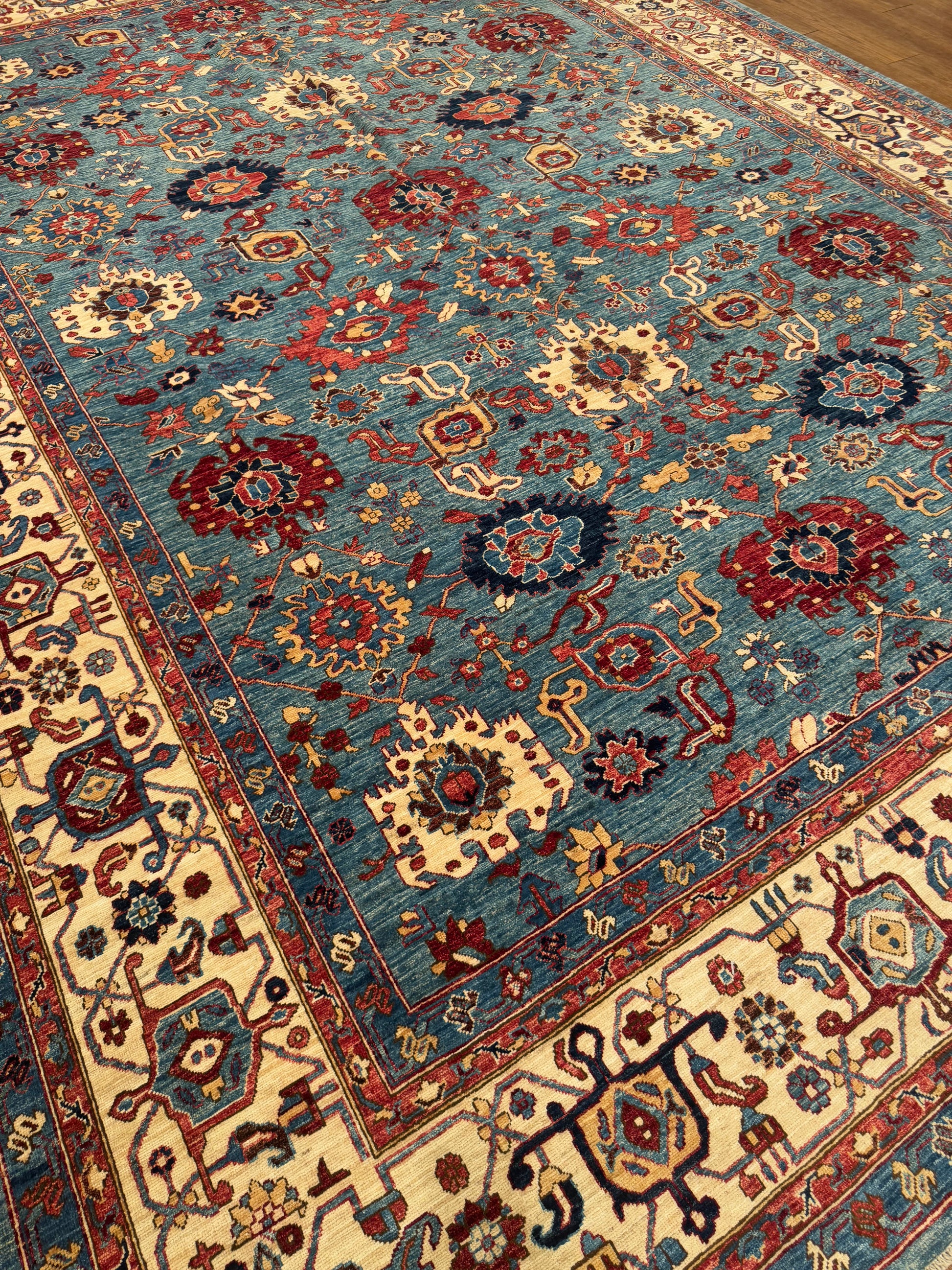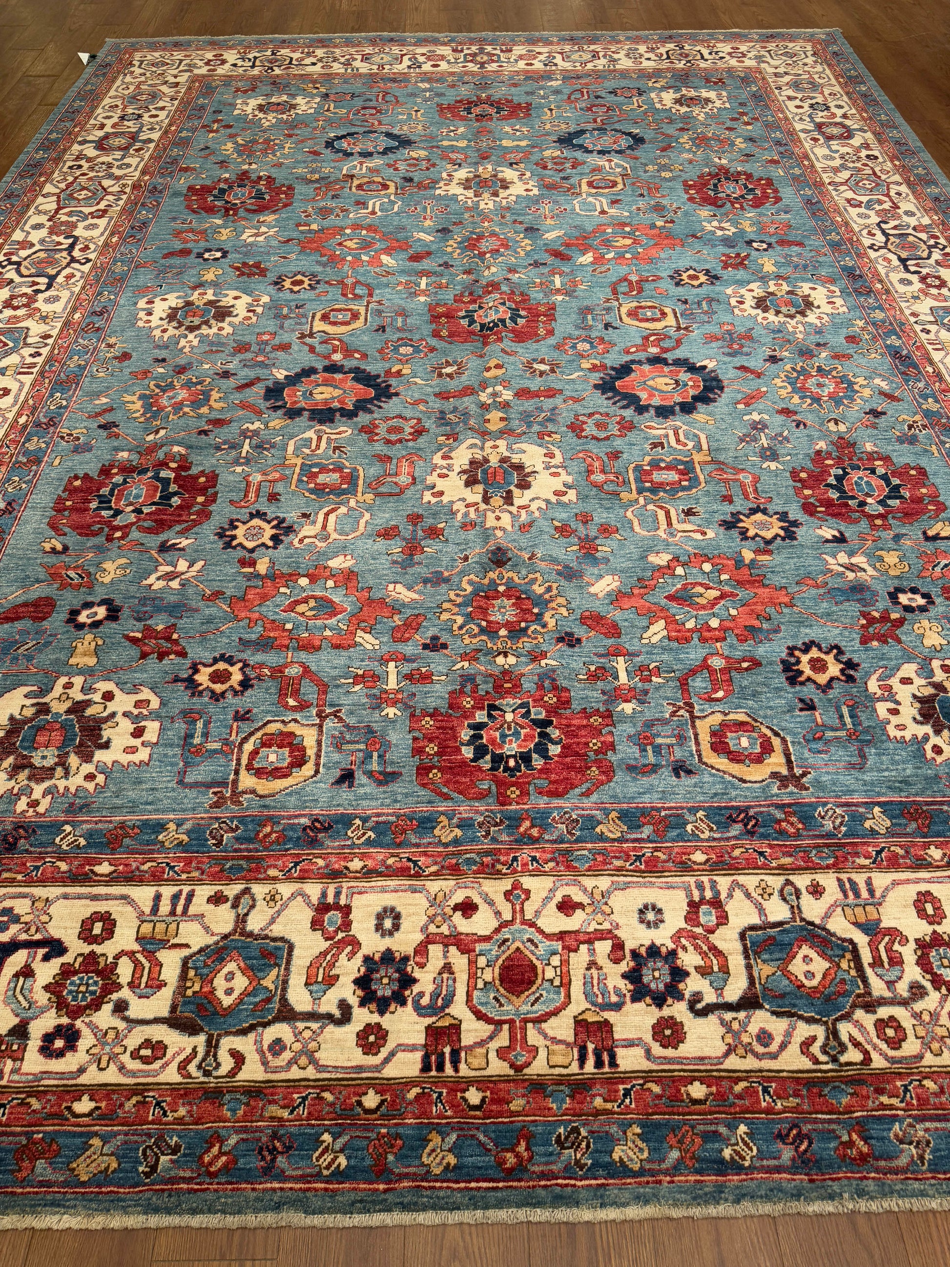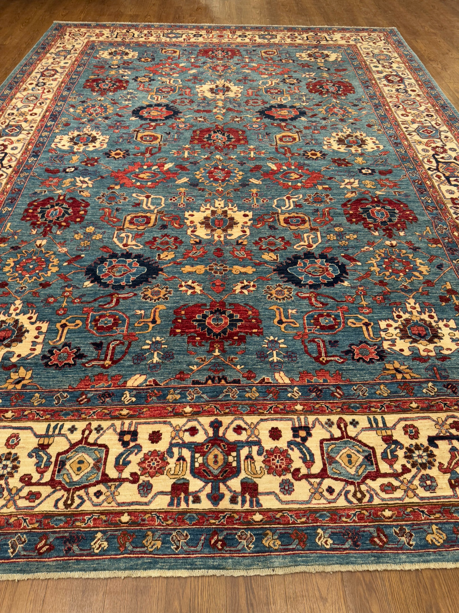 Vibrant and full of character, this handwoven piece radiates charm with its striking turquoise-blue field adorned by bold floral medallions and tribal motifs. Accents of crimson, ivory, and navy add contrast and depth, while the detailed border ties the entire composition together with balance and elegance. Its timeless palette and intricate craftsmanship make it a stunning centerpiece for both traditional and transitional interiors.