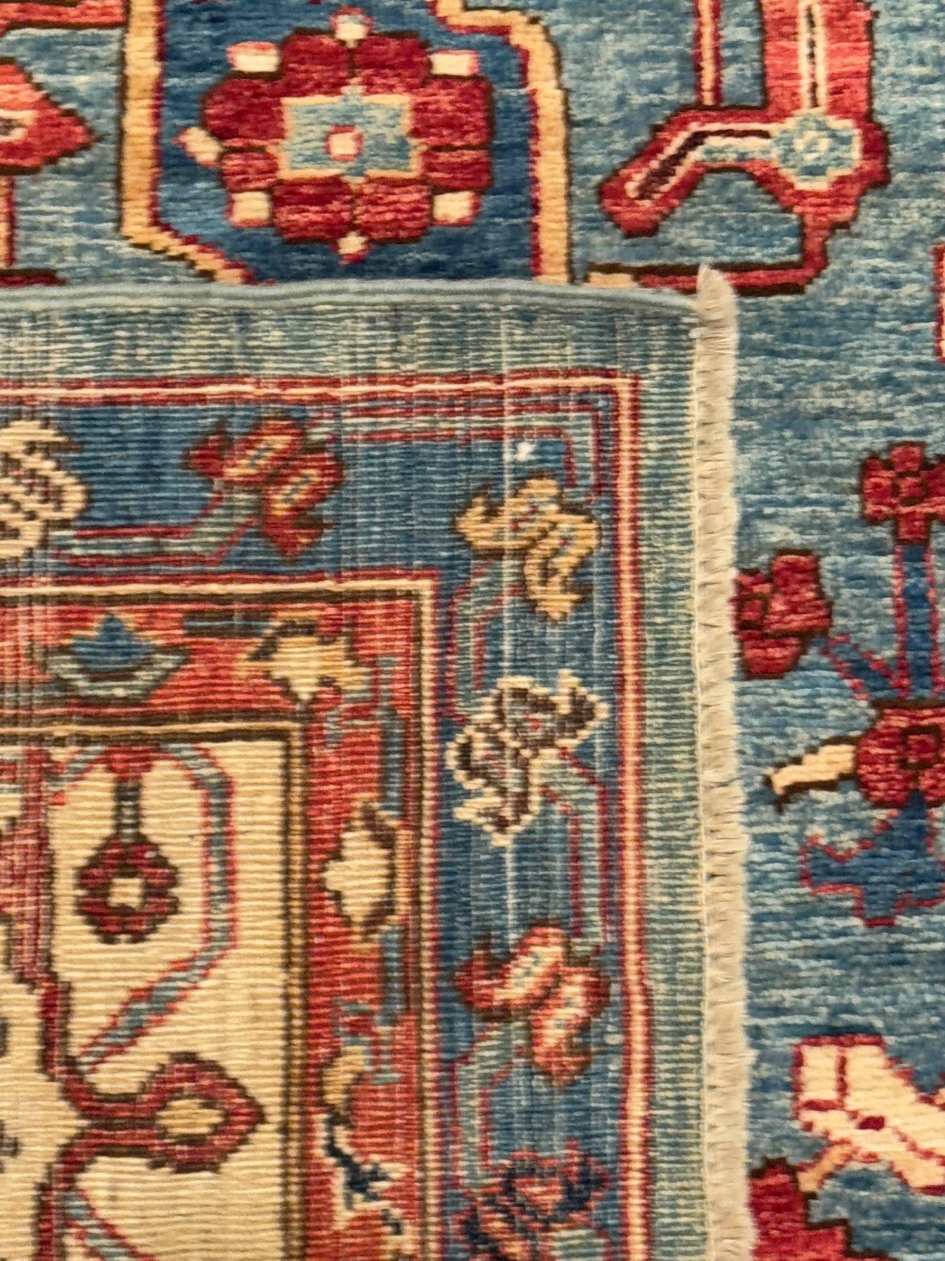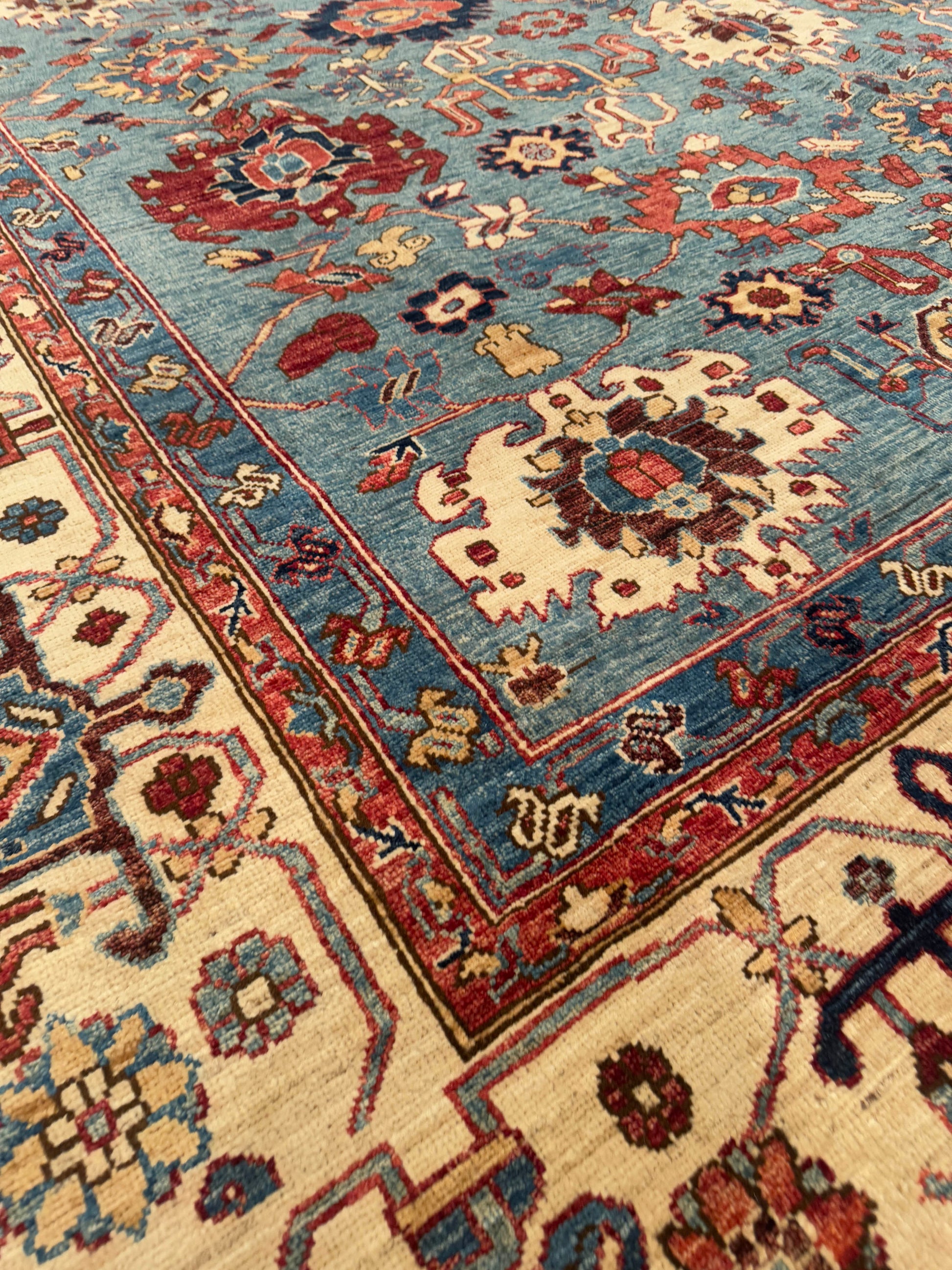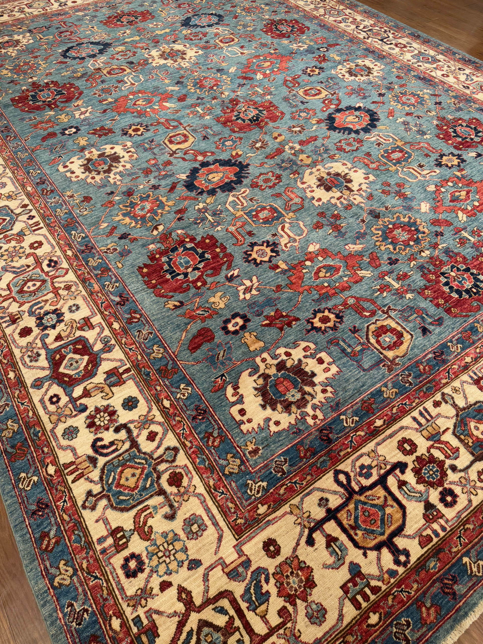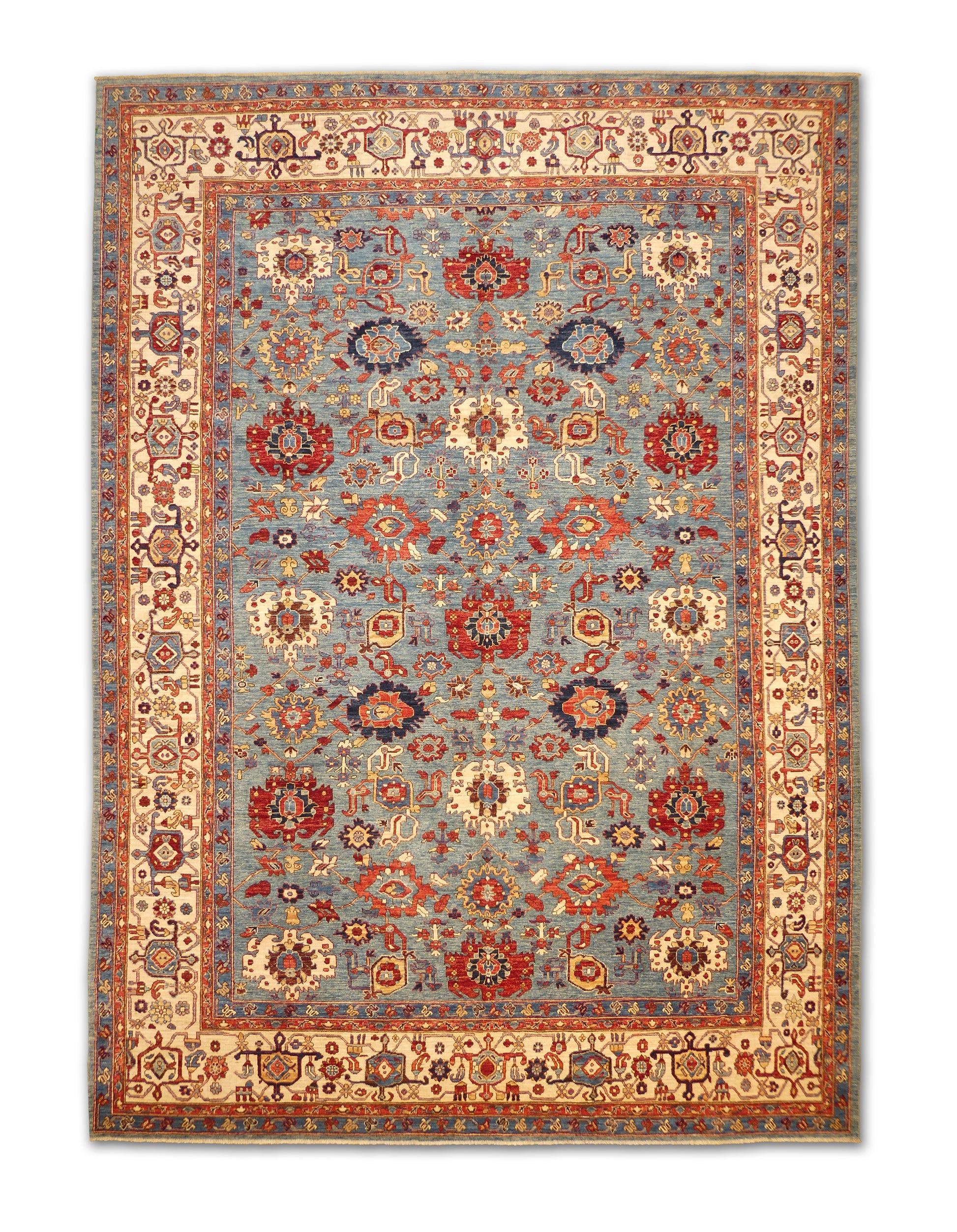 Vibrant and full of character, this handwoven piece radiates charm with its striking turquoise-blue field adorned by bold floral medallions and tribal motifs. Accents of crimson, ivory, and navy add contrast and depth, while the detailed border ties the entire composition together with balance and elegance. Its timeless palette and intricate craftsmanship make it a stunning centerpiece for both traditional and transitional interiors.