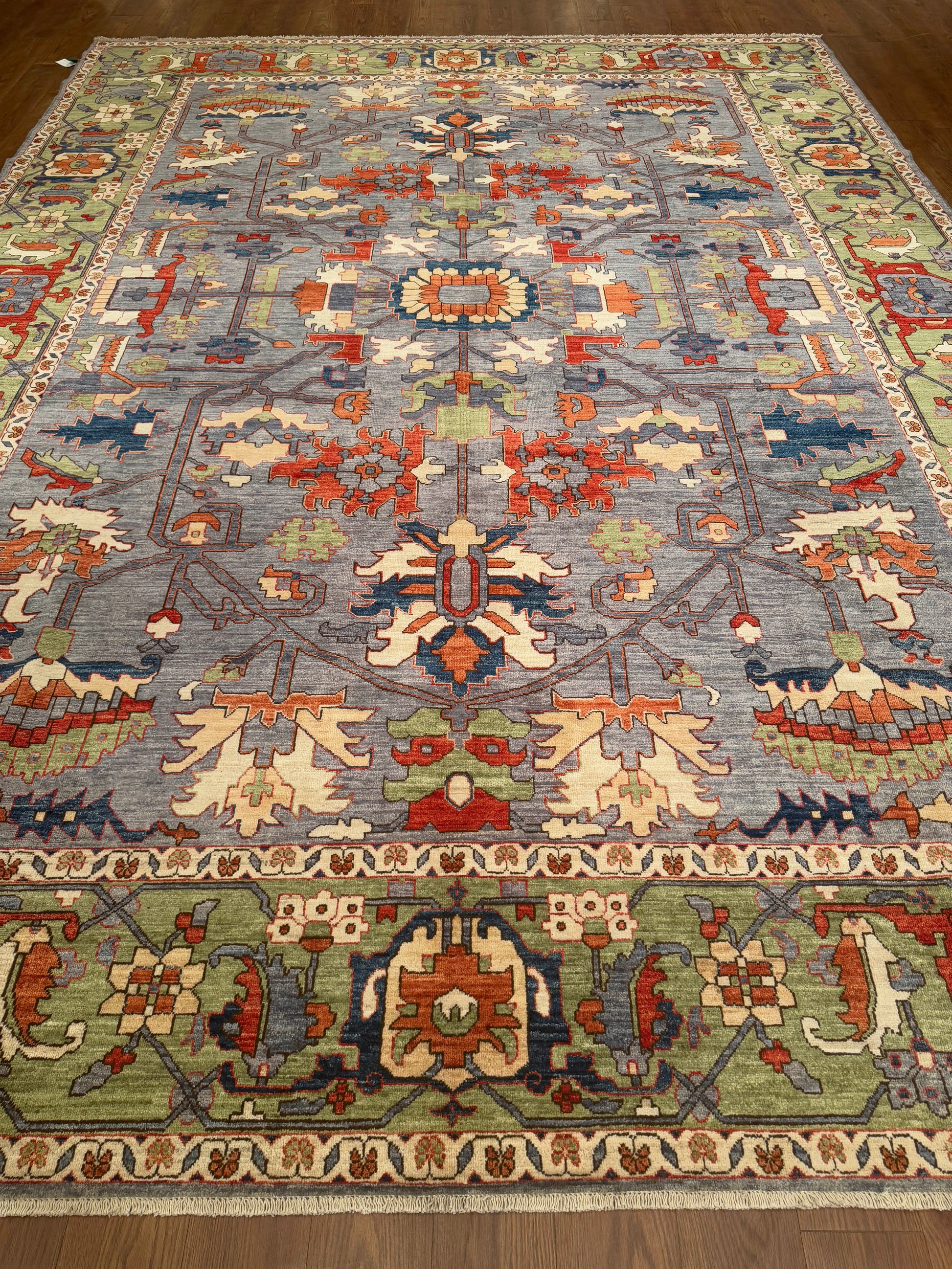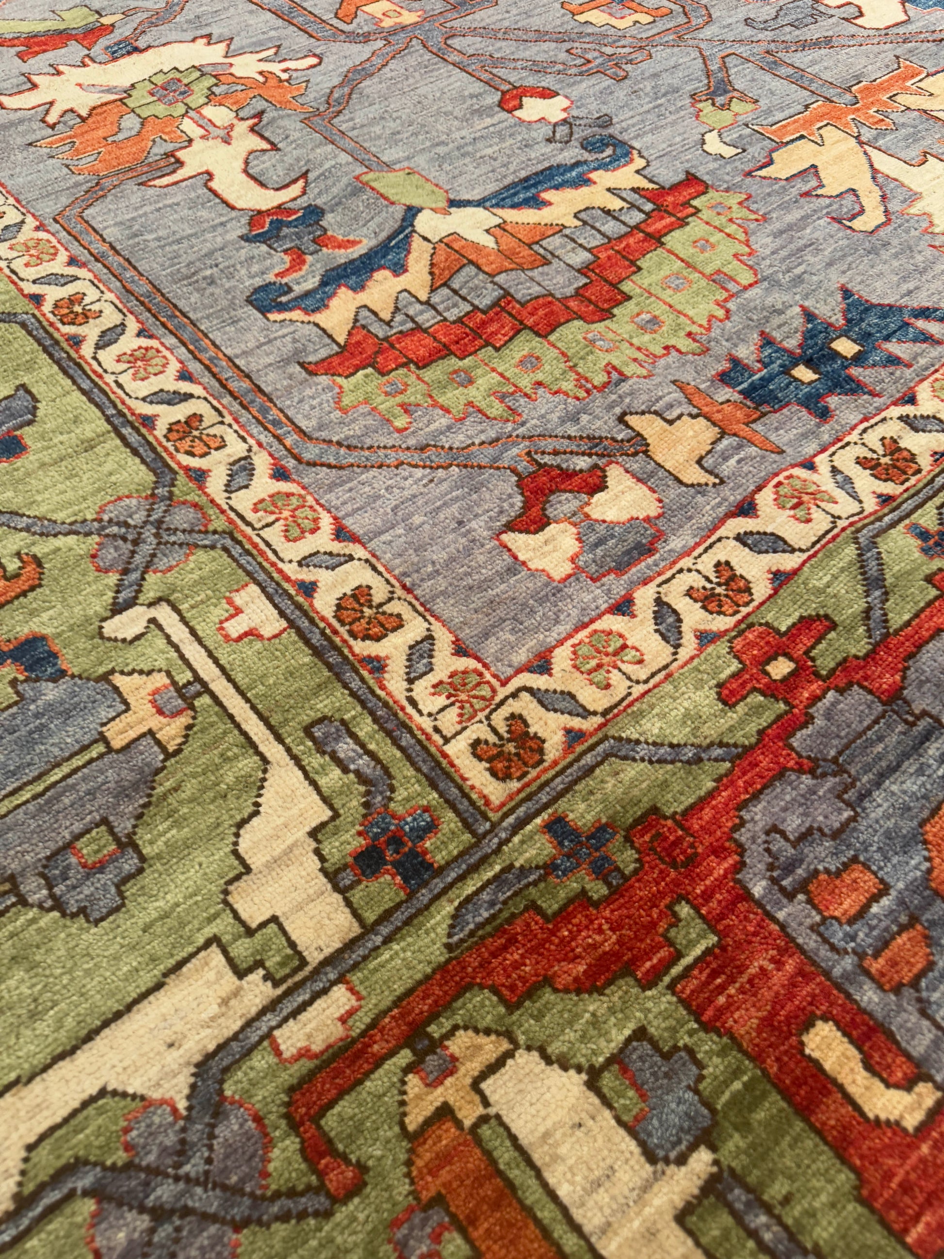 Vibrant and majestic, this handwoven rug features a striking balance of bold color and refined artistry. The soft gray-blue field is enlivened by intricate geometric and floral motifs in tones of rust, ivory, navy, and olive green. A rich green border frames the composition, enhancing its depth and character. Perfect for adding warmth and personality to a grand interior, this rug blends timeless tradition with a fresh modern spirit.