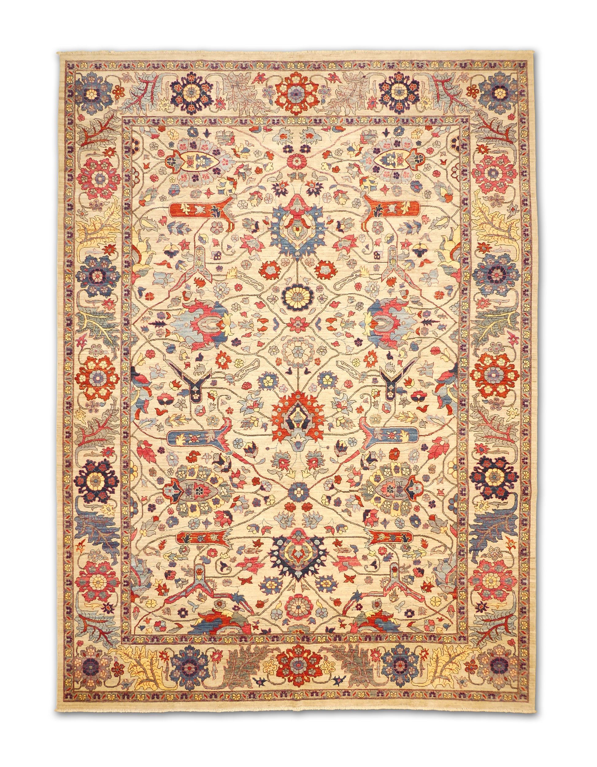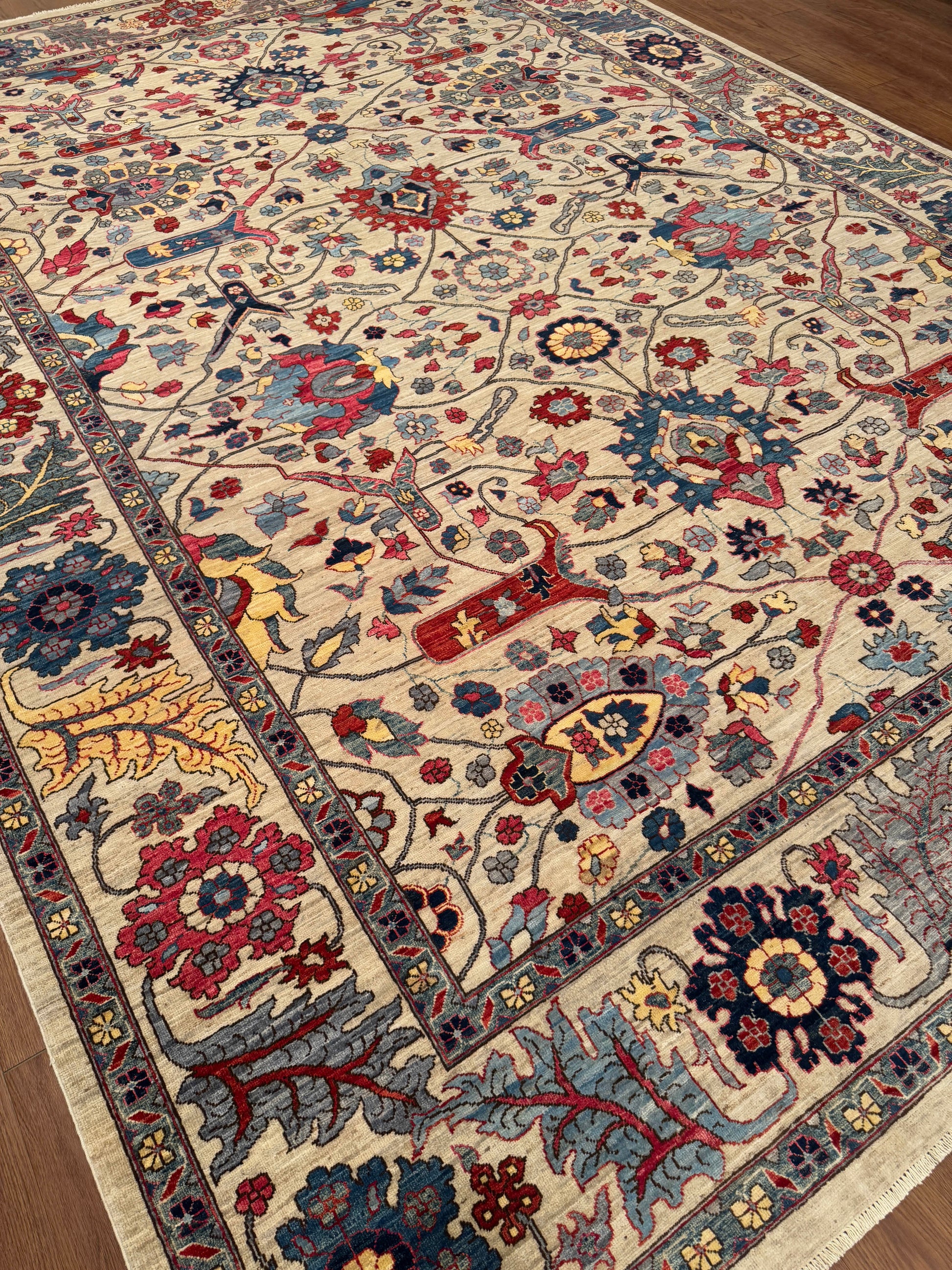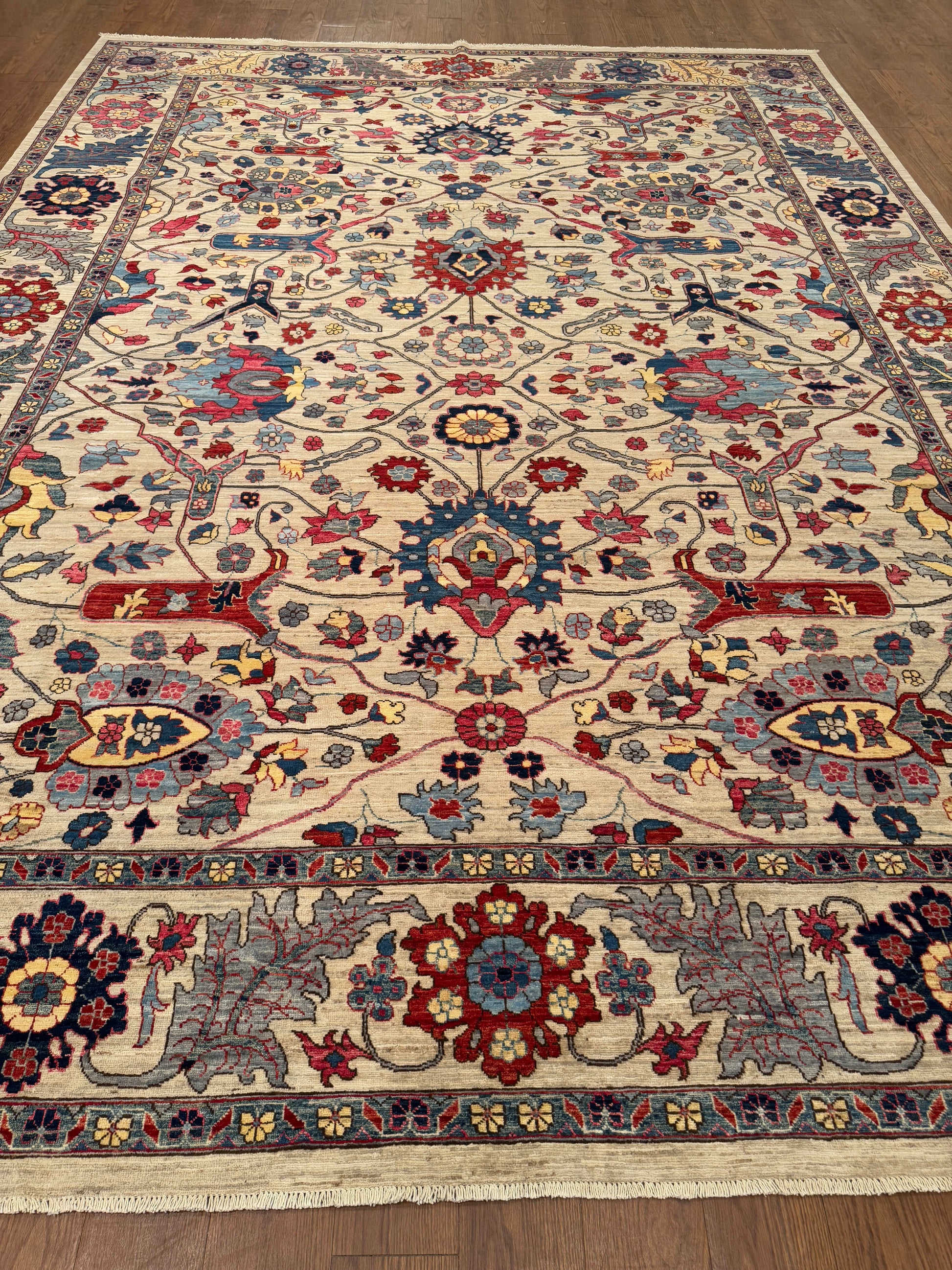 This stunning handwoven rug showcases a timeless elegance rooted in traditional artistry. Its ivory field serves as a graceful backdrop for intricate floral and vine motifs in shades of red, blue, navy, and soft teal. The balanced symmetry and refined palette lend sophistication, while the detailed border enhances its classical beauty. Perfect for brightening formal living areas or dining rooms with warmth and luxury.