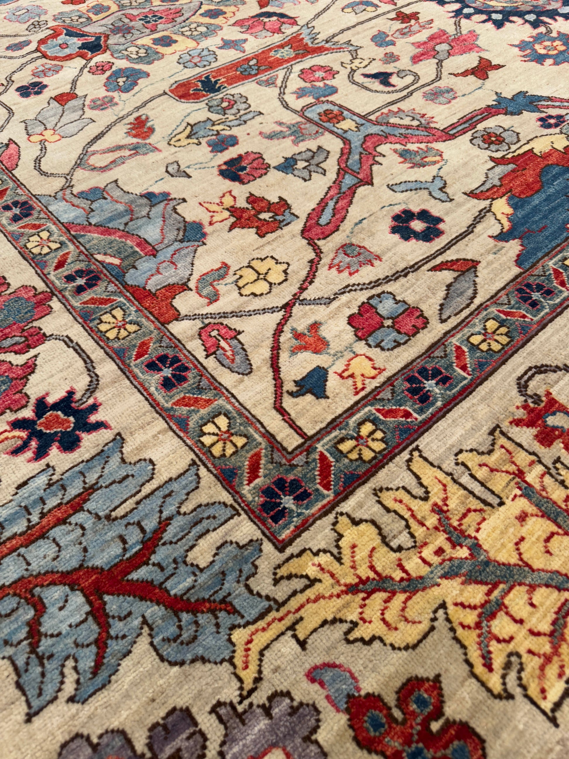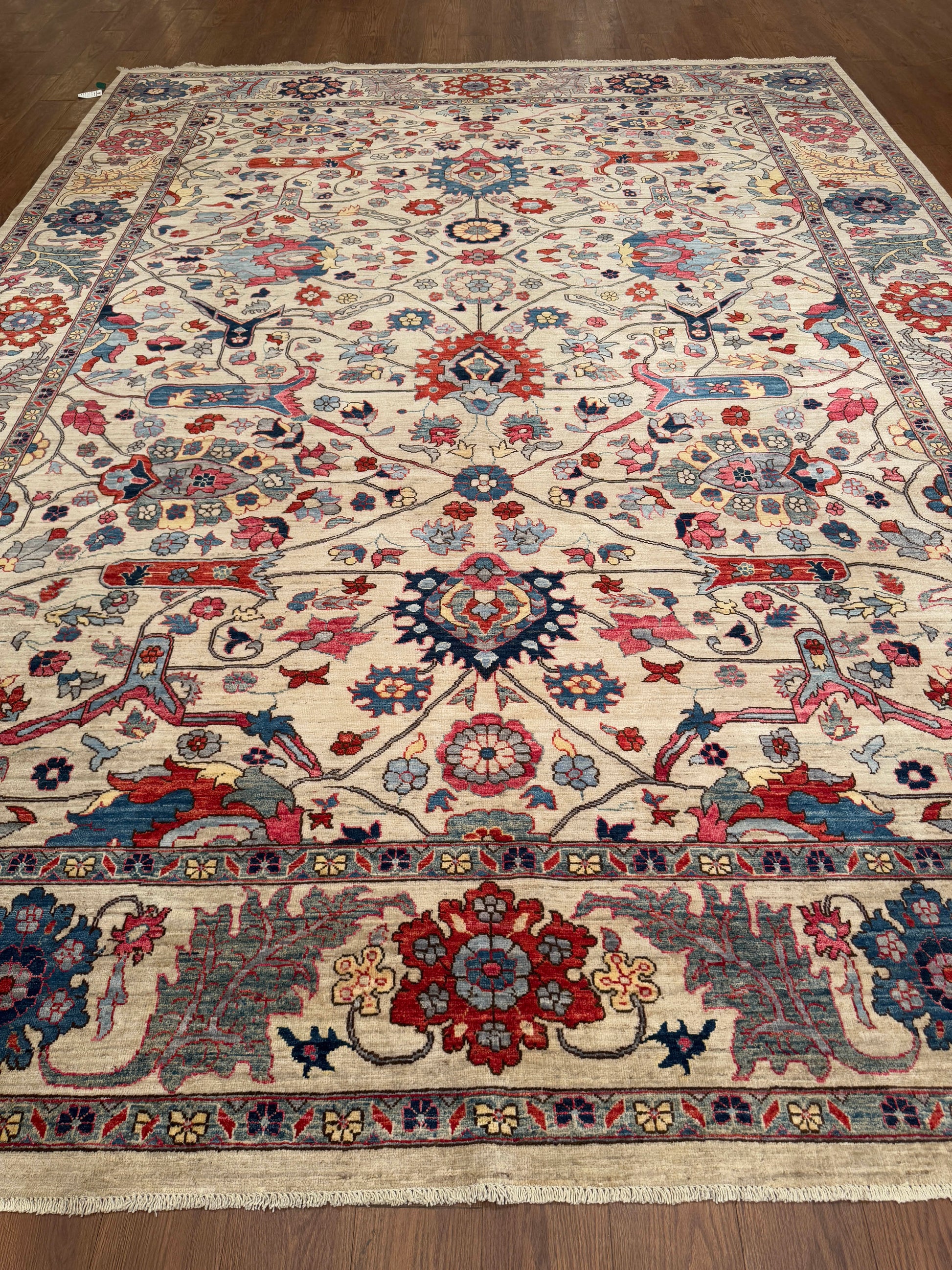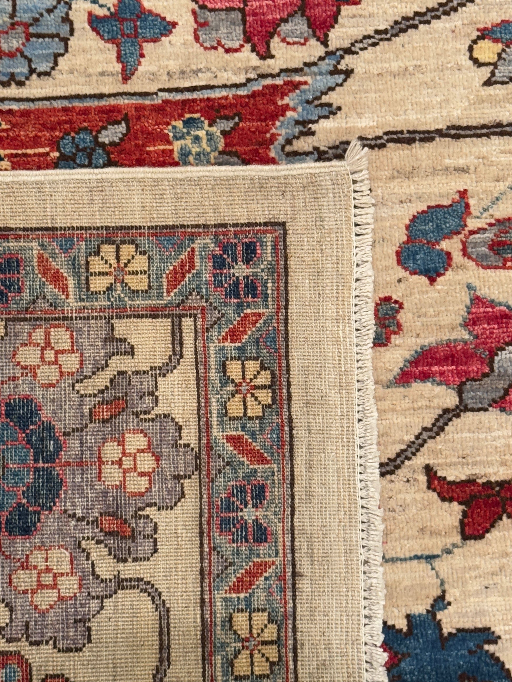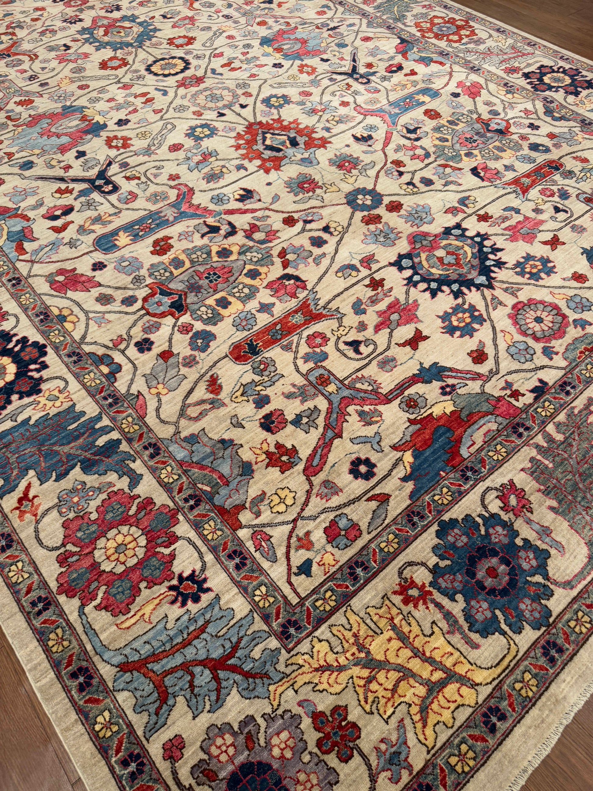 This stunning handwoven rug showcases a timeless elegance rooted in traditional artistry. Its ivory field serves as a graceful backdrop for intricate floral and vine motifs in shades of red, blue, navy, and soft teal. The balanced symmetry and refined palette lend sophistication, while the detailed border enhances its classical beauty. Perfect for brightening formal living areas or dining rooms with warmth and luxury.