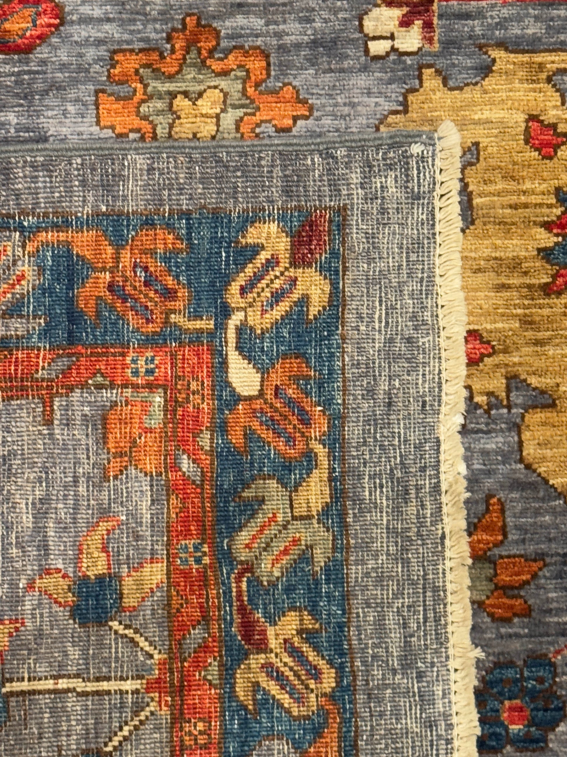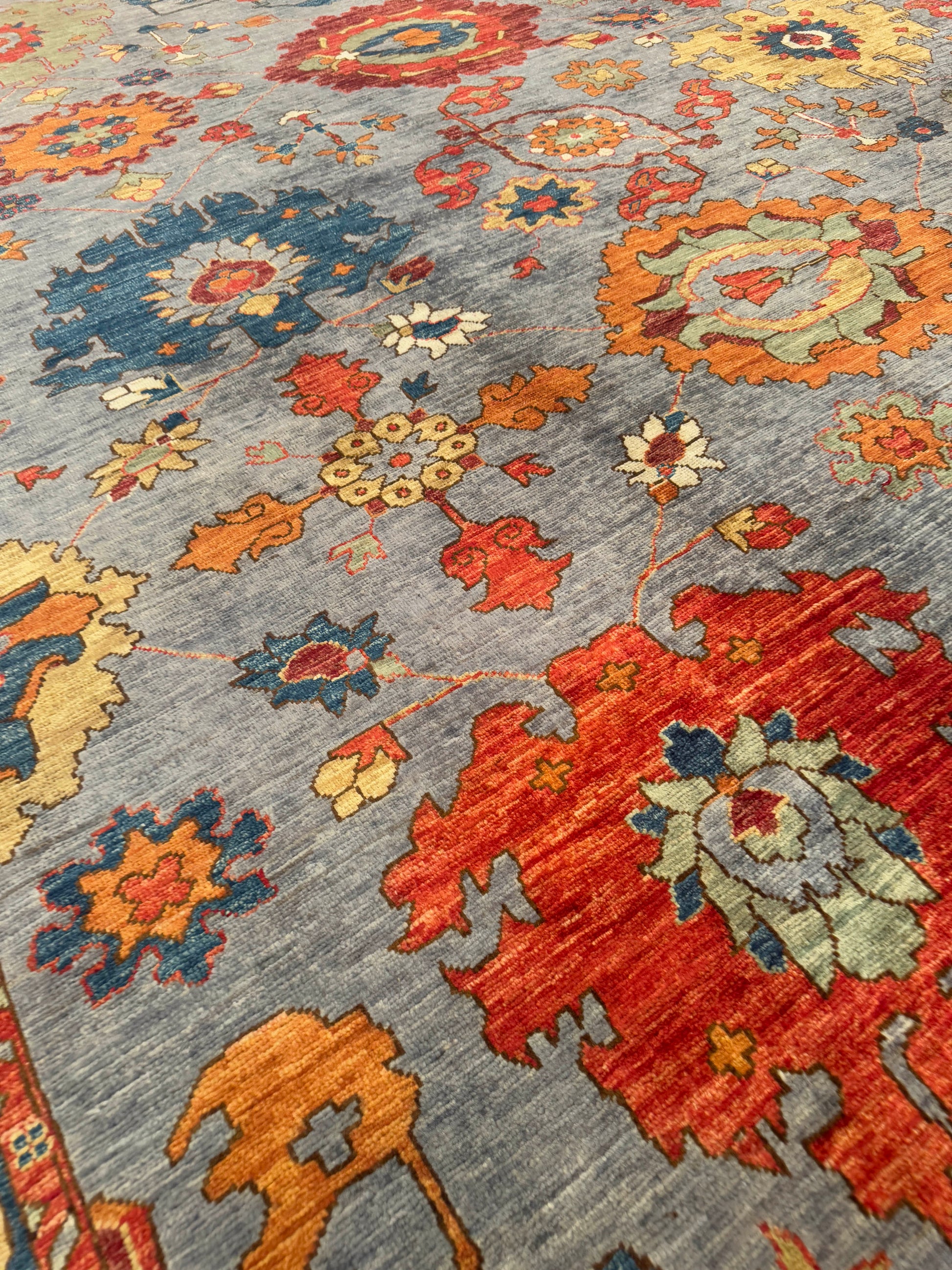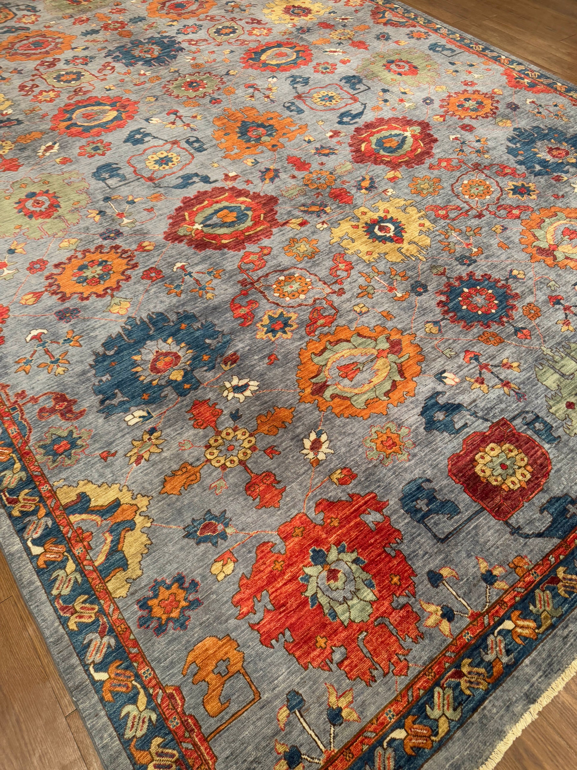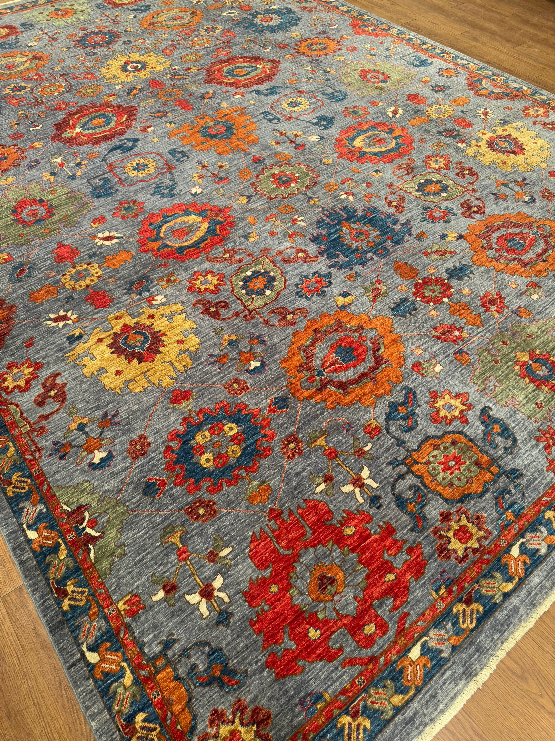 This handmade rug features an exquisite floral design with large-scale palmettes and stylized blooms woven in vibrant hues of red, gold, teal, and green on a soft gray-blue background. The intricate motifs and balanced color harmony give the piece both vibrancy and elegance. Crafted from fine wool, this rug brings artistic charm, durability, and warmth to any refined or contemporary space.