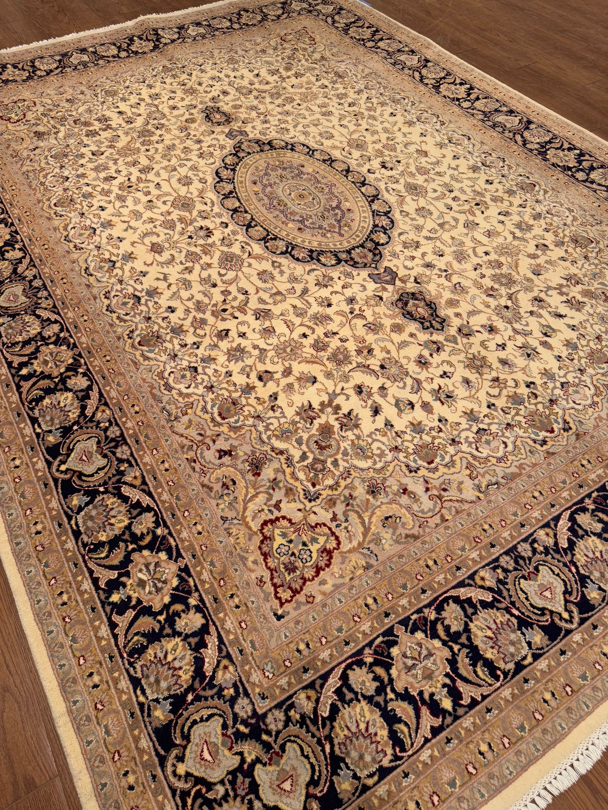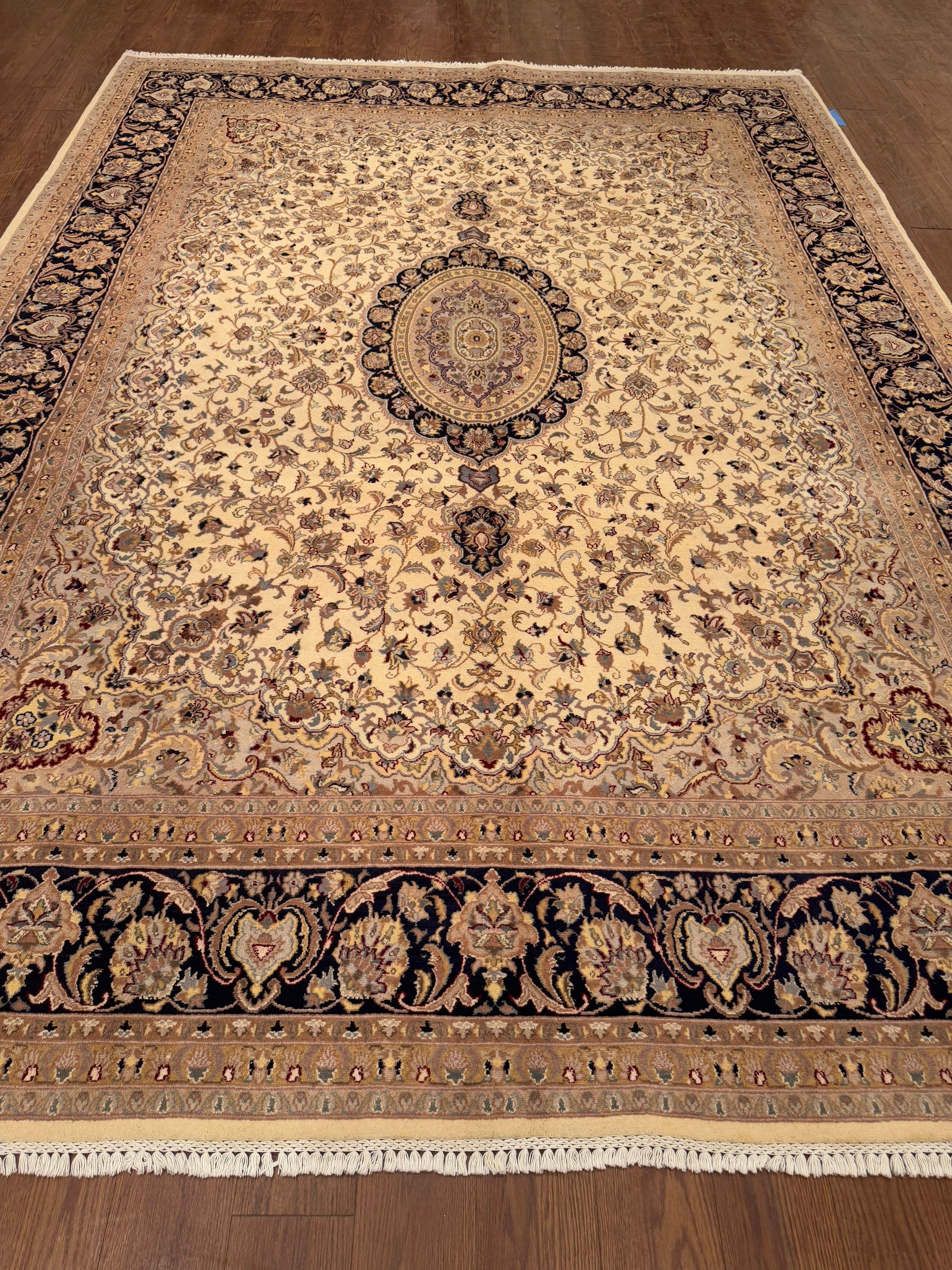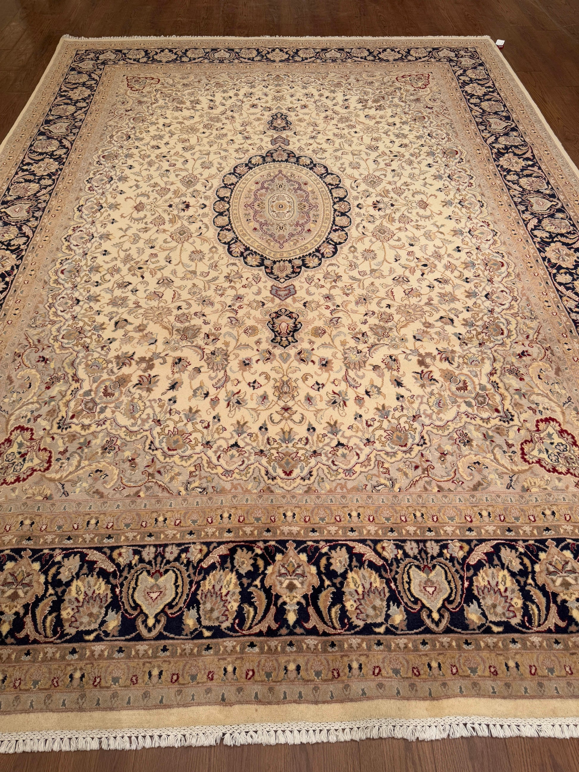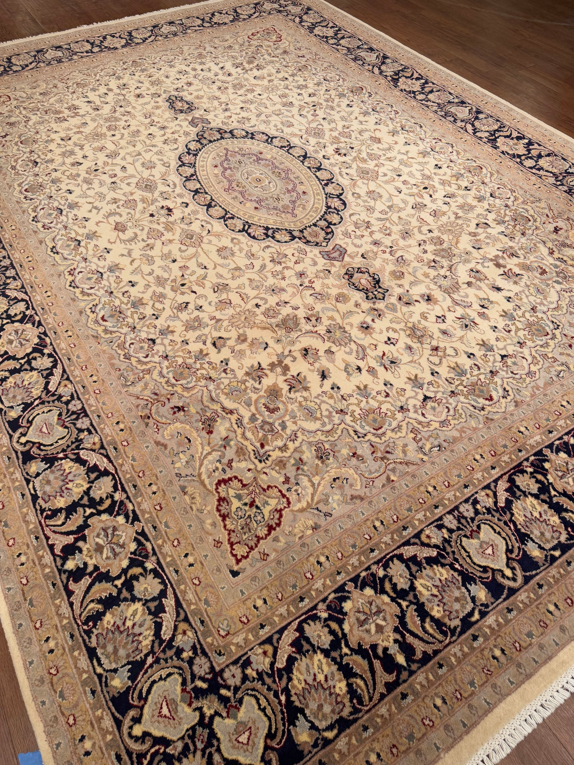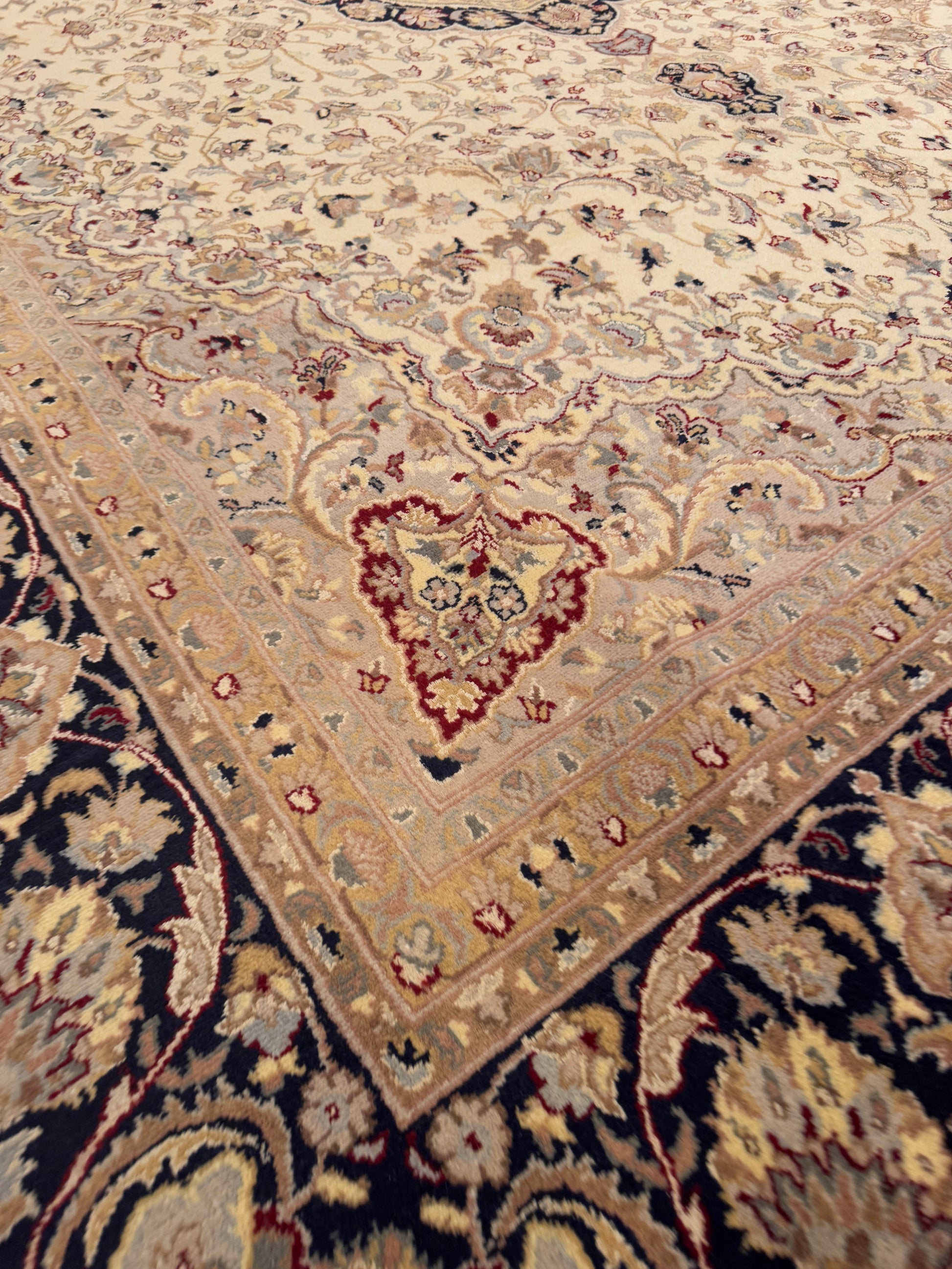 This handmade rug embodies timeless elegance with its intricate central medallion and detailed floral vine motifs gracefully spread across a soft ivory field. The navy and beige borders frame the design with refined balance, while subtle accents of burgundy and gold add depth and richness. Crafted with fine wool, this piece radiates a sense of luxury and classic sophistication, ideal for both traditional and formal interiors.