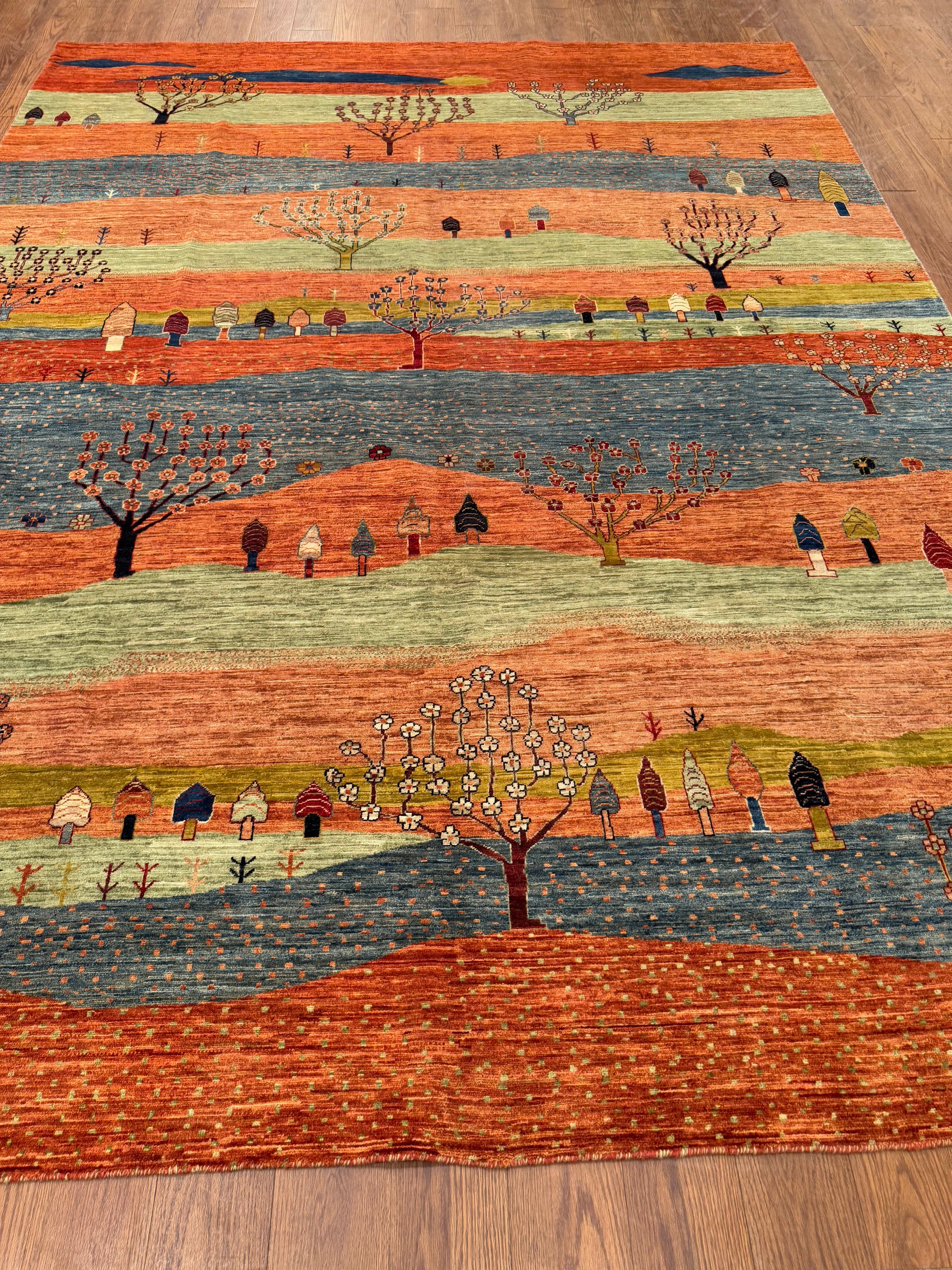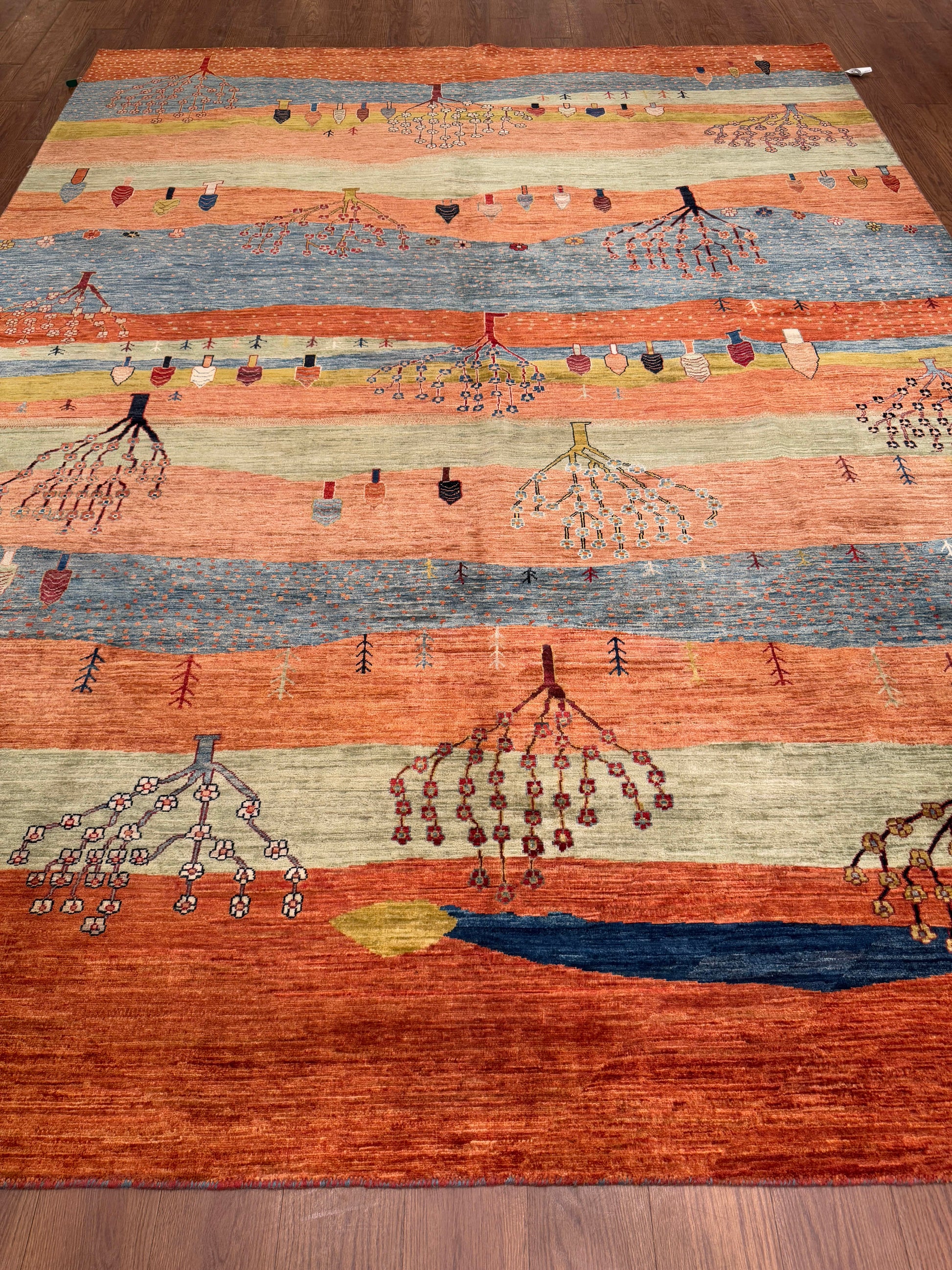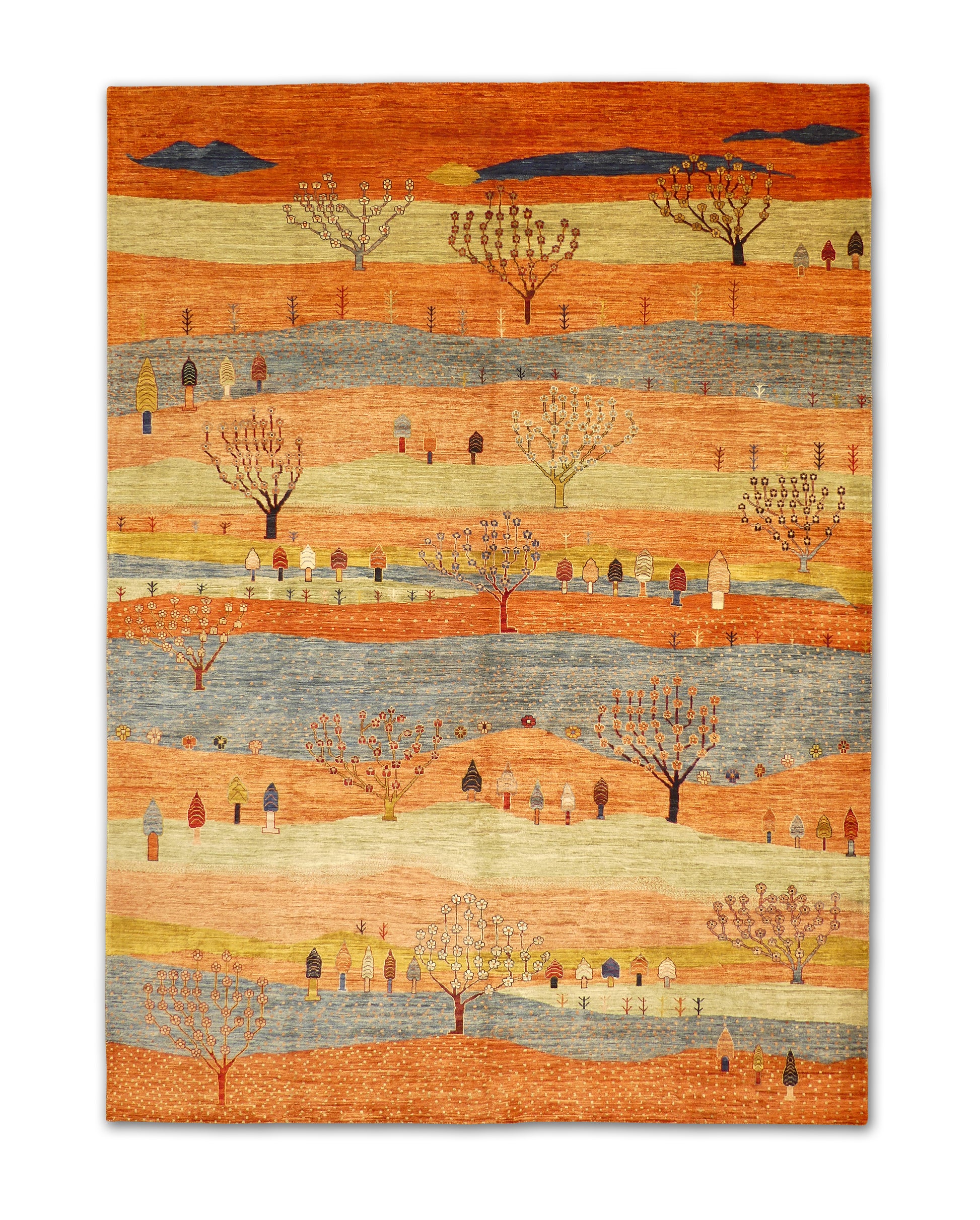 This handmade rug features a captivating landscape-inspired design with layered horizontal bands in warm, sunlit tones. The abstract tree and branch motifs appear to float across fields of terracotta, sage, blue, and gold, evoking a serene, nature-driven rhythm. Subtle variations in shading give the piece a sense of motion and depth, while the soft wool texture enhances its artisanal charm. Ideal for interiors seeking an artistic yet grounded focal point.