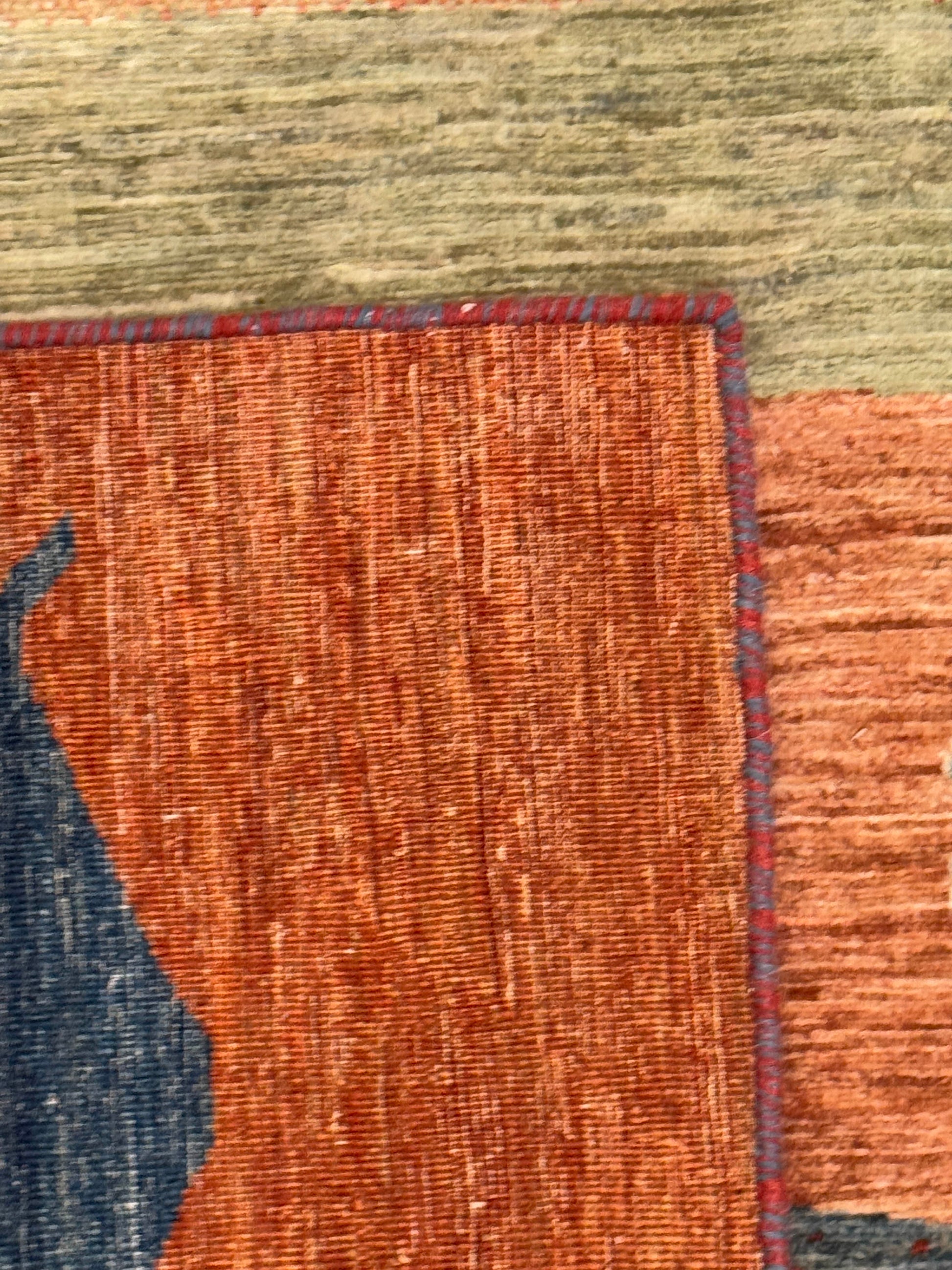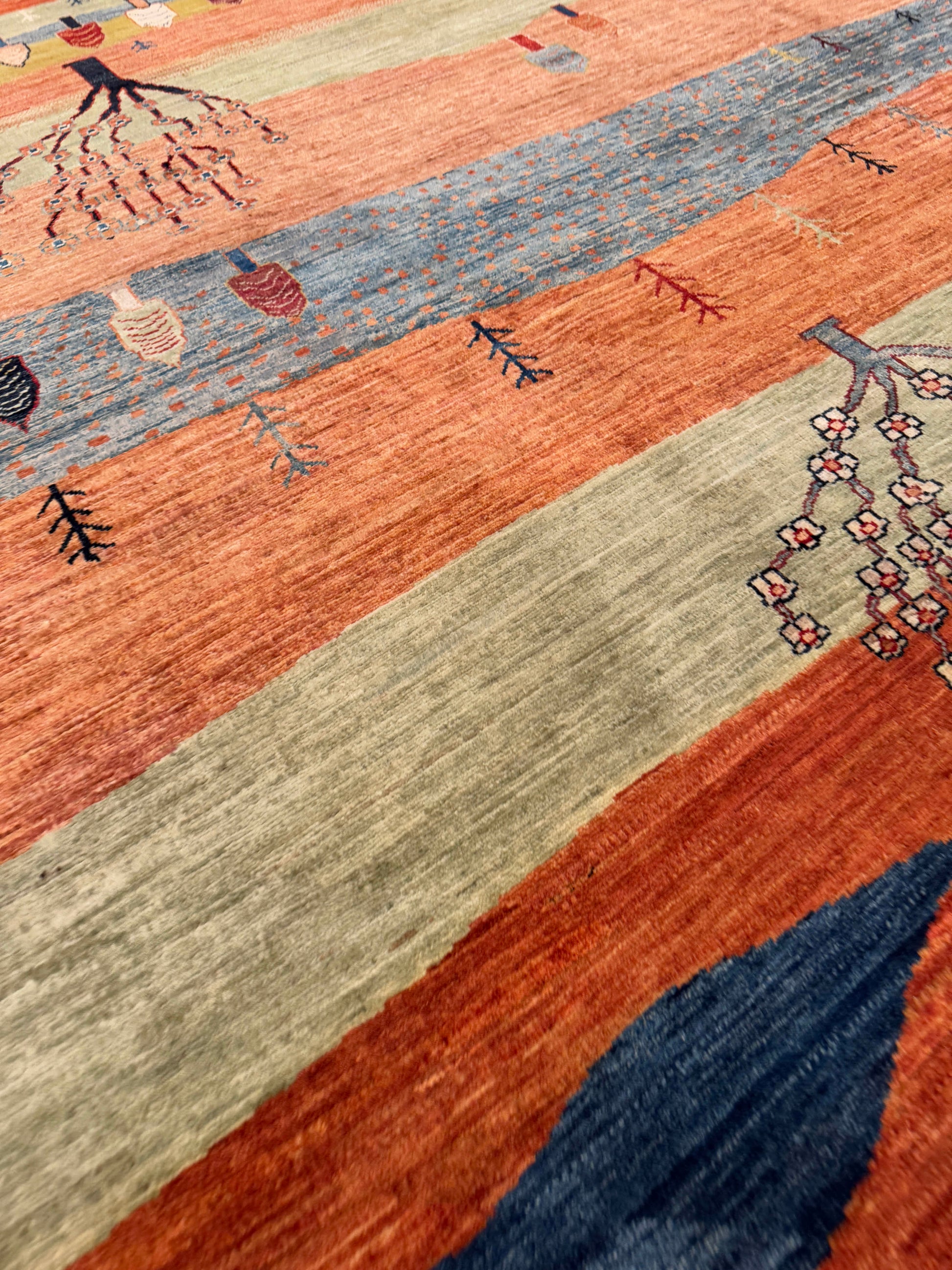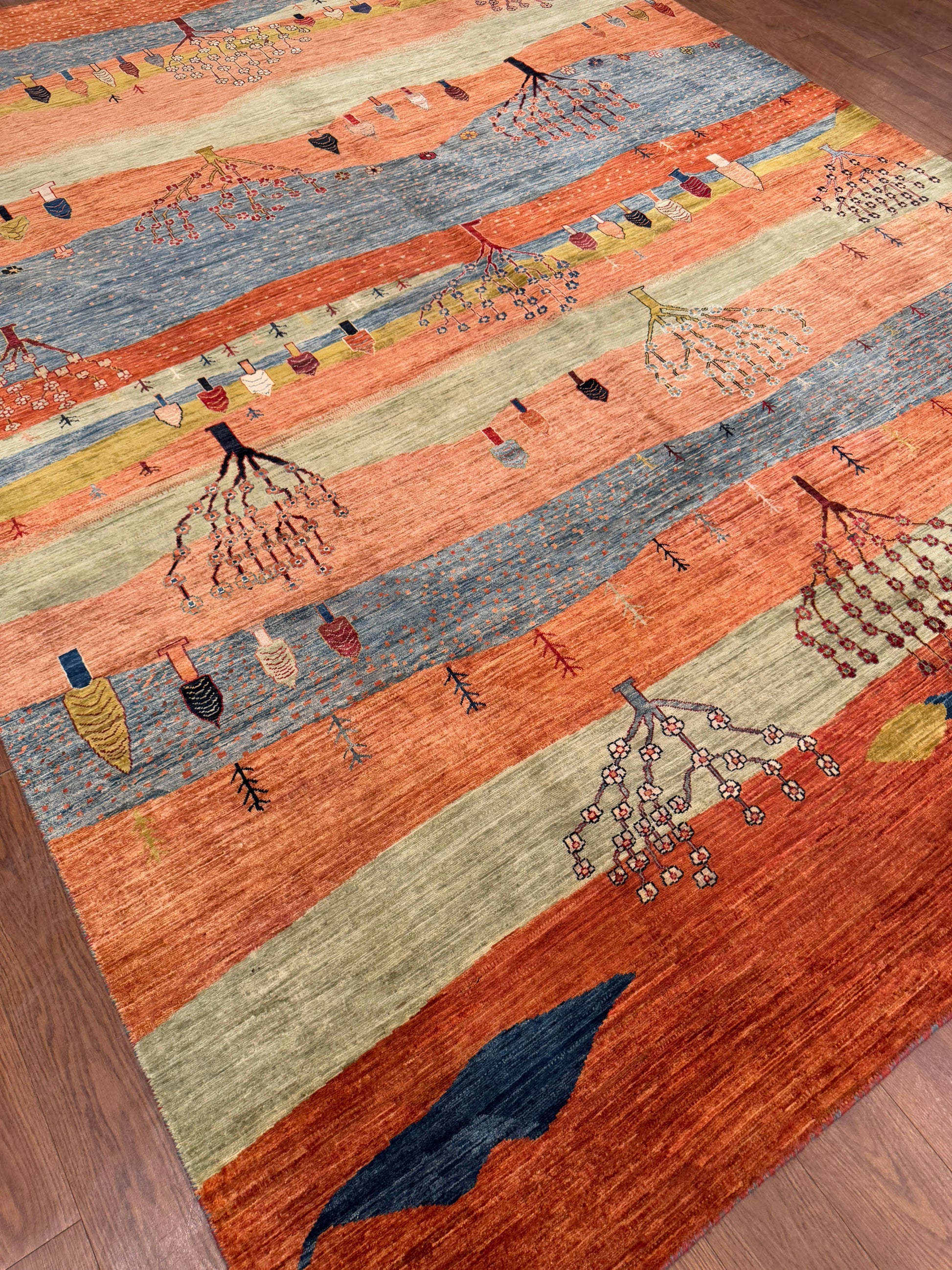 This handmade rug features a captivating landscape-inspired design with layered horizontal bands in warm, sunlit tones. The abstract tree and branch motifs appear to float across fields of terracotta, sage, blue, and gold, evoking a serene, nature-driven rhythm. Subtle variations in shading give the piece a sense of motion and depth, while the soft wool texture enhances its artisanal charm. Ideal for interiors seeking an artistic yet grounded focal point.
