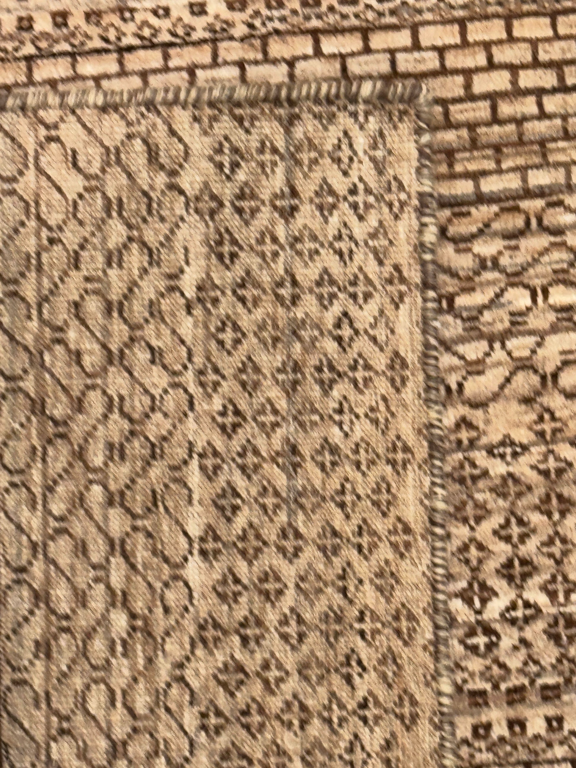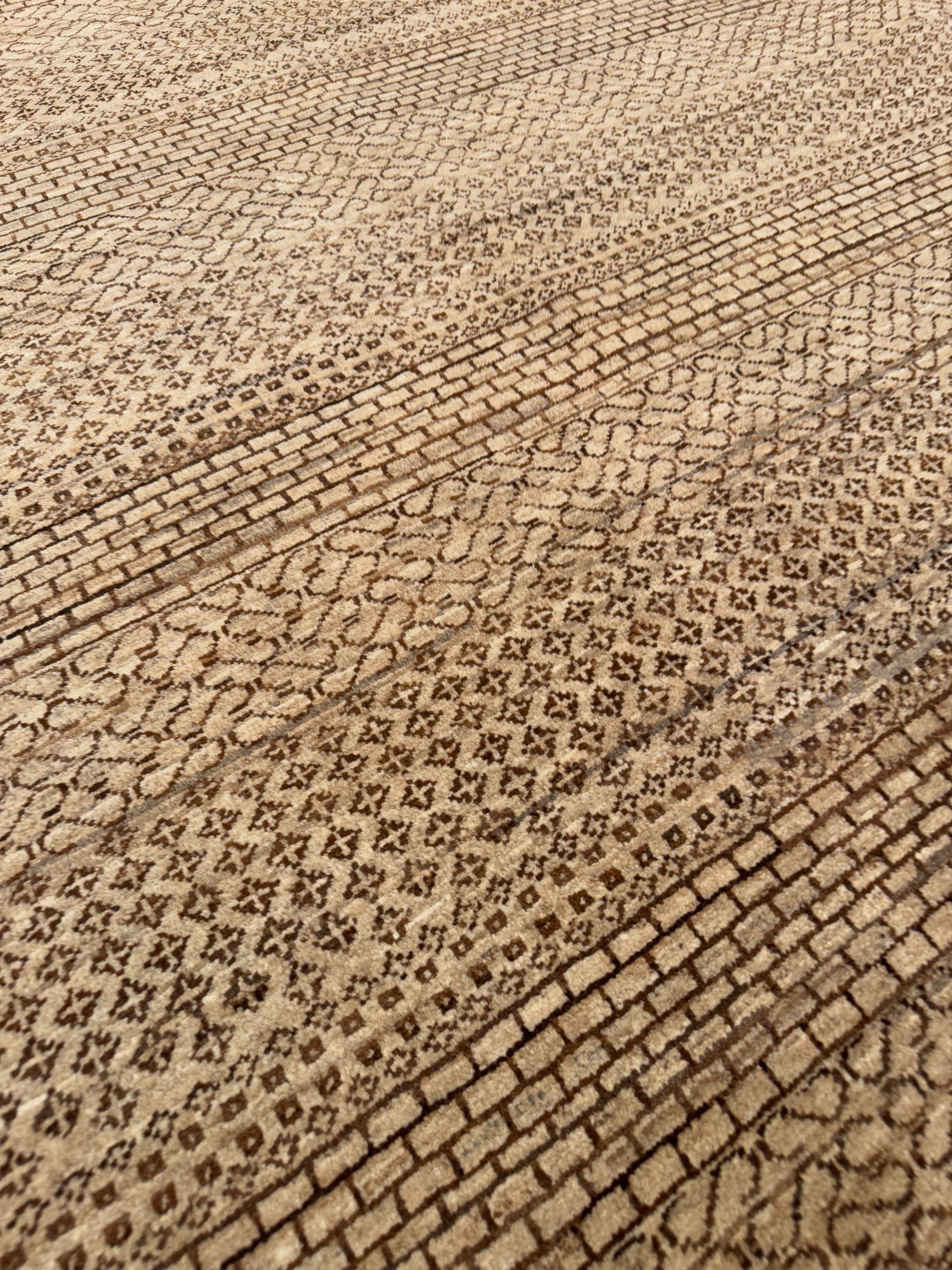 This handmade rug showcases a refined and minimalist approach with subtle geometric bands woven across its surface. The alternating patterns of diamonds, latticework, and curved motifs form a rhythmic texture that feels both structured and organic. Rendered in soft beige and cocoa tones, it exudes warmth and understated sophistication. Its neutral palette makes it a versatile foundation piece for both modern and transitional interiors.