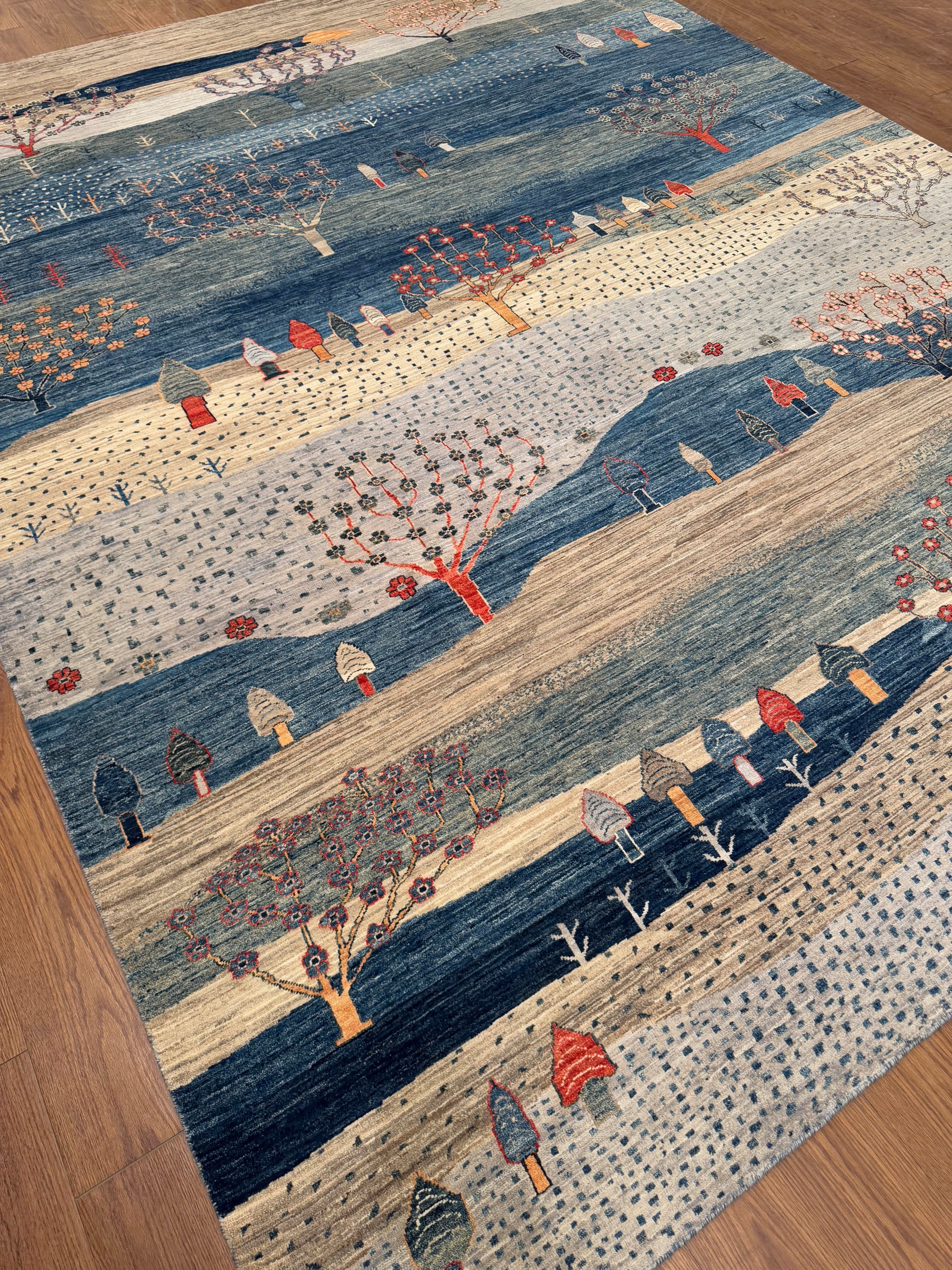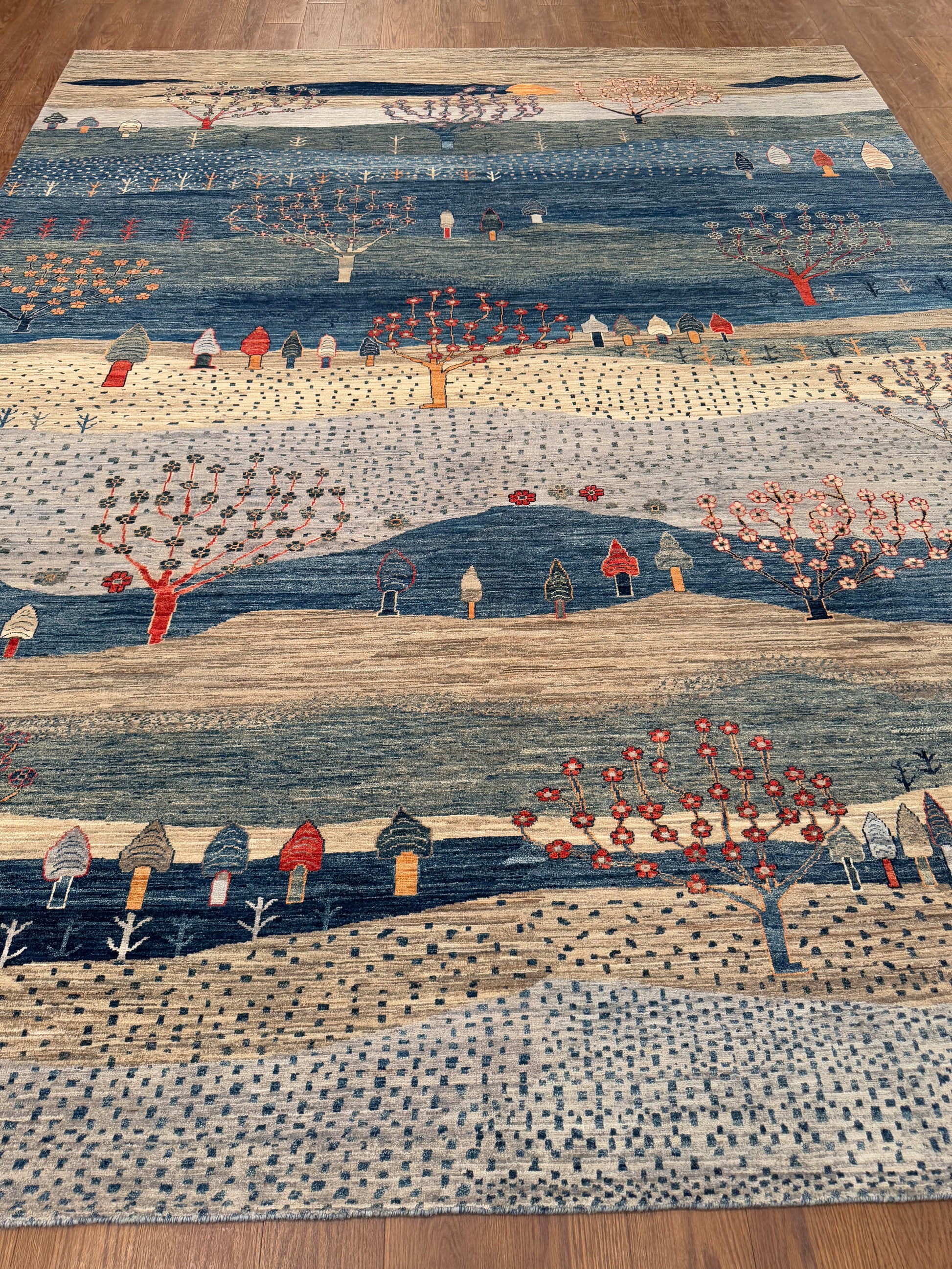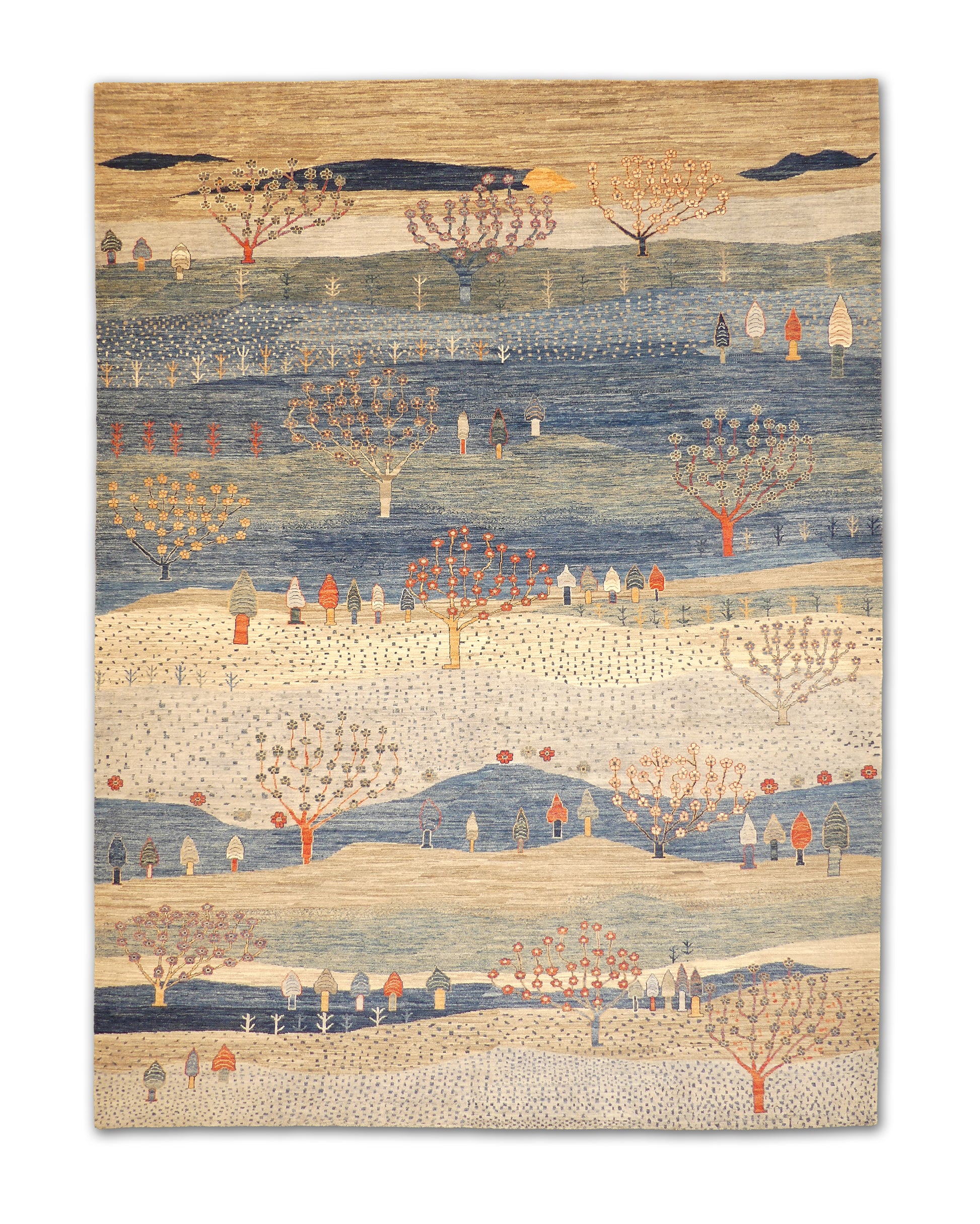 This handmade rug features an enchanting landscape-inspired design with stylized trees, winding hills, and scattered motifs in soft gradients of blue, beige, ivory, and coral. The abstract composition evokes a serene, painterly scene, blending modern artistry with traditional craftsmanship. Its balanced tones and whimsical details make it a captivating focal point for elegant, creative interiors.