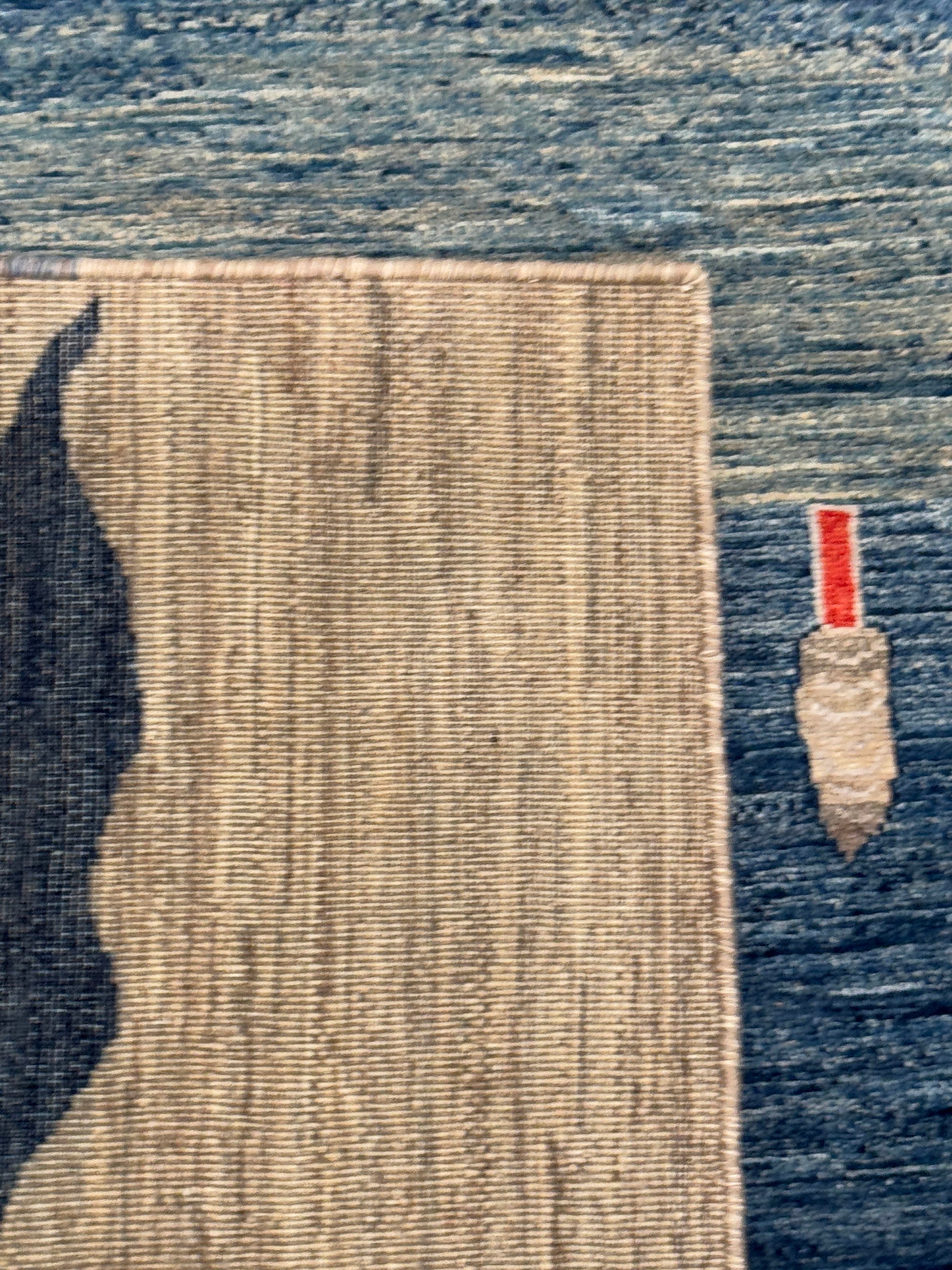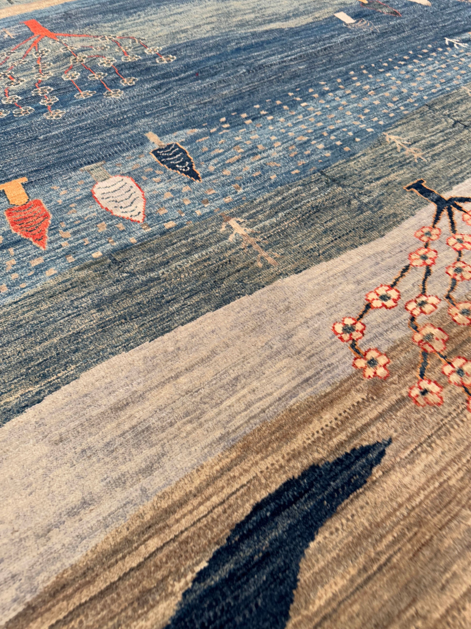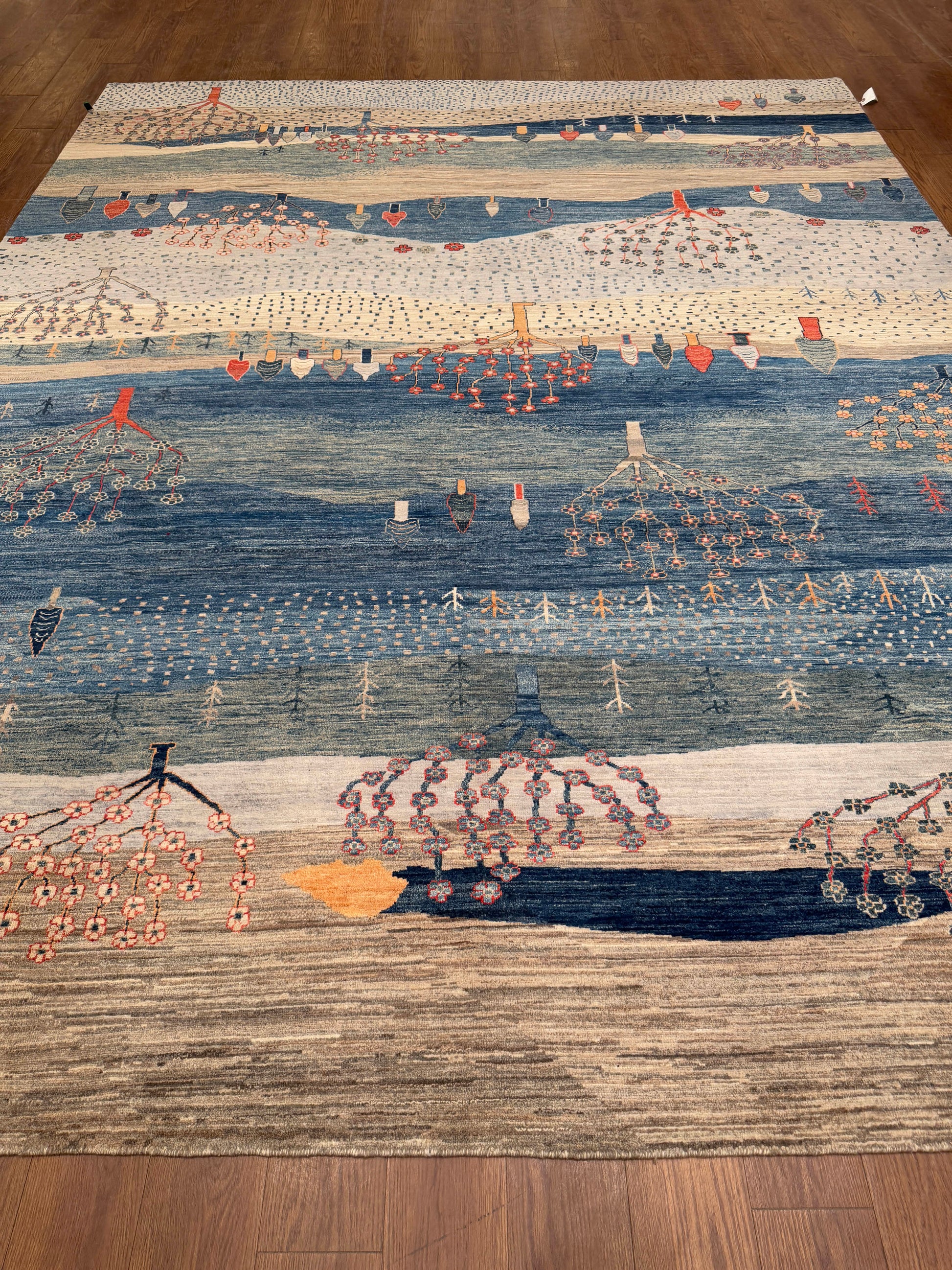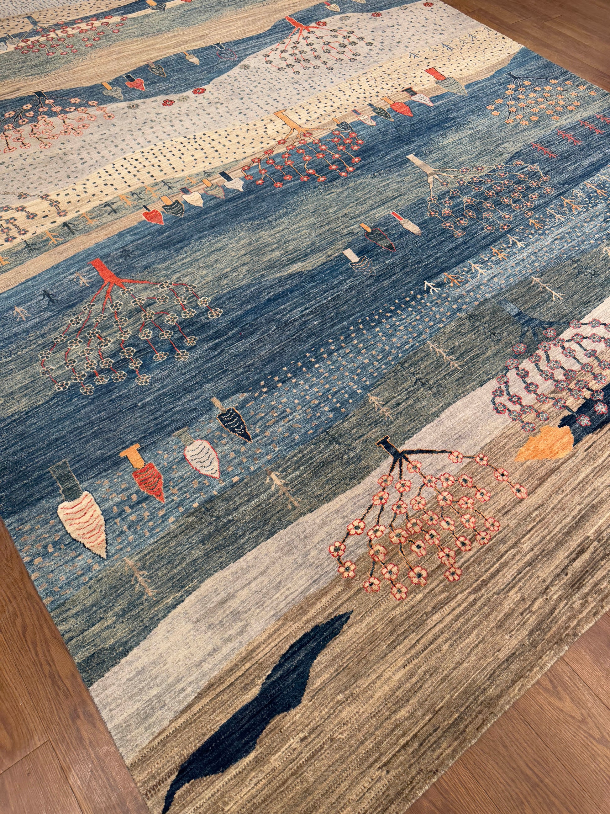 This handmade rug features an enchanting landscape-inspired design with stylized trees, winding hills, and scattered motifs in soft gradients of blue, beige, ivory, and coral. The abstract composition evokes a serene, painterly scene, blending modern artistry with traditional craftsmanship. Its balanced tones and whimsical details make it a captivating focal point for elegant, creative interiors.