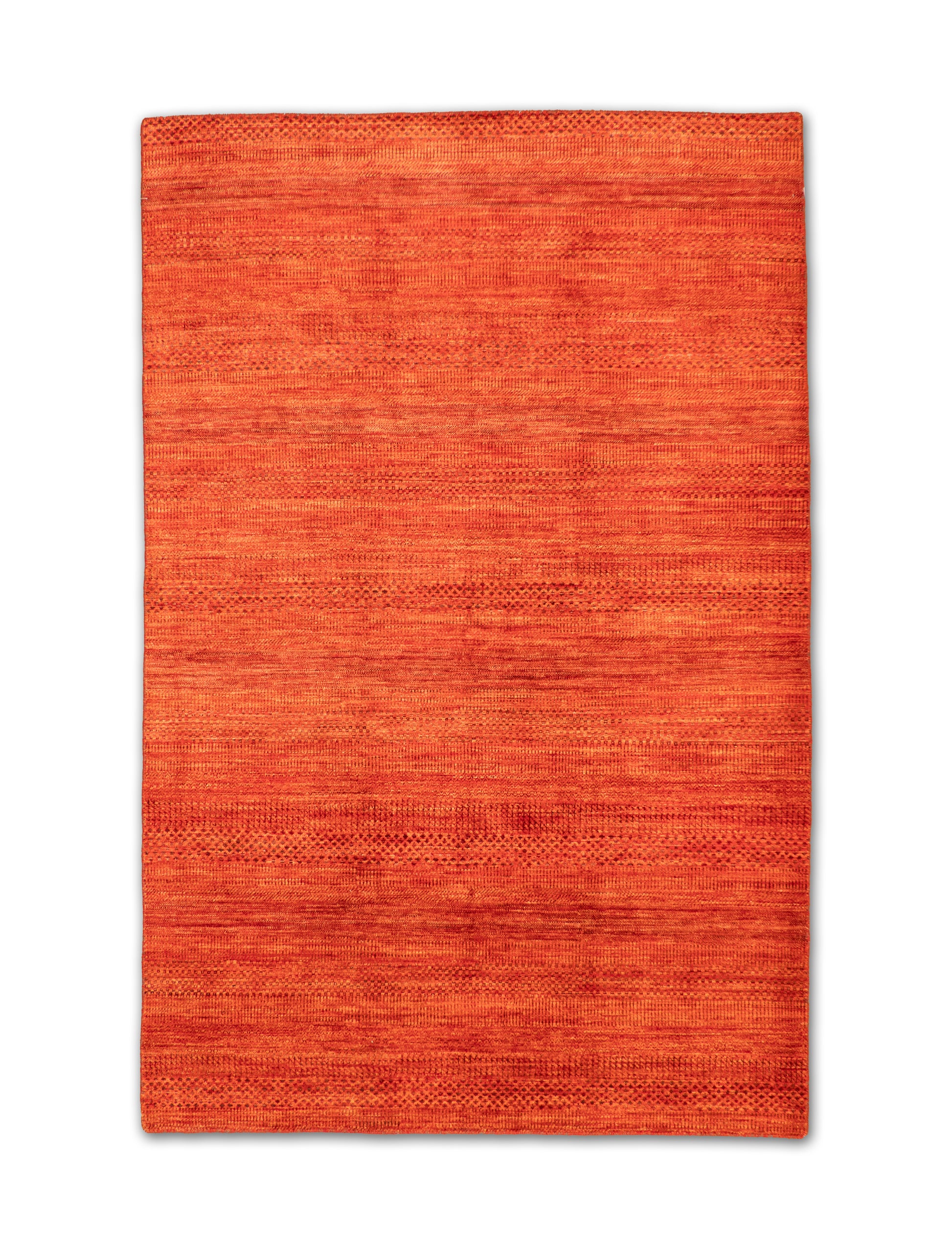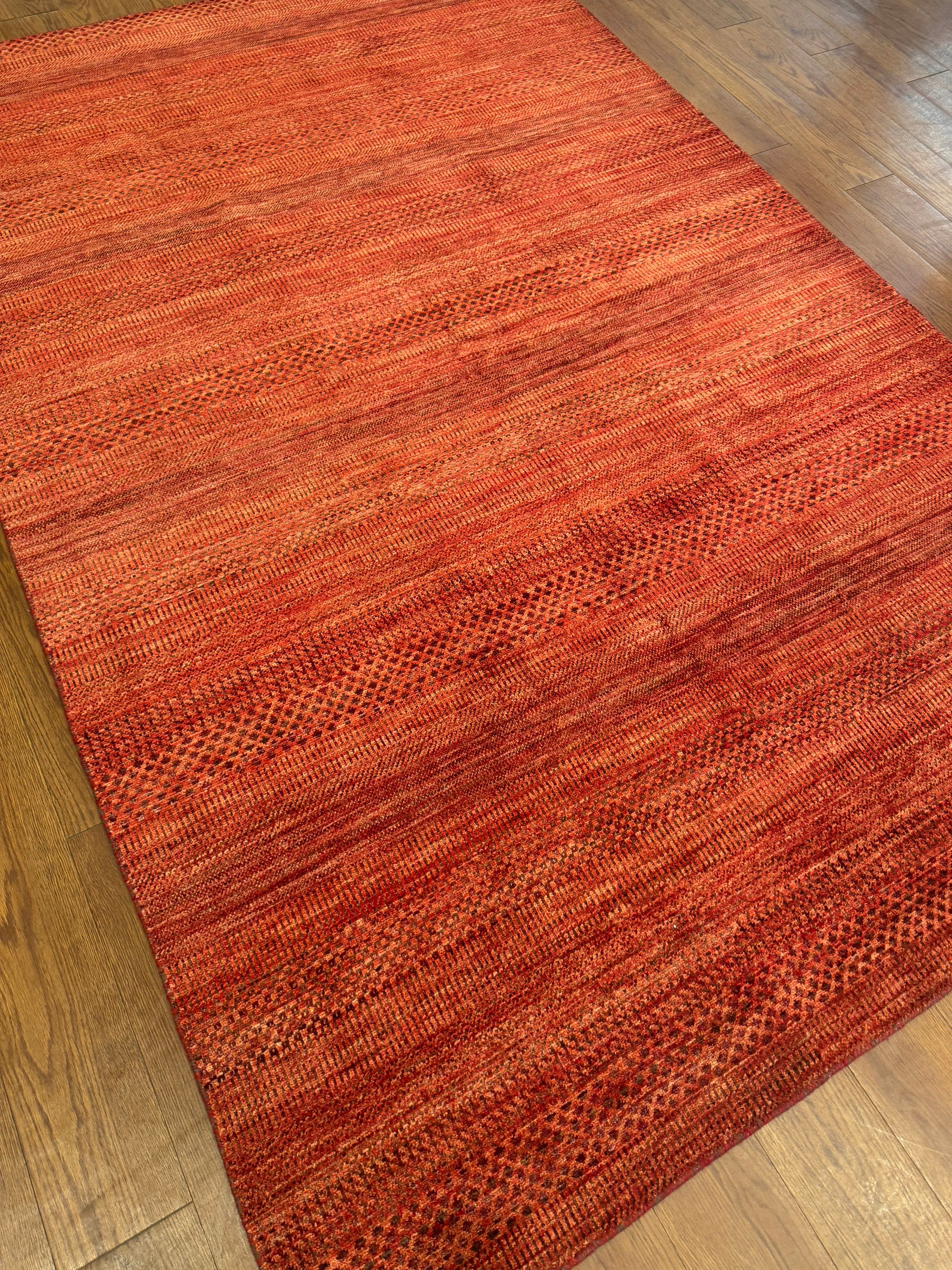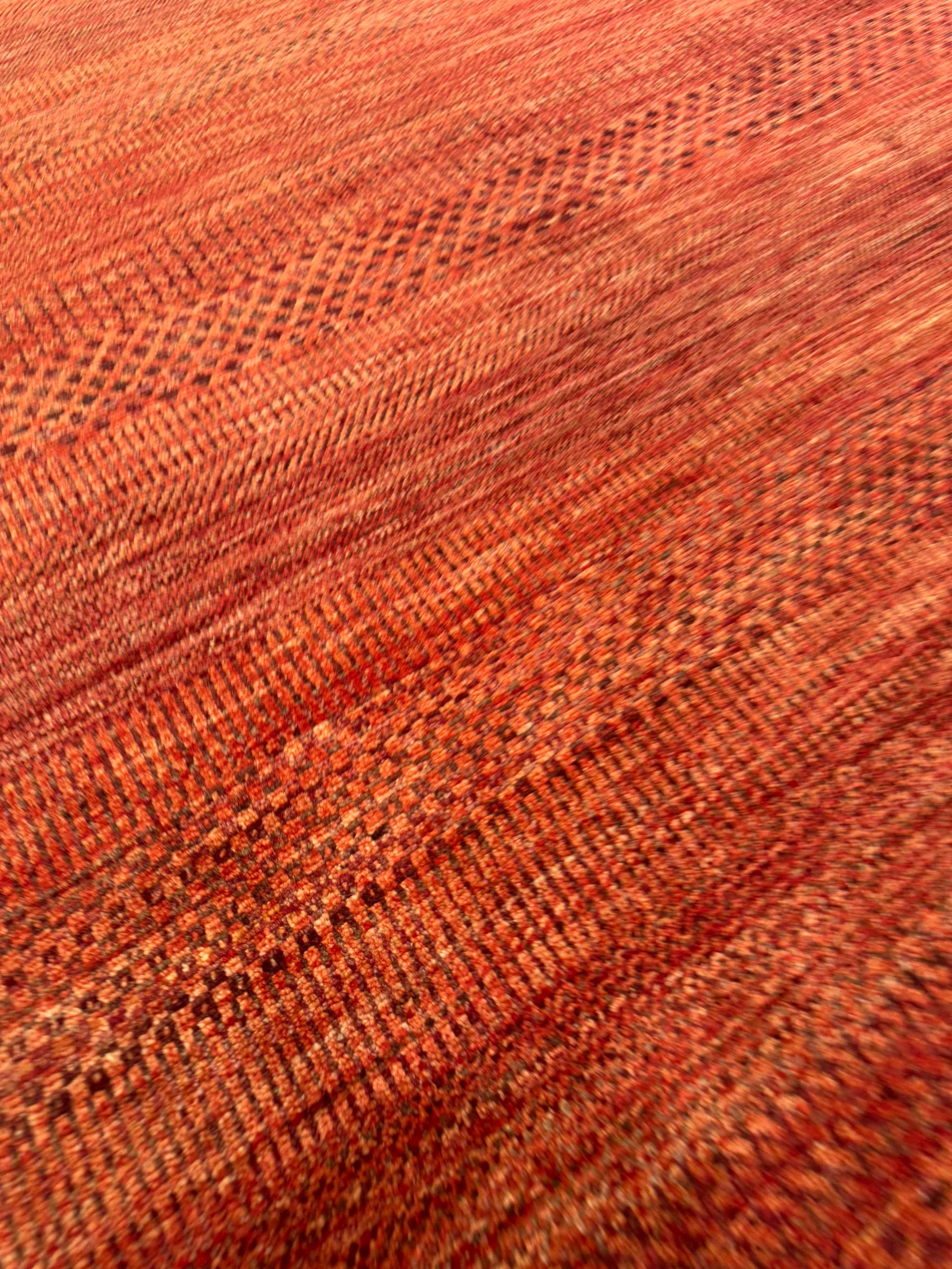 This bold handwoven wool rug radiates warmth and vibrancy with its deep red and orange tones. Subtle horizontal striations and small-scale geometric accents give the piece texture and depth, while its minimalist yet dynamic design makes it versatile for both modern and eclectic interiors. A striking statement piece that brings energy and richness to any room.
