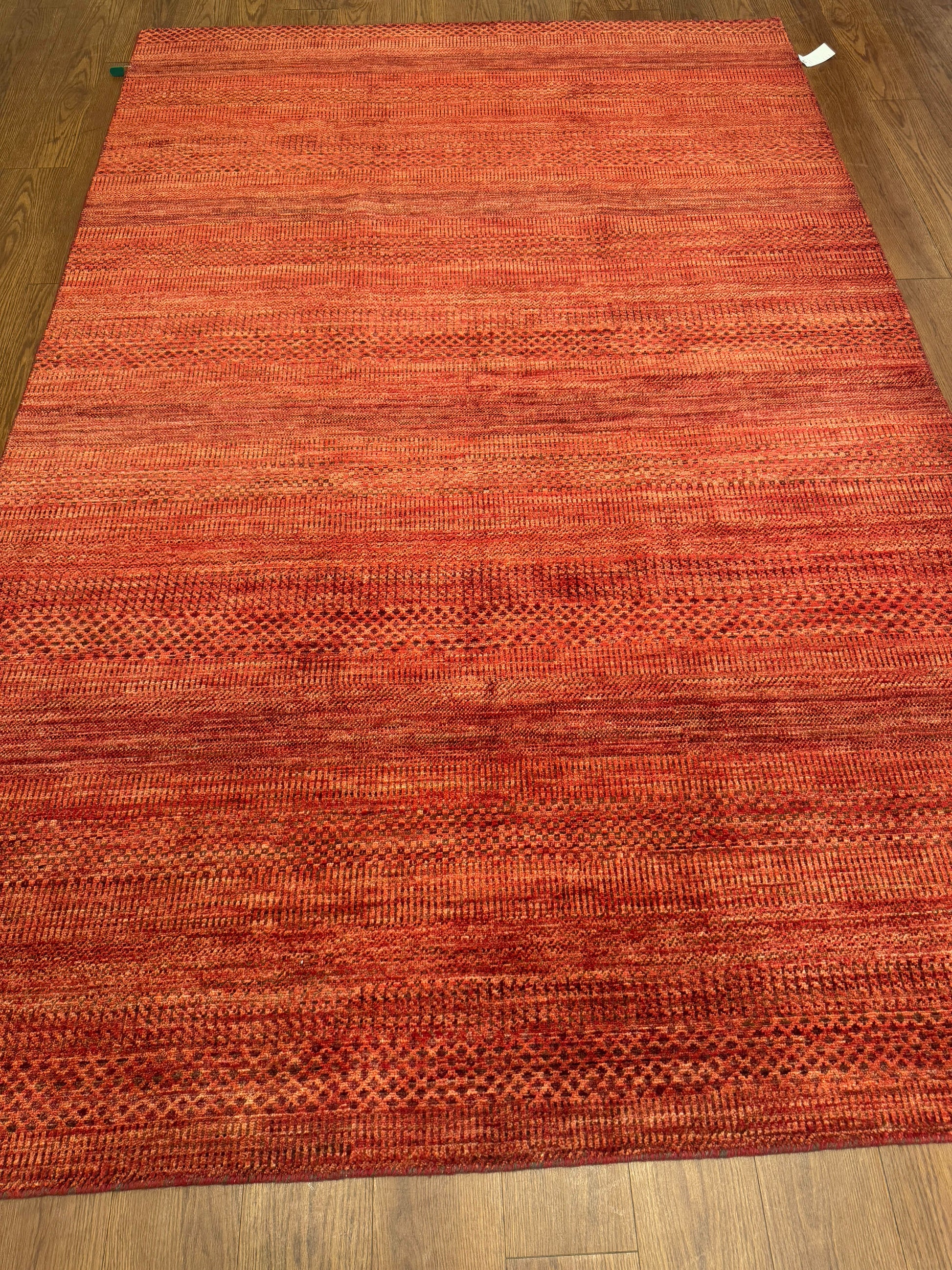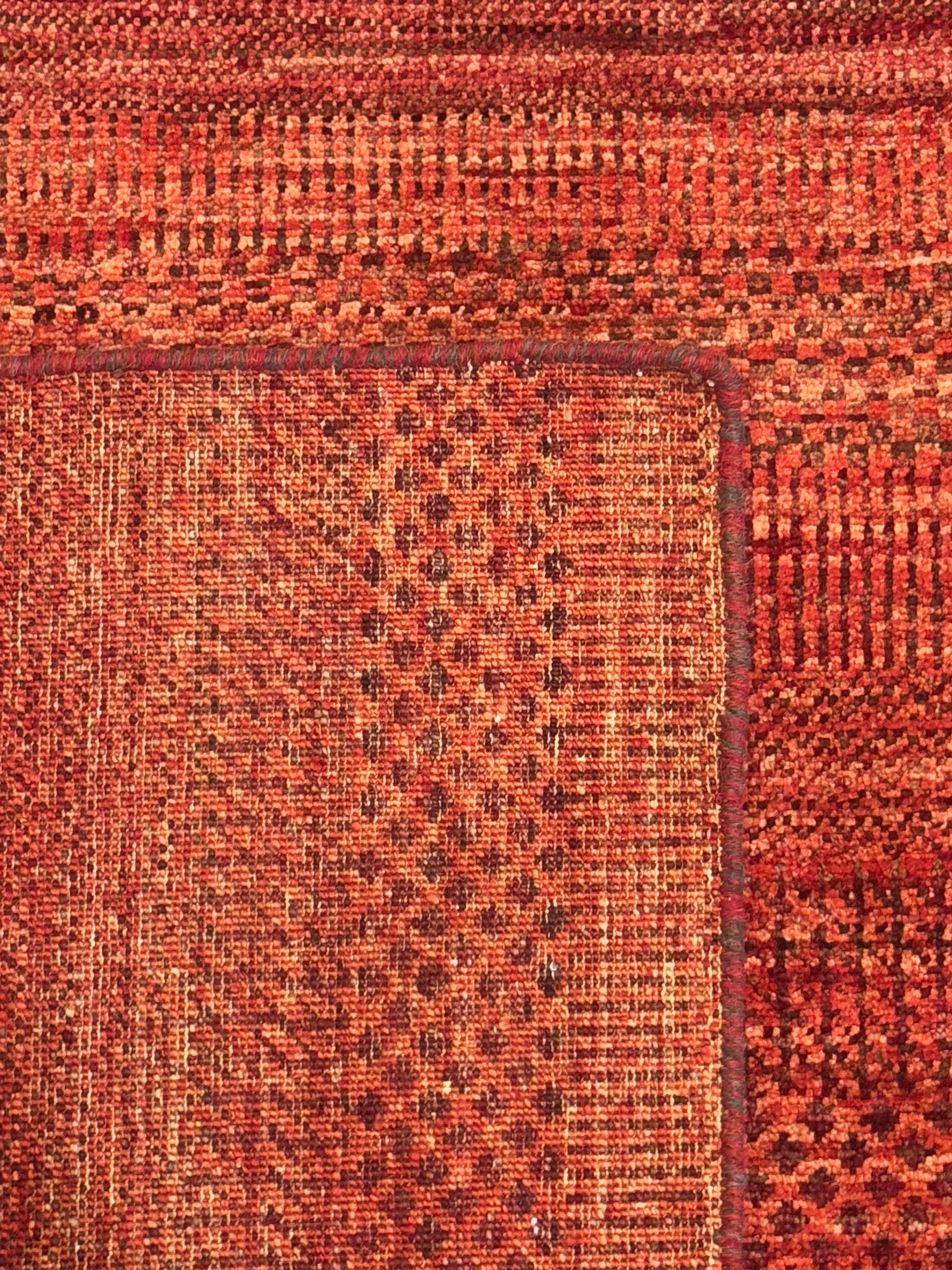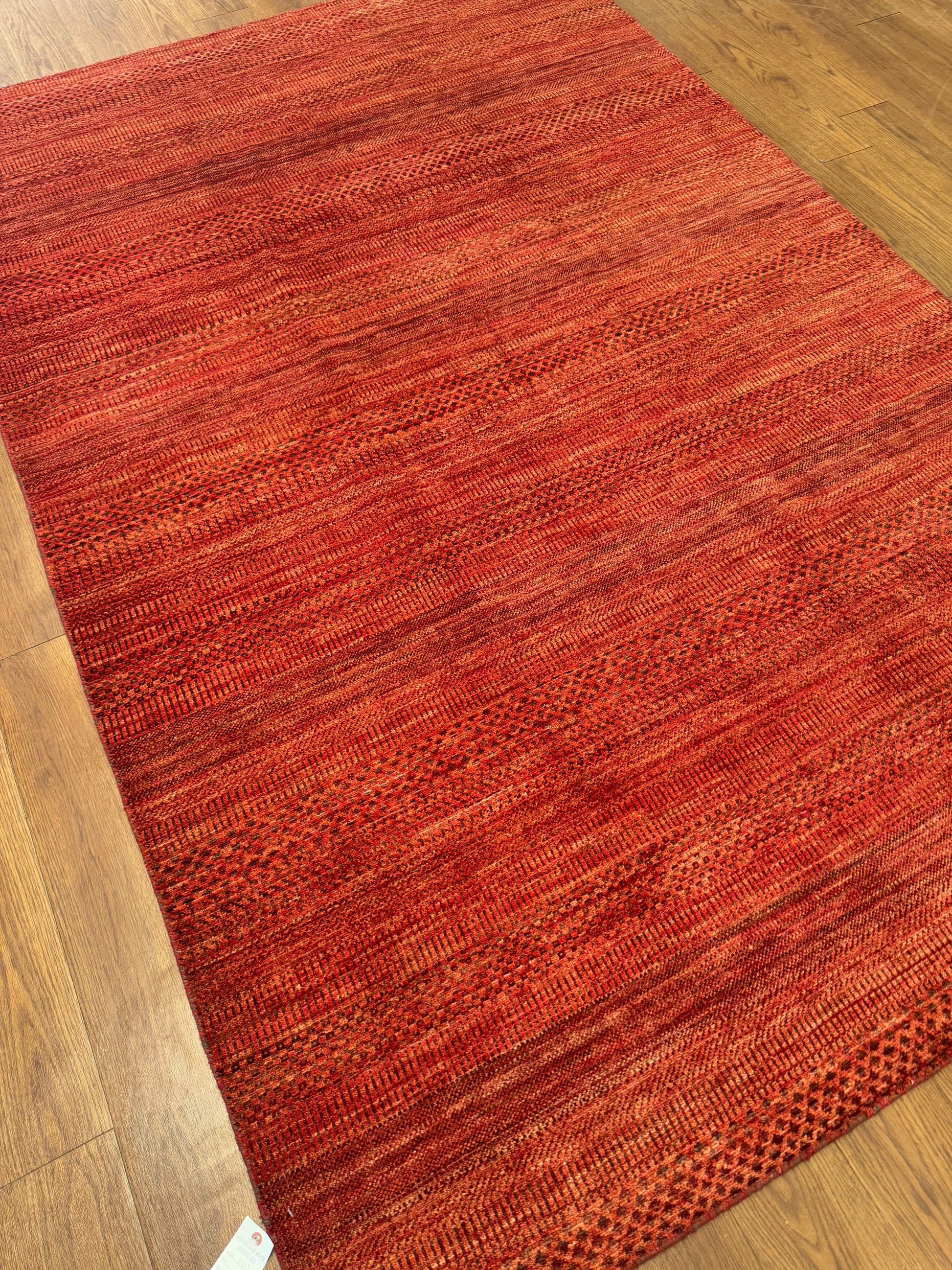 This bold handwoven wool rug radiates warmth and vibrancy with its deep red and orange tones. Subtle horizontal striations and small-scale geometric accents give the piece texture and depth, while its minimalist yet dynamic design makes it versatile for both modern and eclectic interiors. A striking statement piece that brings energy and richness to any room.