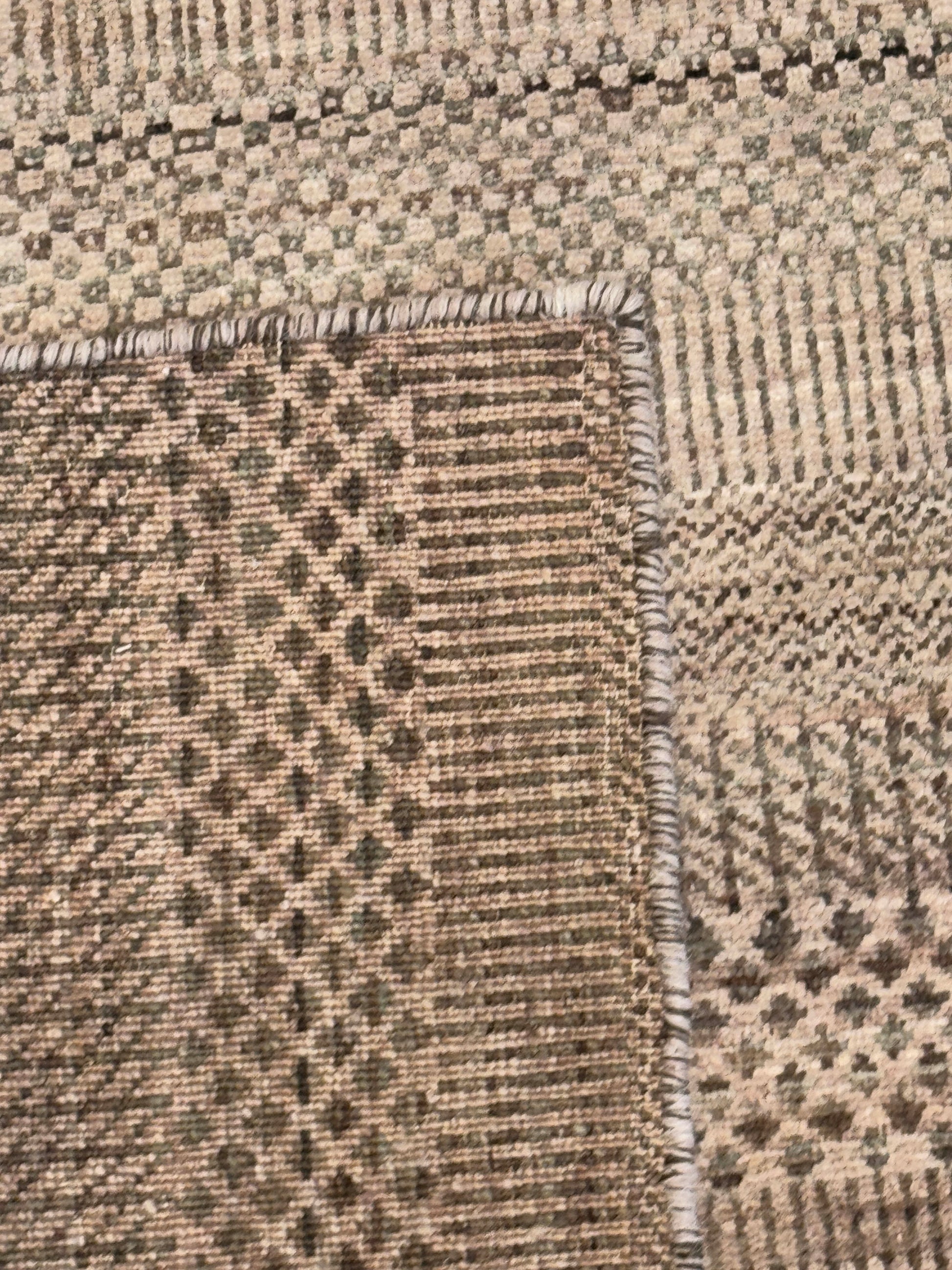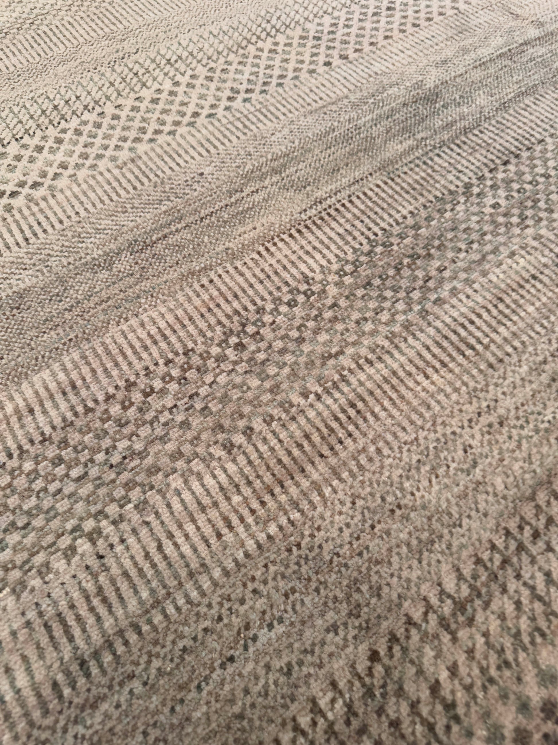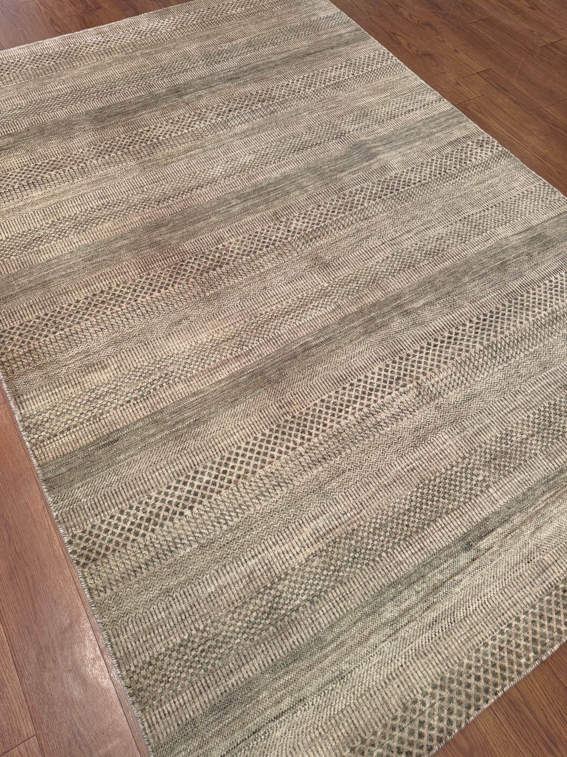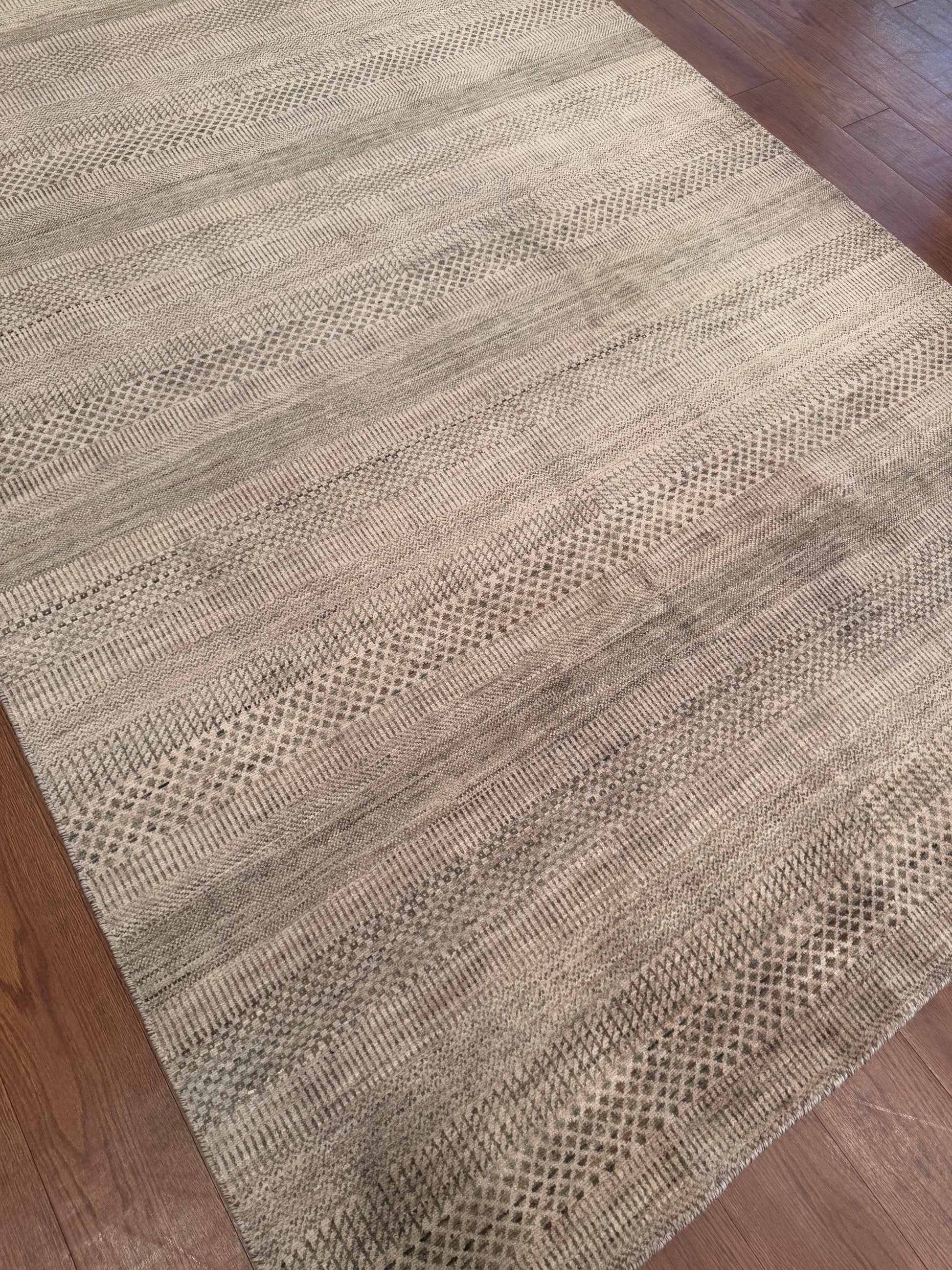 This elegant handwoven wool rug showcases a subtle neutral palette with intricate horizontal striations and geometric accents. The blend of earthy beige and soft gray tones creates a calming and sophisticated presence, while the fine detailing adds depth and visual interest. A versatile piece, it complements both modern and transitional interiors with understated elegance.
