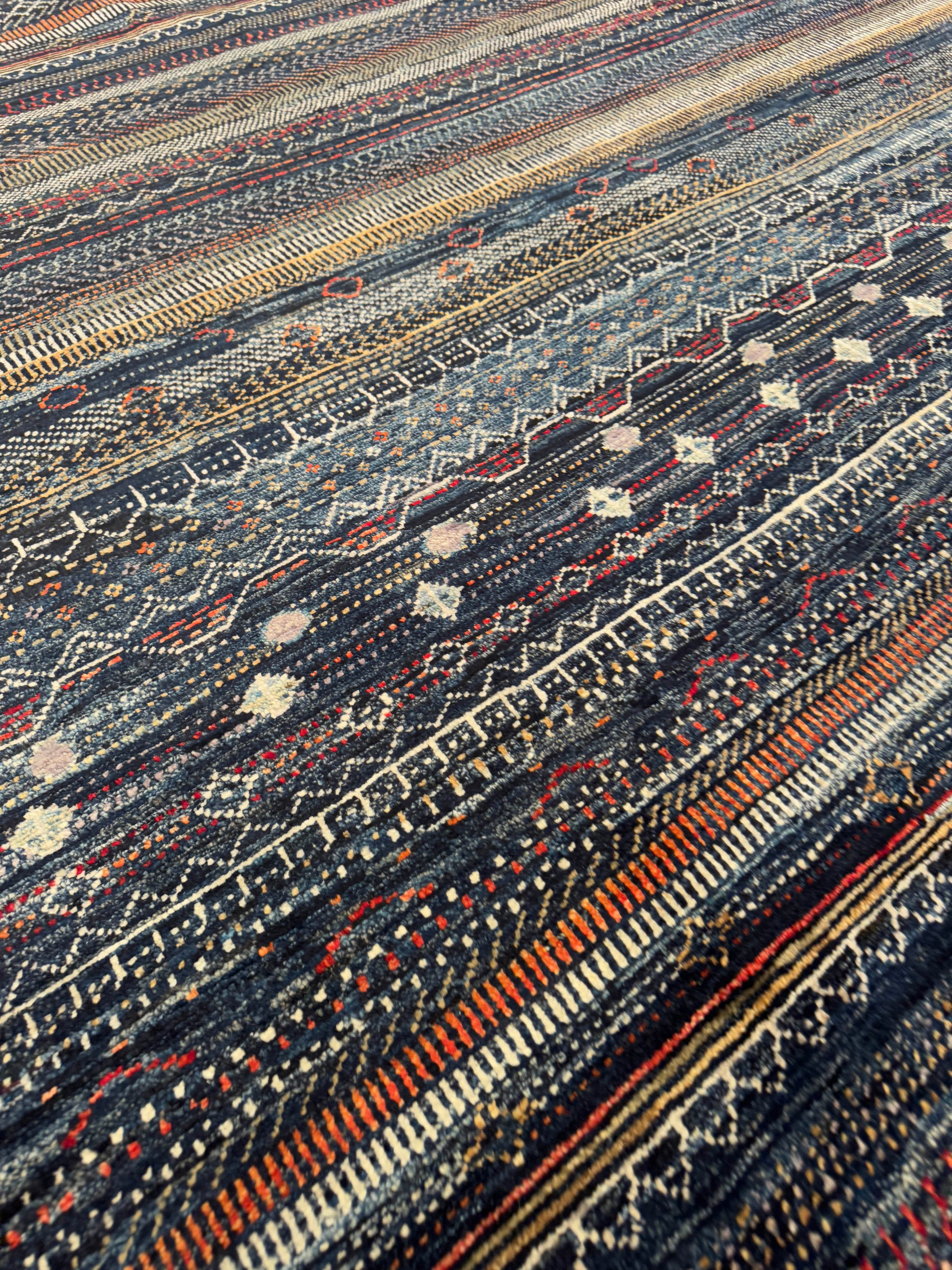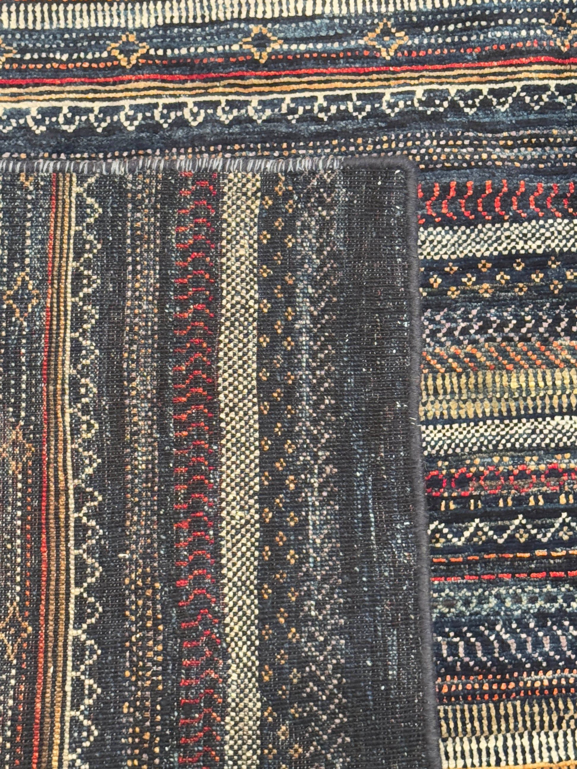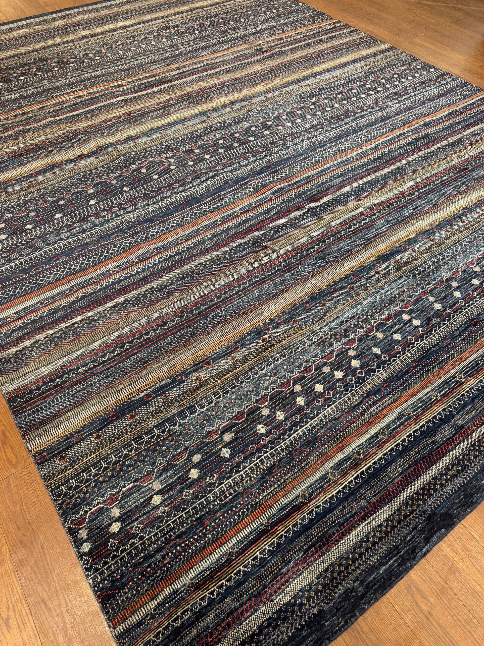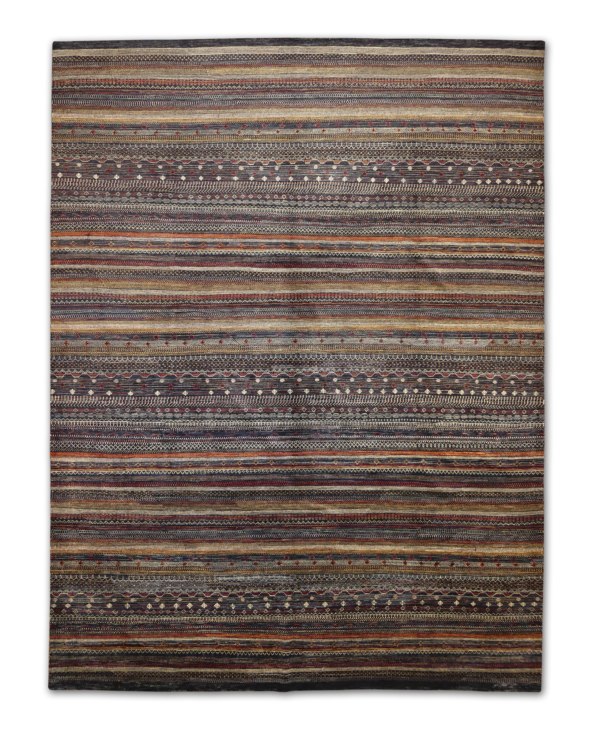 This striking handwoven rug showcases a bold striped design in deep charcoal and midnight tones, accented with intricate tribal-inspired patterns in cream, red, and earthy hues. The alternating rows of geometric motifs create movement and texture, giving it a modern yet organic character. Its dramatic palette makes it perfect for grounding large spaces, adding warmth and sophistication to contemporary, bohemian, or transitional interiors.