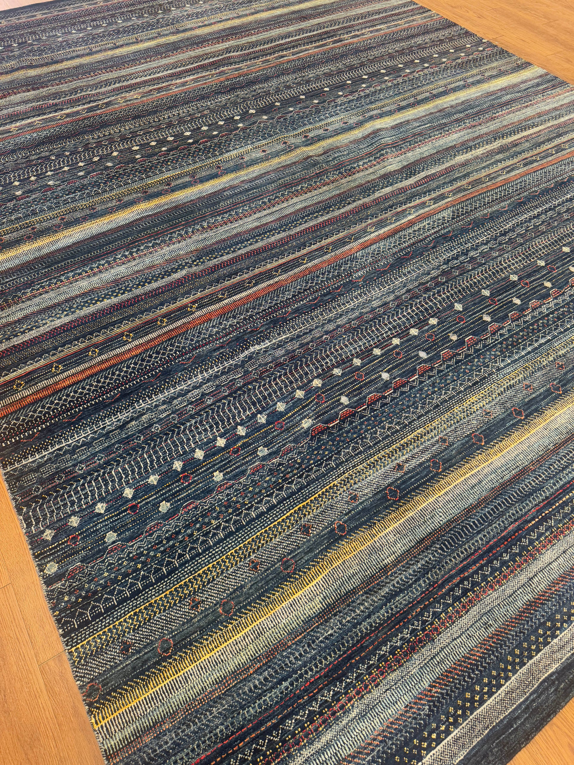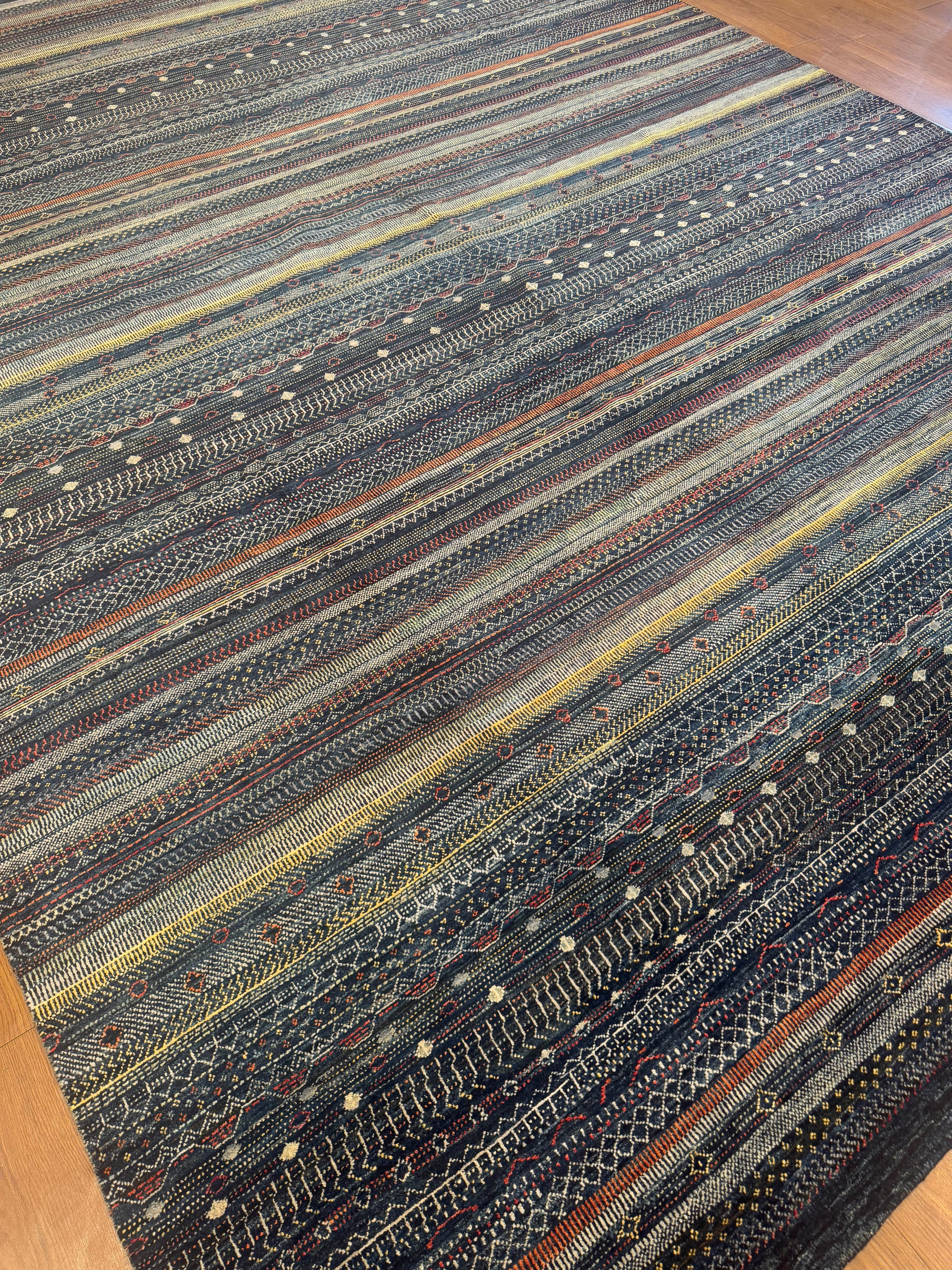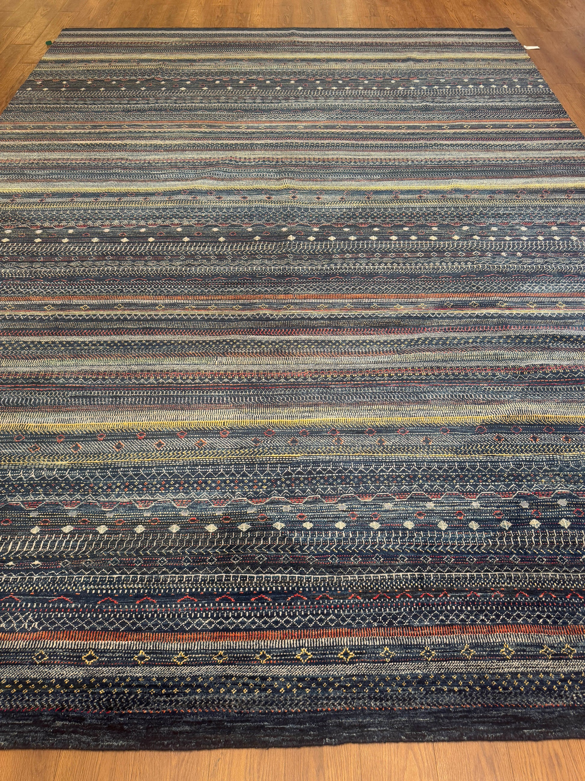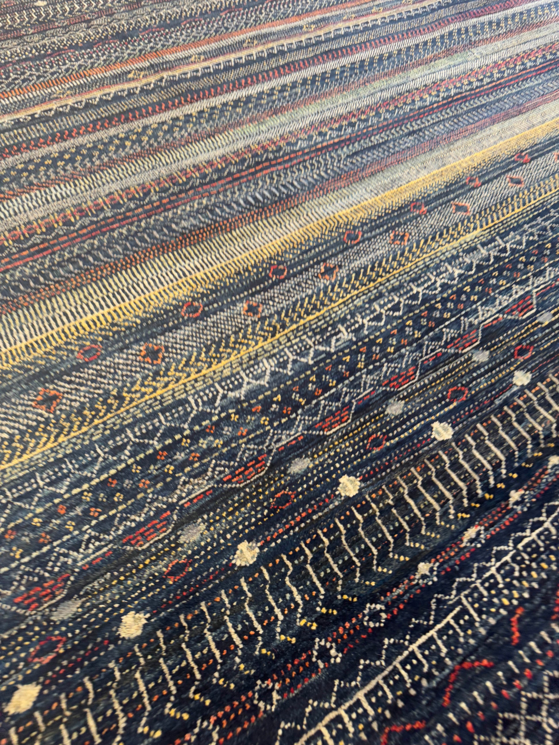 This handmade wool rug features a bold striped composition with intricate tribal-inspired detailing. The alternating rows of motifs in navy, gold, ivory, and rust create a dynamic yet balanced rhythm, adding both warmth and sophistication. Its durable weave and timeless palette make it a versatile choice for modern, rustic, or eclectic interiors.