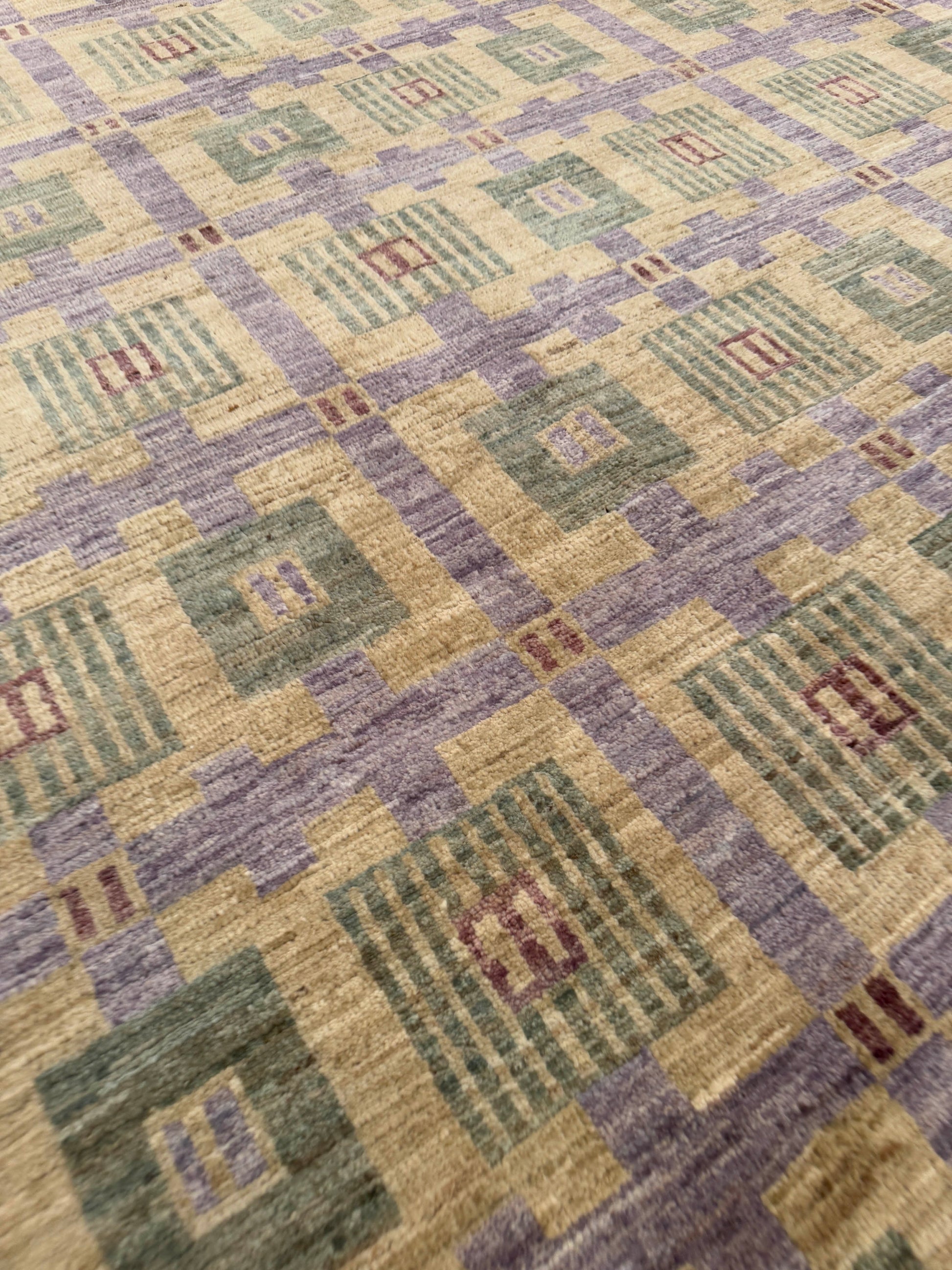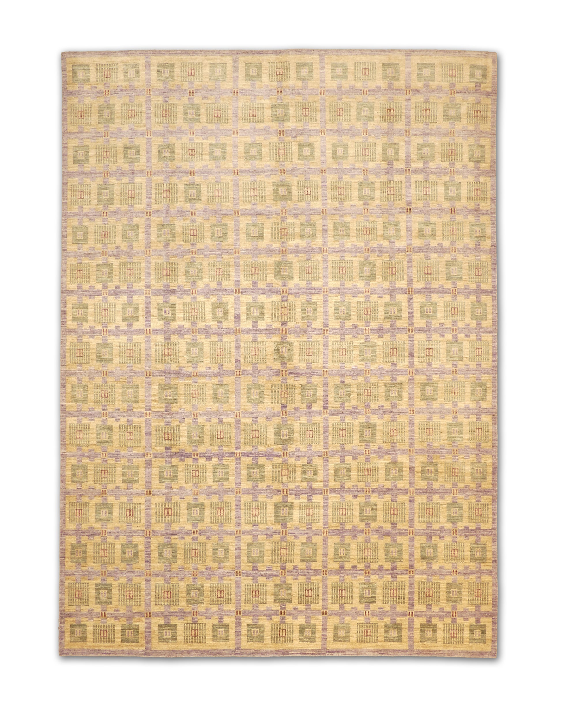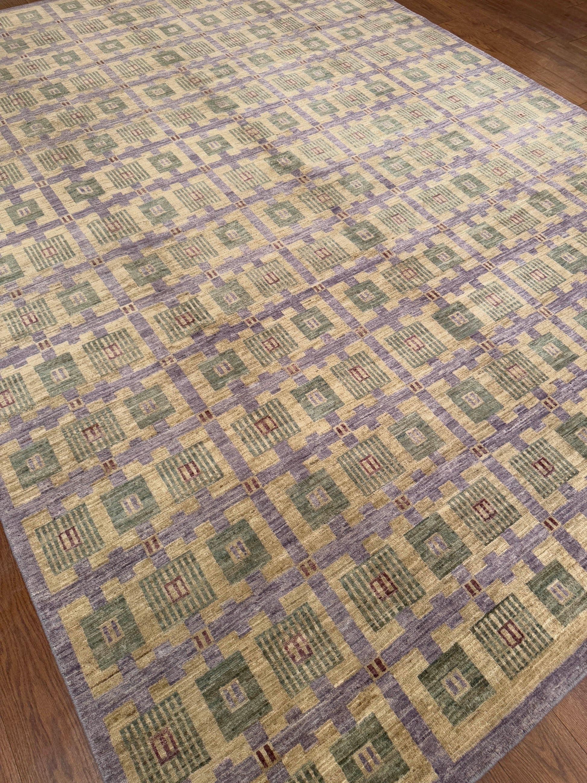 This handmade rug features a refined, geometric allover design composed of softly transitioning hues. Its pattern of interlocking squares and cross motifs creates a balanced, grid-like composition that feels both modern and timeless. The muted palette of lavender, sage, beige, and taupe enhances its tranquil aesthetic, while subtle texture variations lend dimension and warmth. A perfect statement for spaces favoring calm sophistication and structured style.