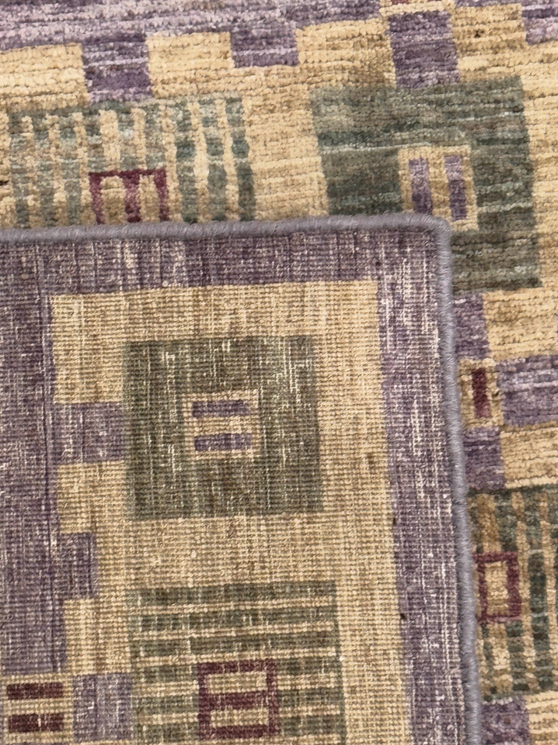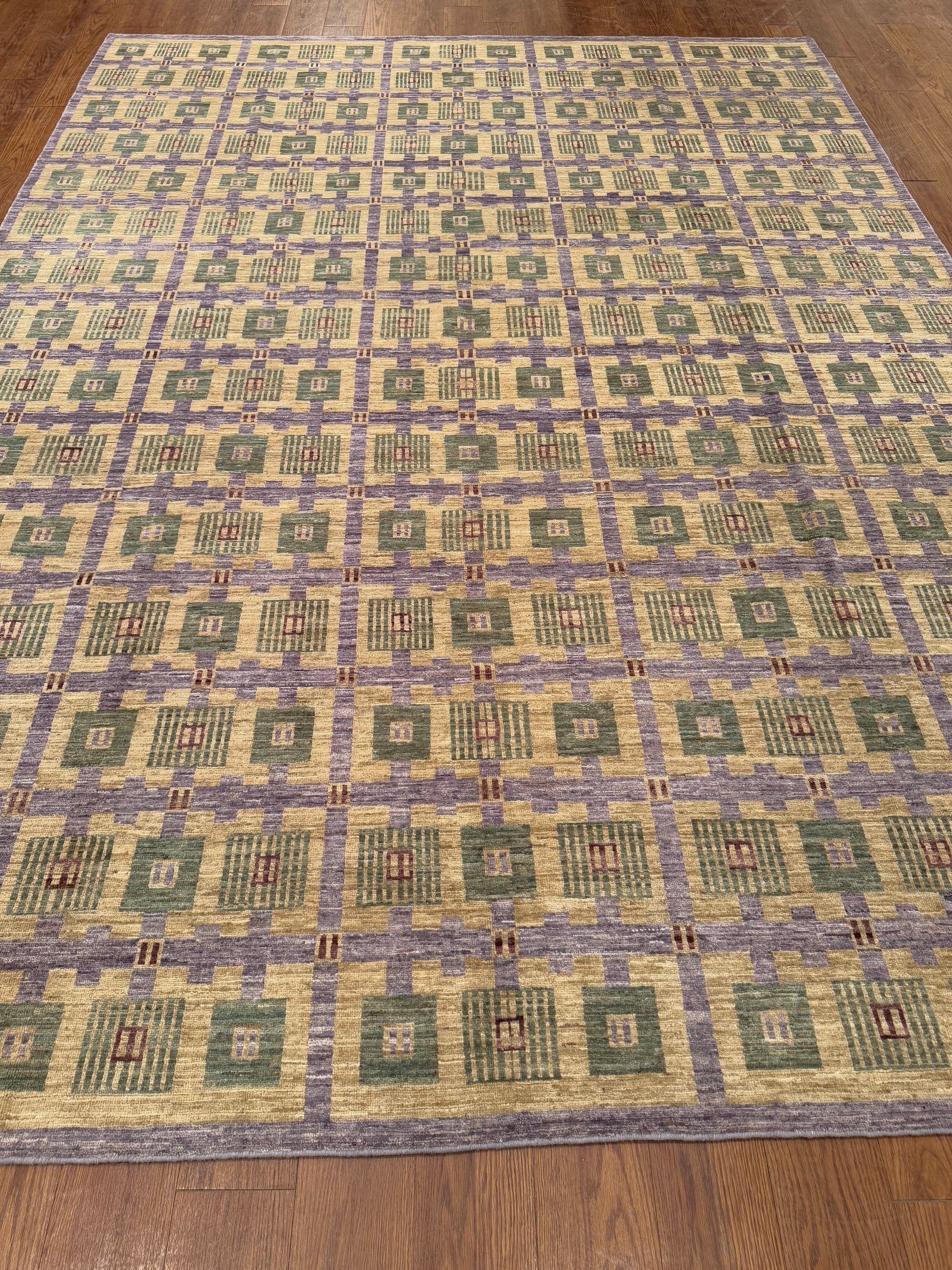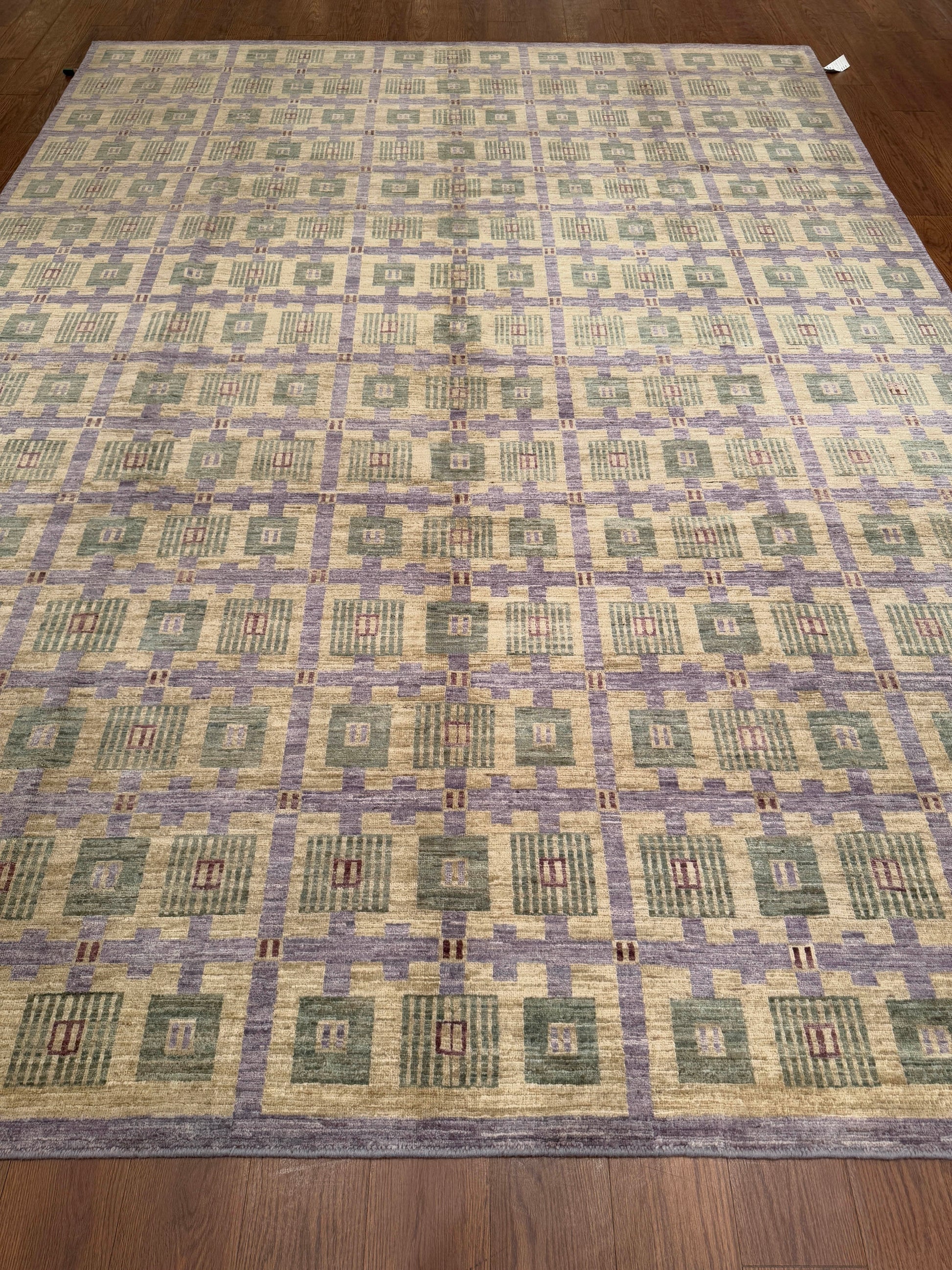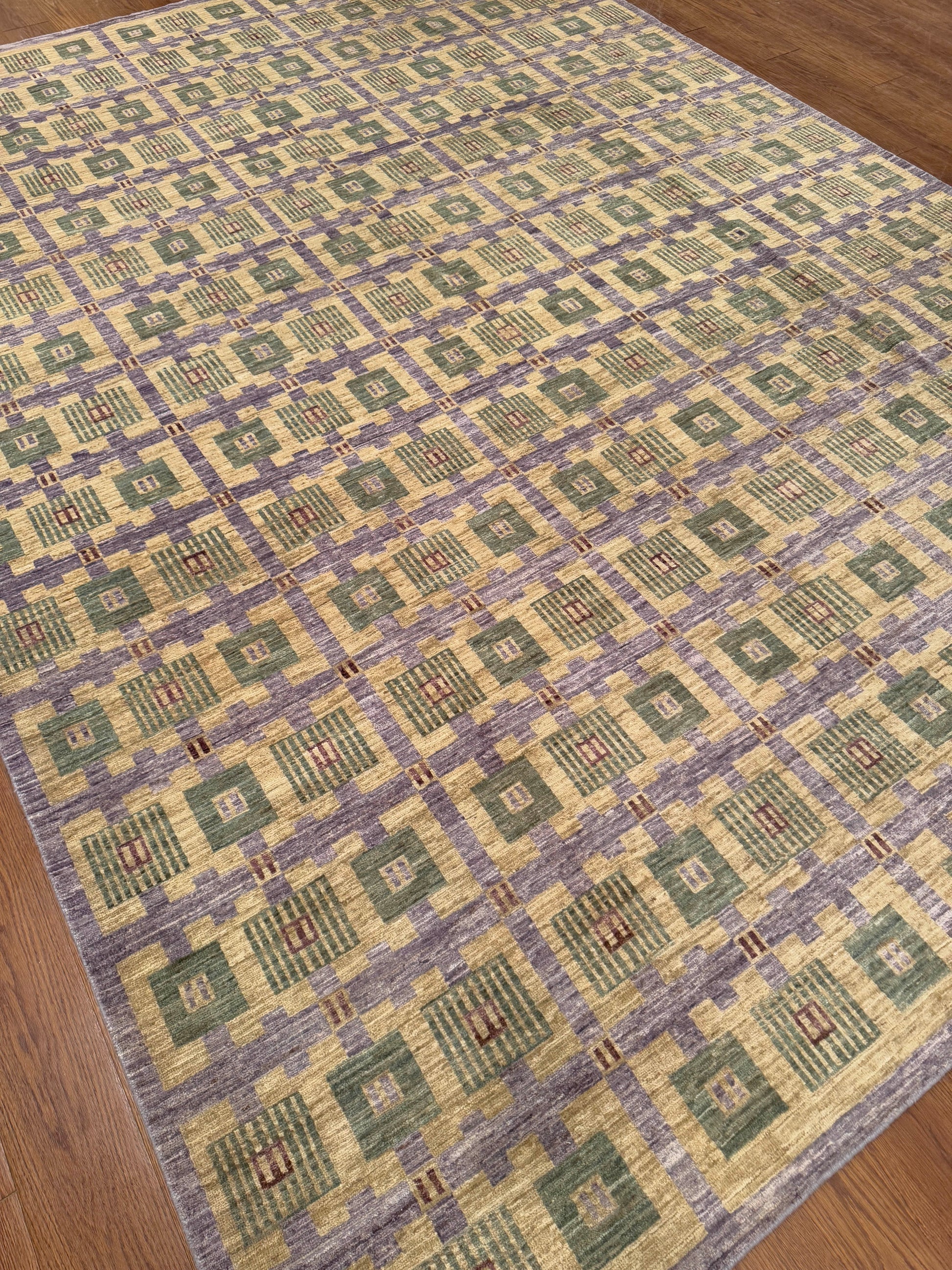 This handmade rug features a refined, geometric allover design composed of softly transitioning hues. Its pattern of interlocking squares and cross motifs creates a balanced, grid-like composition that feels both modern and timeless. The muted palette of lavender, sage, beige, and taupe enhances its tranquil aesthetic, while subtle texture variations lend dimension and warmth. A perfect statement for spaces favoring calm sophistication and structured style.