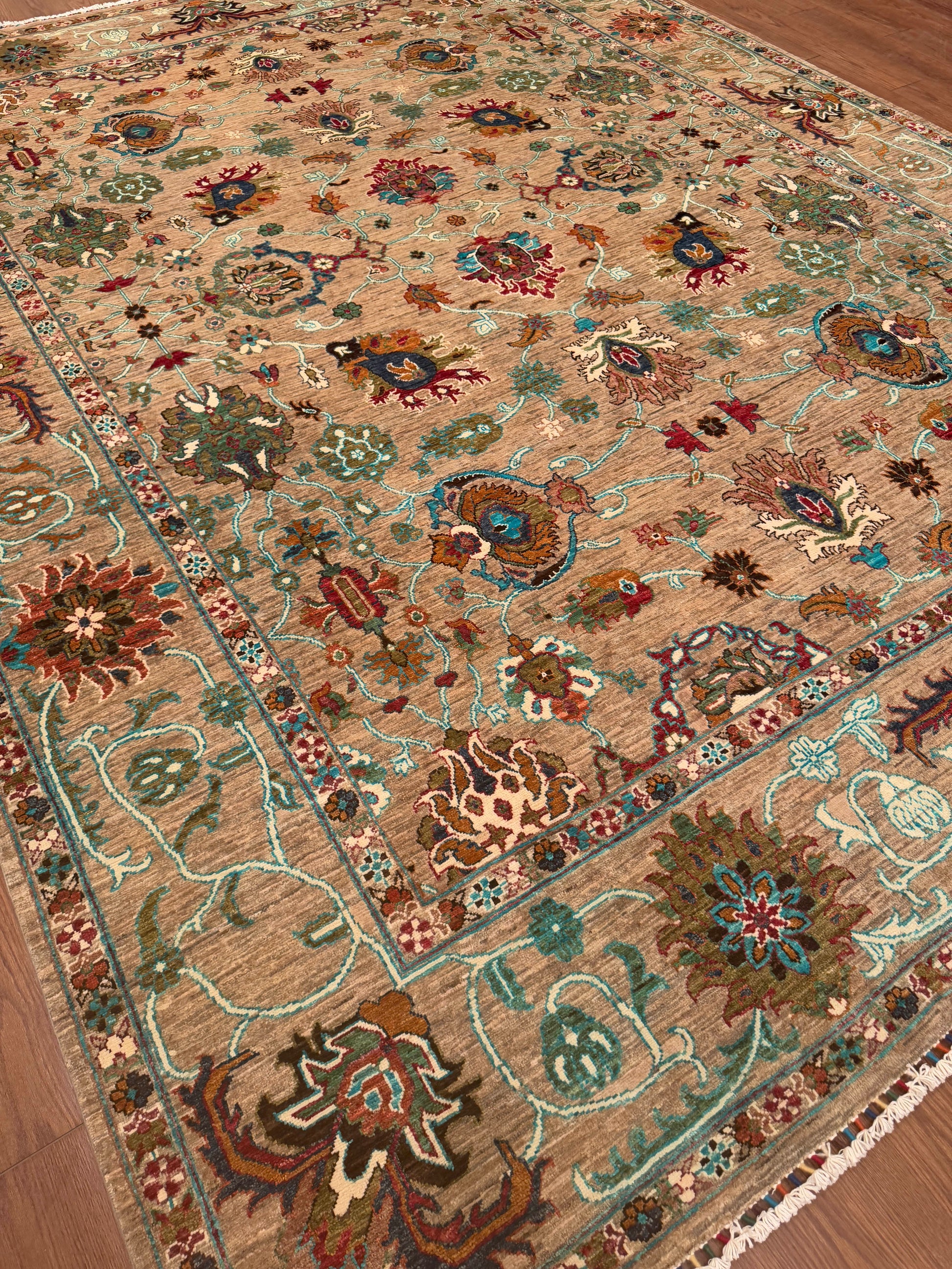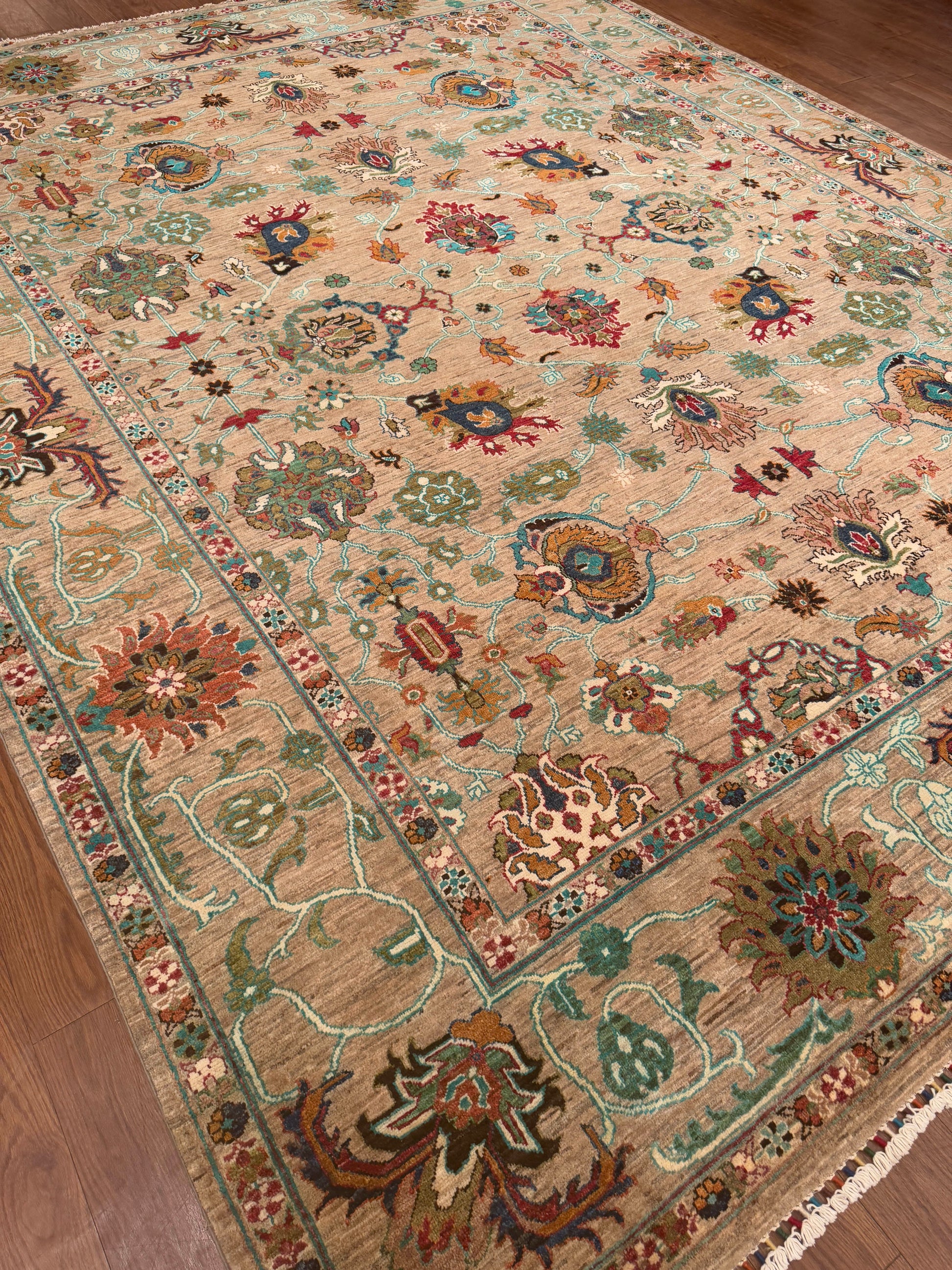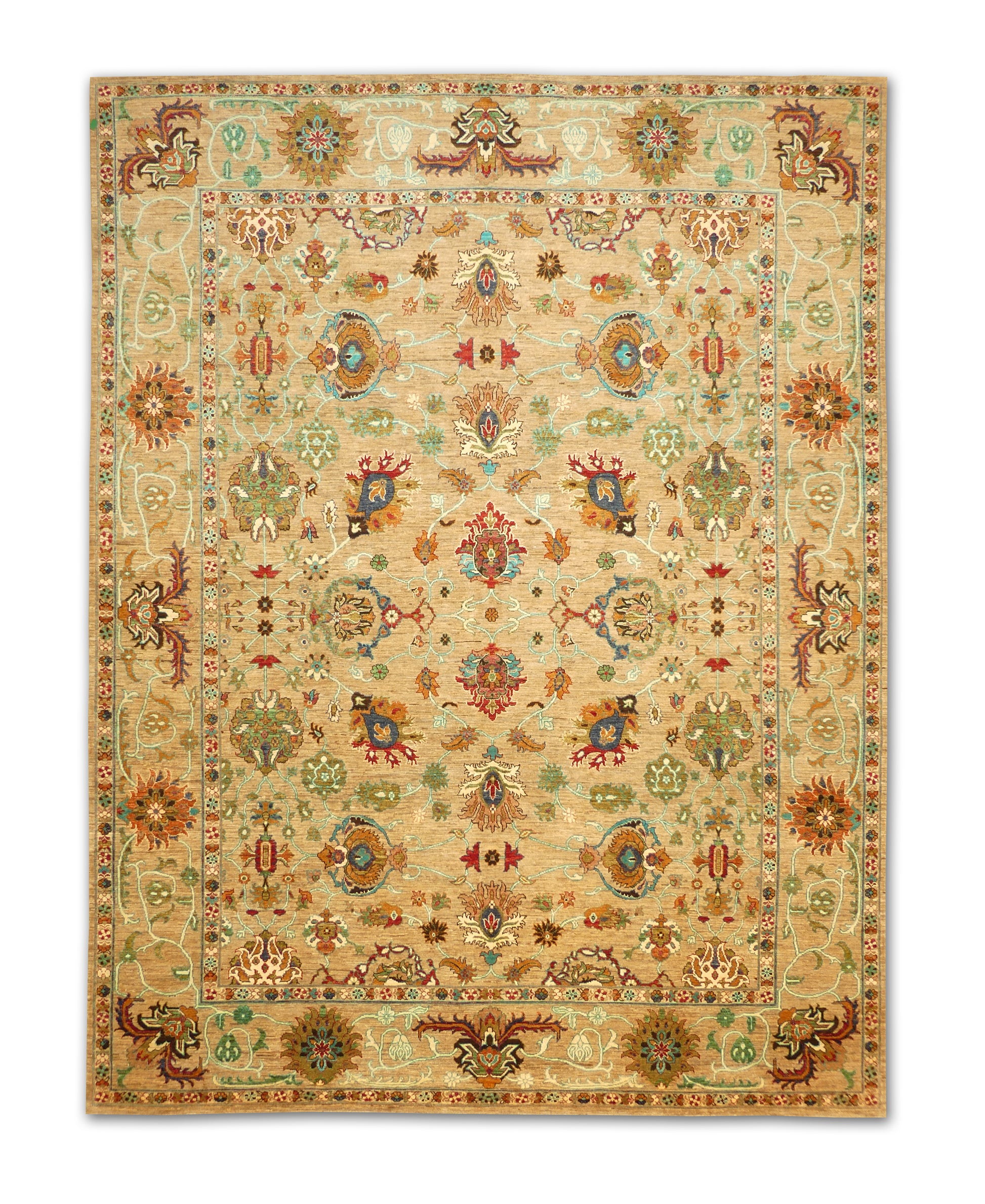 This exquisite handwoven piece features a soft tan field adorned with intricate floral and vine motifs in teal, rose, gold, and ivory. The open, flowing design gives a sense of movement and balance, while the delicate border adds depth and sophistication. Its harmonious palette and refined craftsmanship make it an elegant centerpiece for both traditional and transitional interiors.