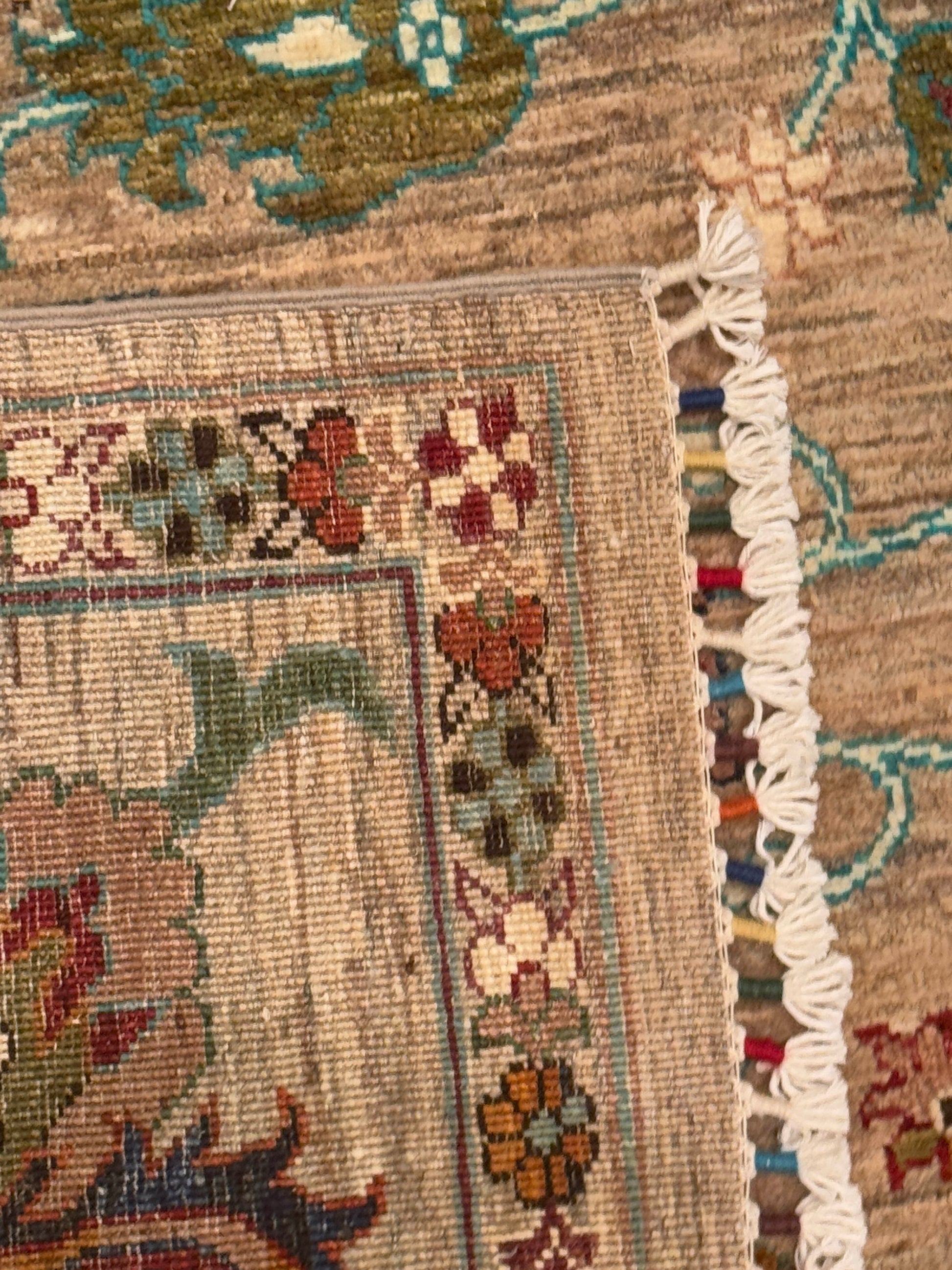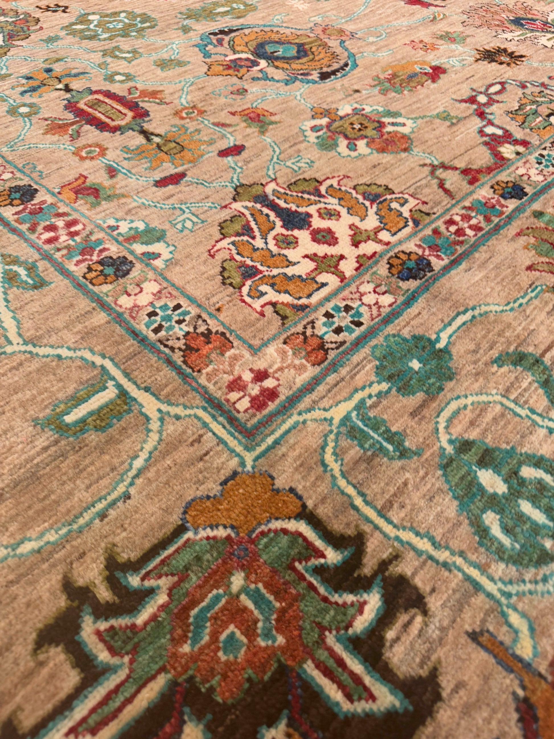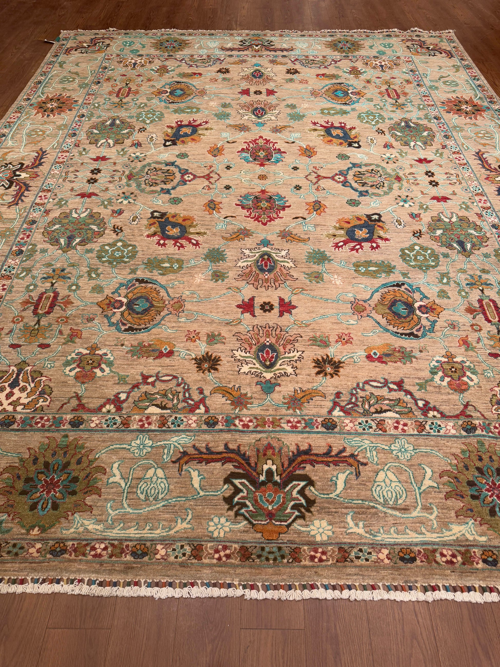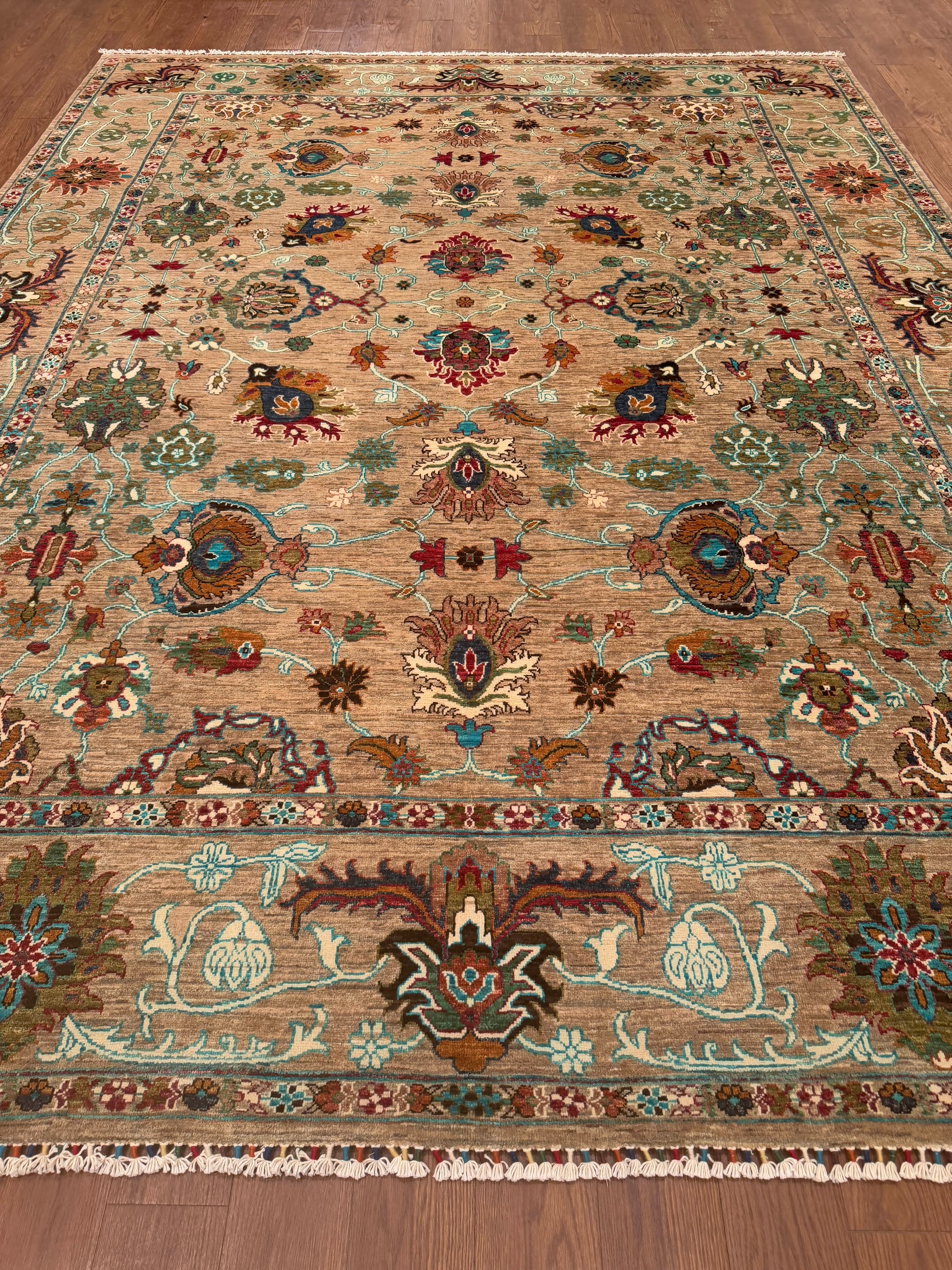 This exquisite handwoven piece features a soft tan field adorned with intricate floral and vine motifs in teal, rose, gold, and ivory. The open, flowing design gives a sense of movement and balance, while the delicate border adds depth and sophistication. Its harmonious palette and refined craftsmanship make it an elegant centerpiece for both traditional and transitional interiors.
