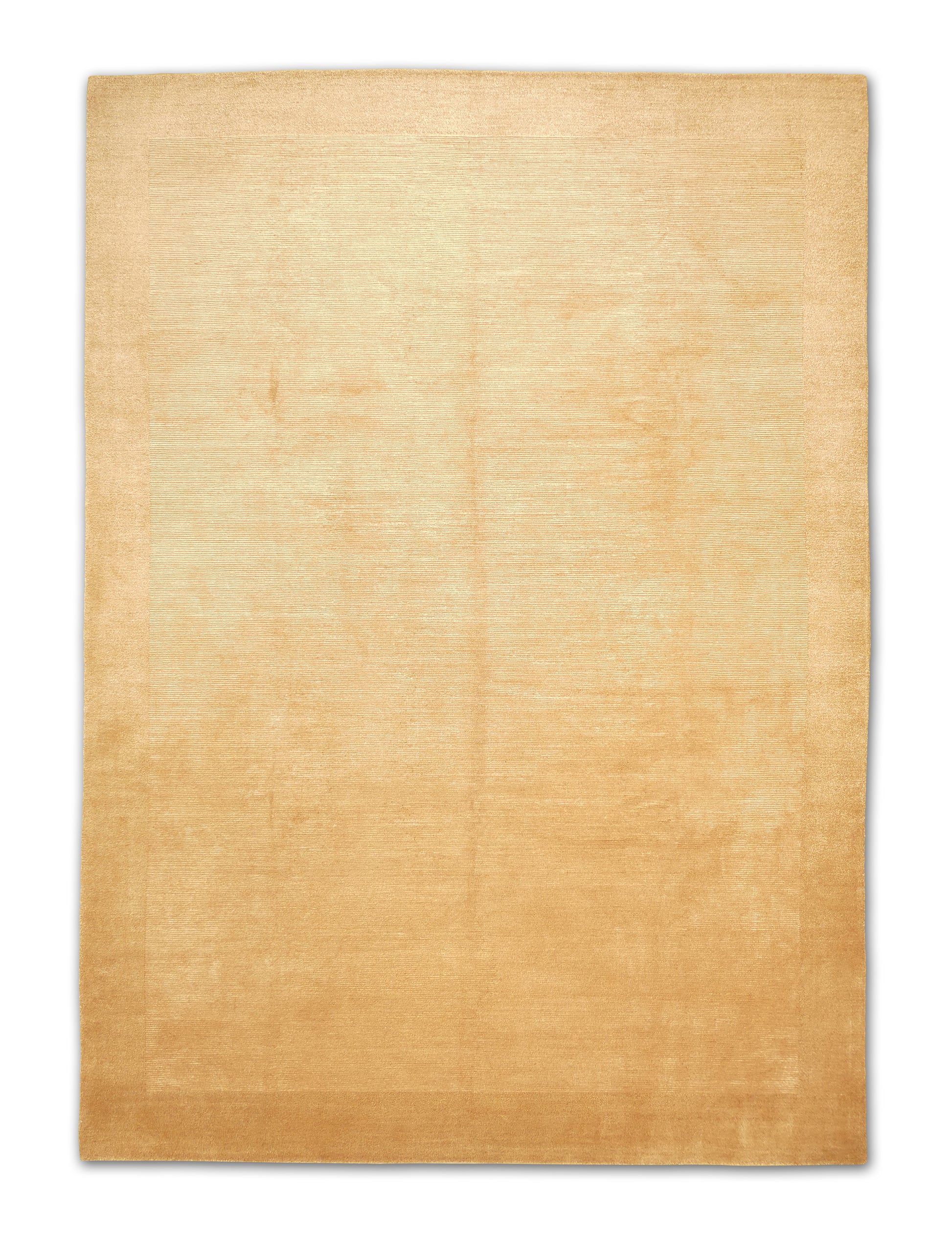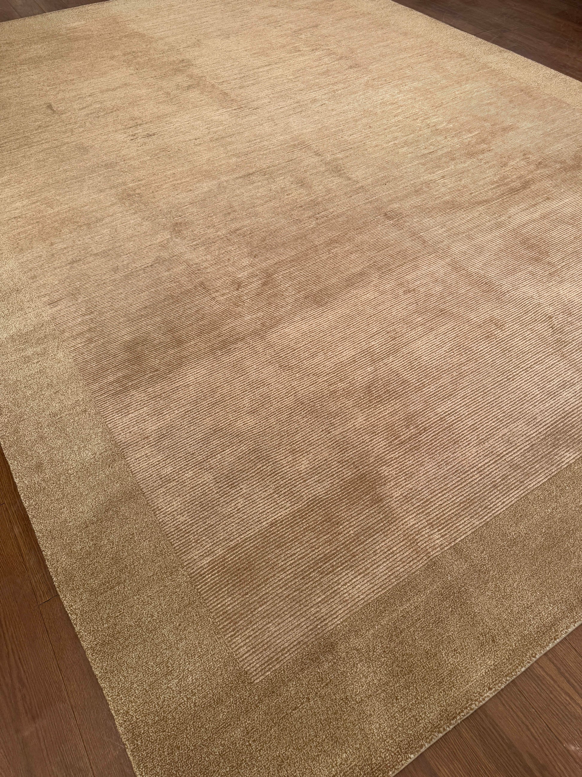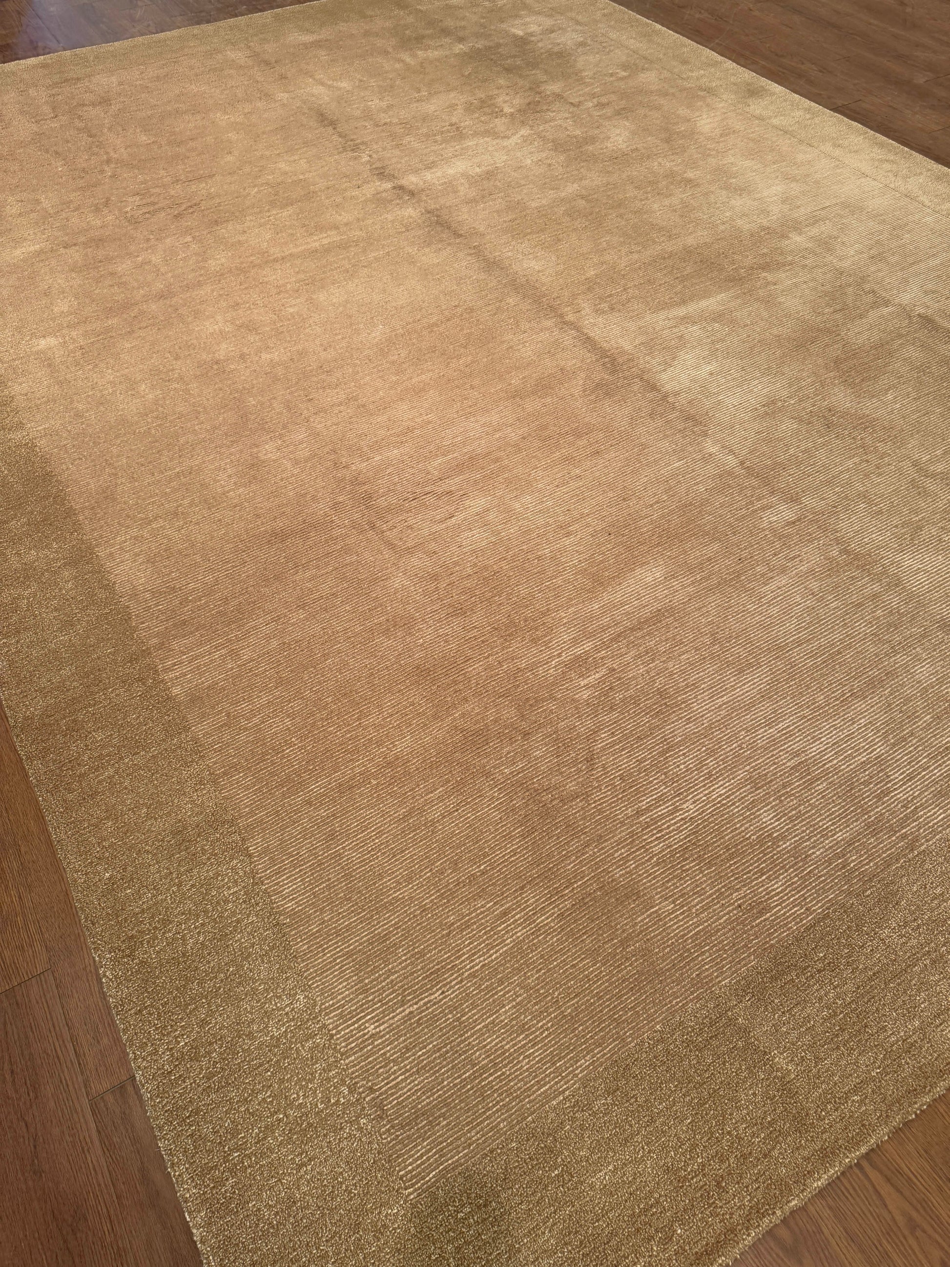 This minimalist handwoven rug offers a warm, understated elegance with its solid golden-brown field and subtle tonal border. The soft sheen and fine texture create a luxurious foundation that complements both contemporary and traditional interiors. Its simplicity and rich tone make it a versatile piece for anchoring any space.