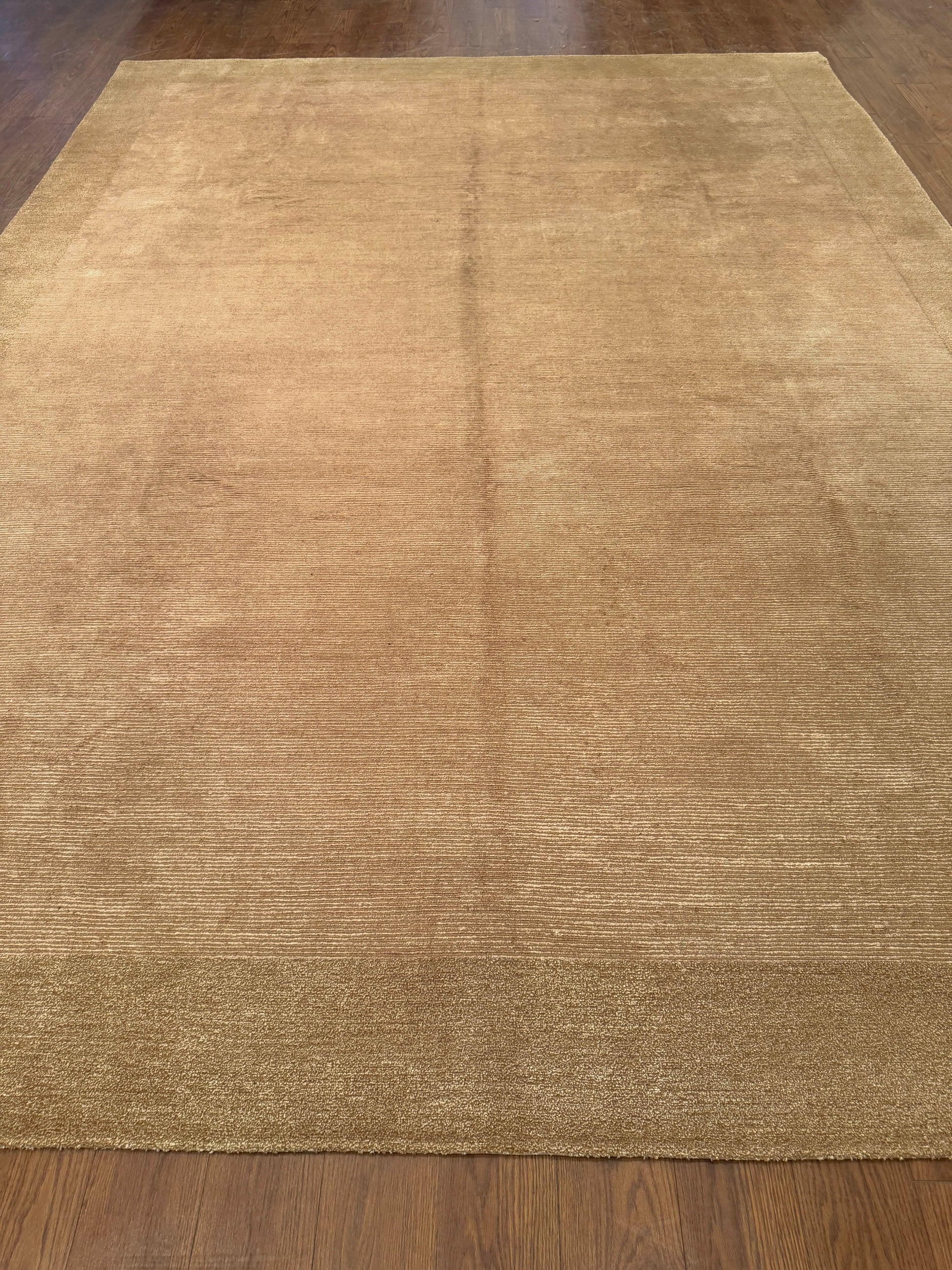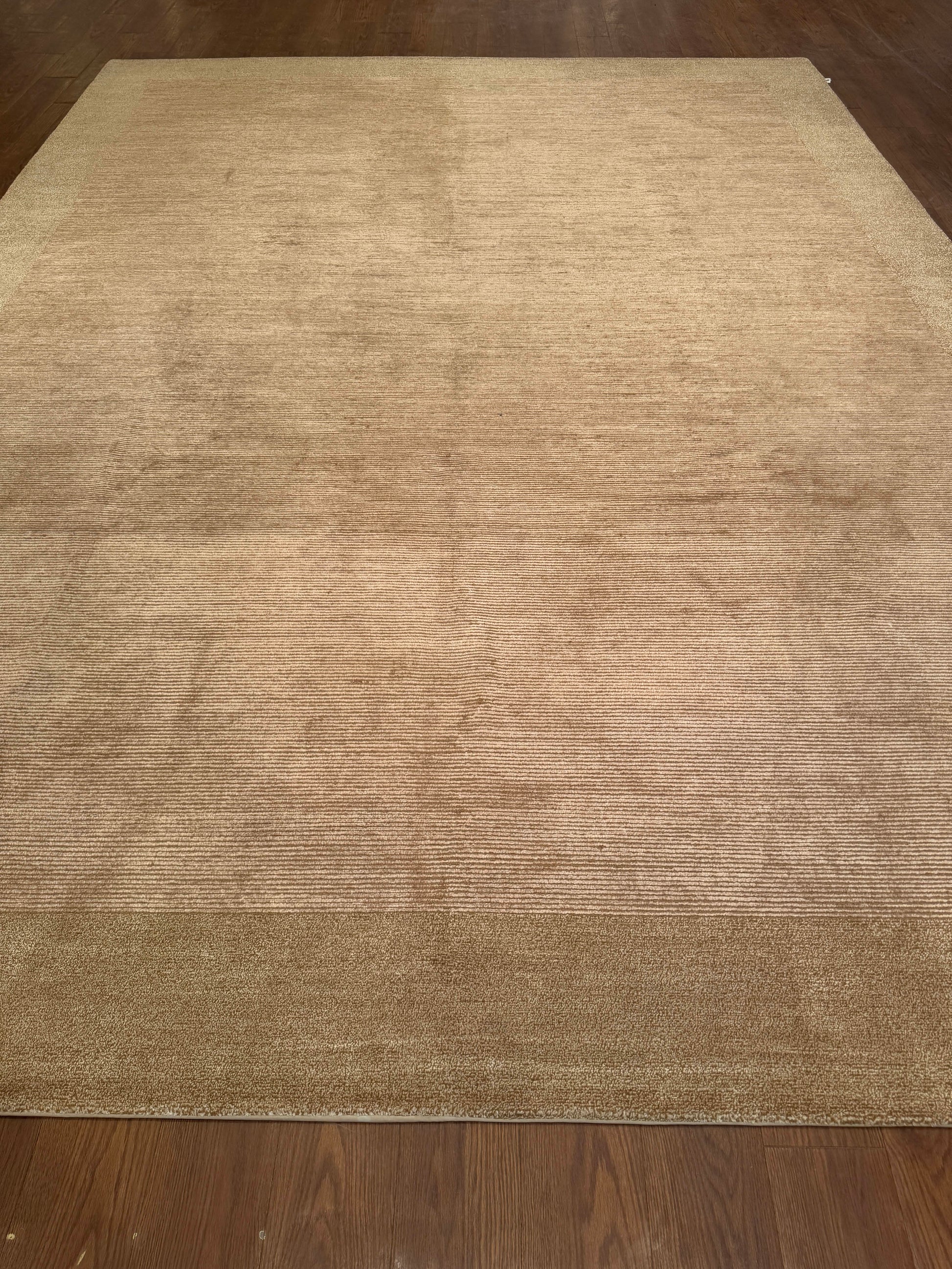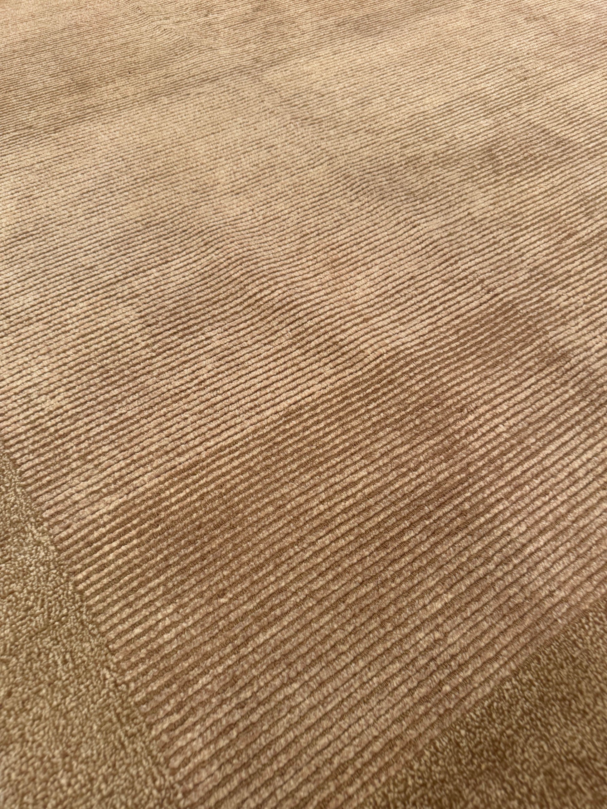 This minimalist handwoven rug offers a warm, understated elegance with its solid golden-brown field and subtle tonal border. The soft sheen and fine texture create a luxurious foundation that complements both contemporary and traditional interiors. Its simplicity and rich tone make it a versatile piece for anchoring any space.