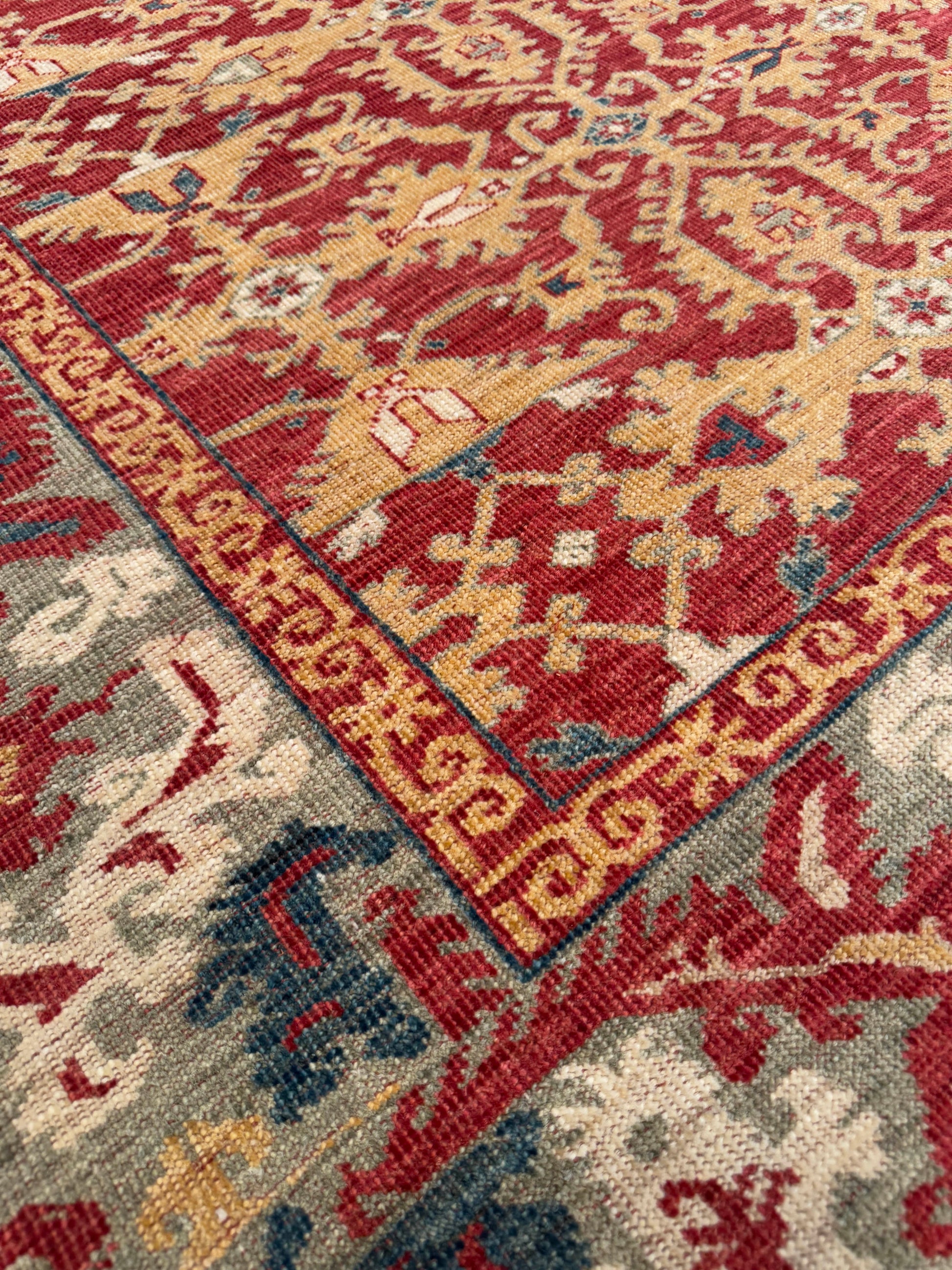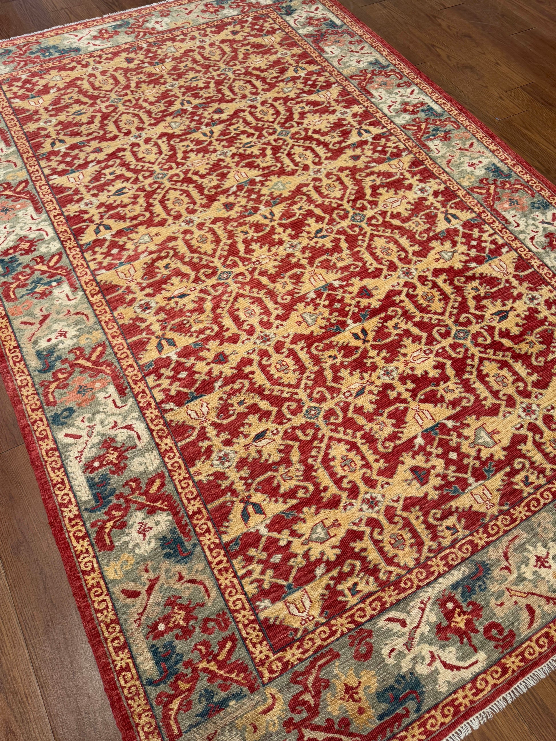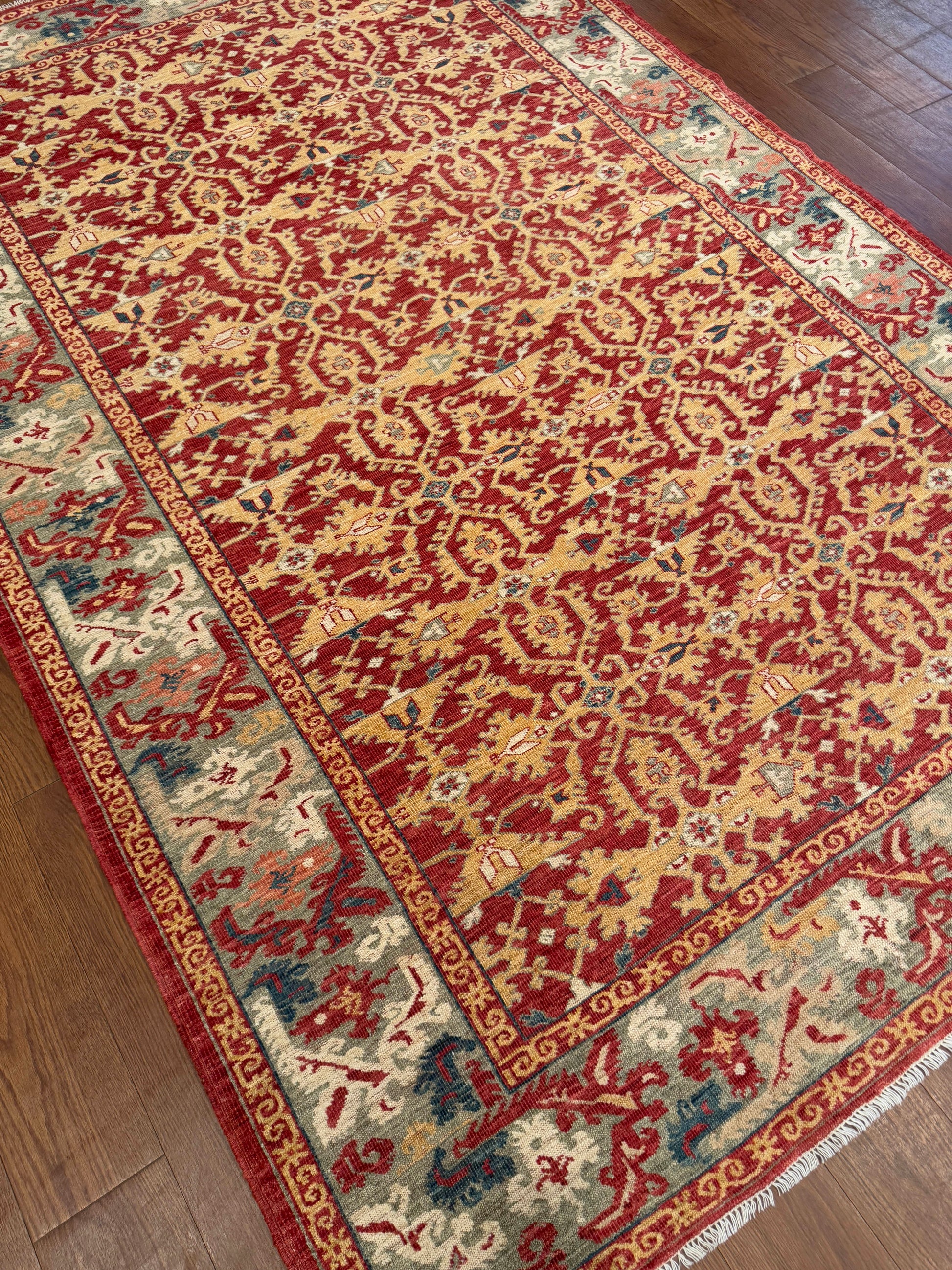 This hand-knotted rug showcases a repeating all-over design with scrolling vines and stylized floral medallions arranged in a lattice-like layout. The warm red field contrasts beautifully with soft gold, ivory, and sage accents, giving the rug a refined yet bold presence. A wide border frames the composition with intricate floral and vine motifs, enhancing its traditional aesthetic. The balanced symmetry and striking palette make it a versatile piece for both classic and eclectic interiors.