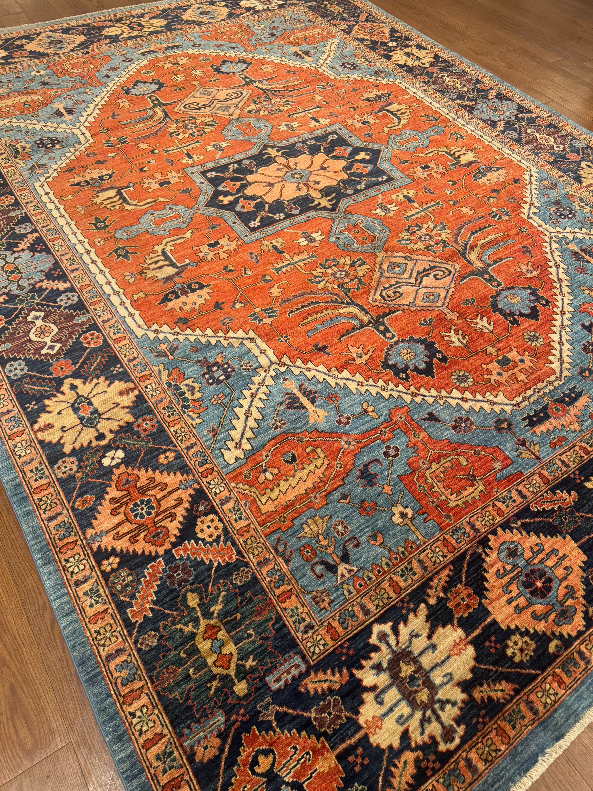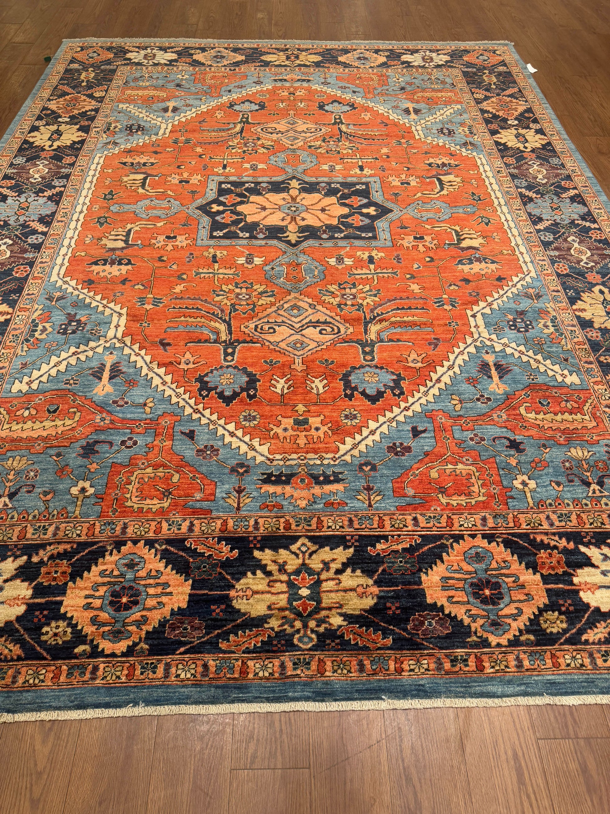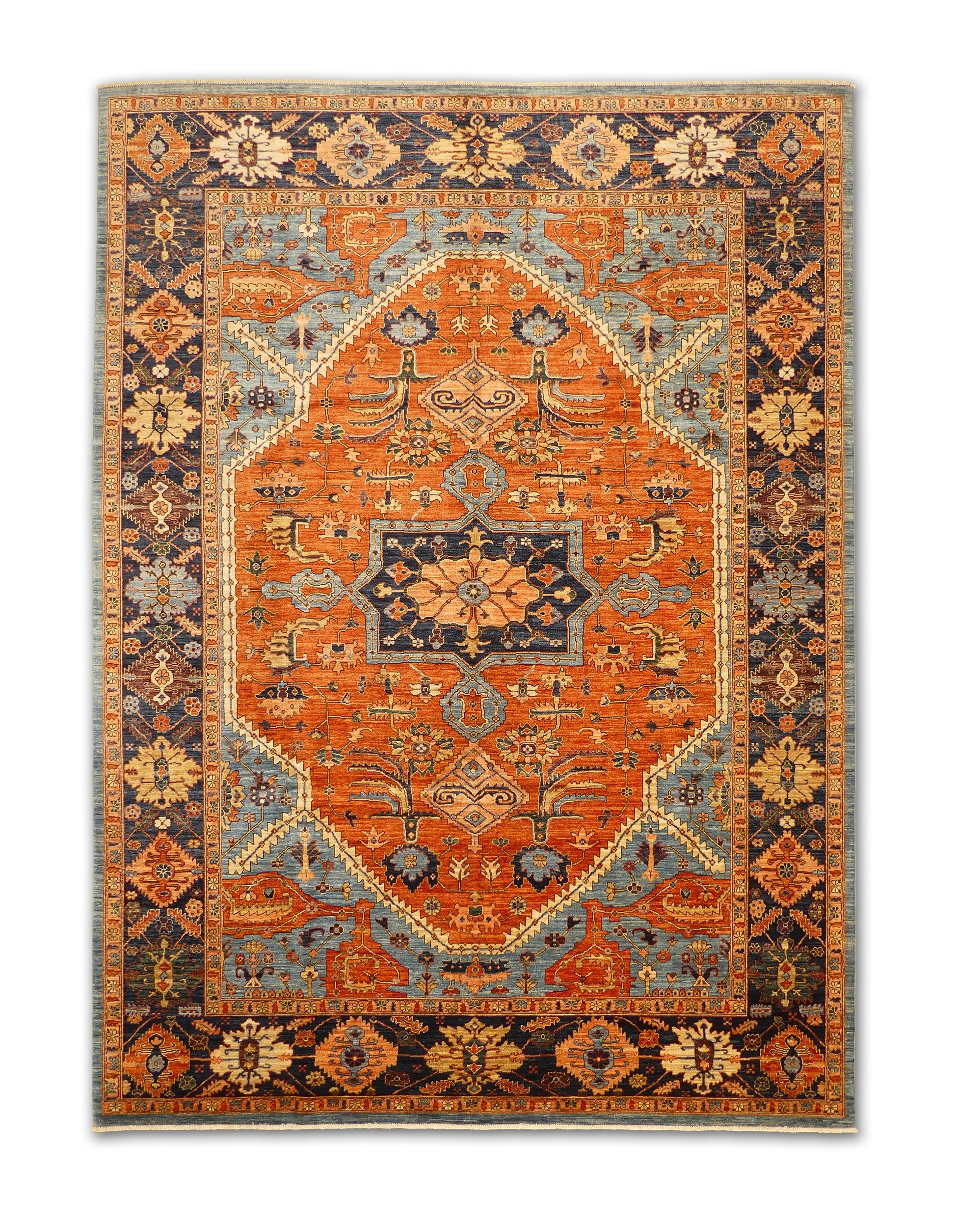 This handmade rug features a commanding central medallion surrounded by stylized floral motifs and bold geometric accents. The vibrant terracotta field is beautifully balanced by soft blue corners and a deep navy border, creating a rich interplay of color and contrast. Its intricate design and earthy tones make it a stunning centerpiece for both traditional and transitional interiors.
