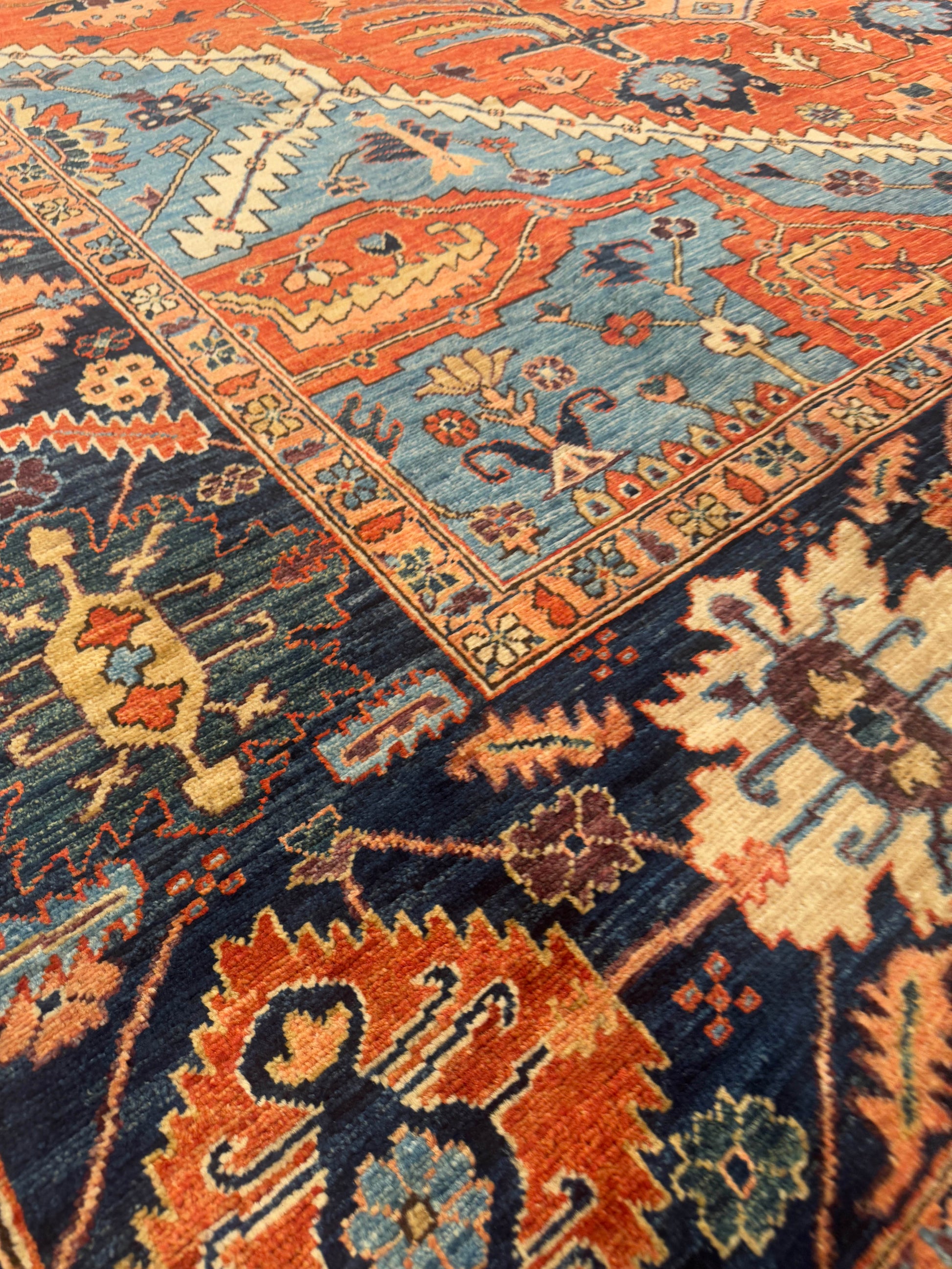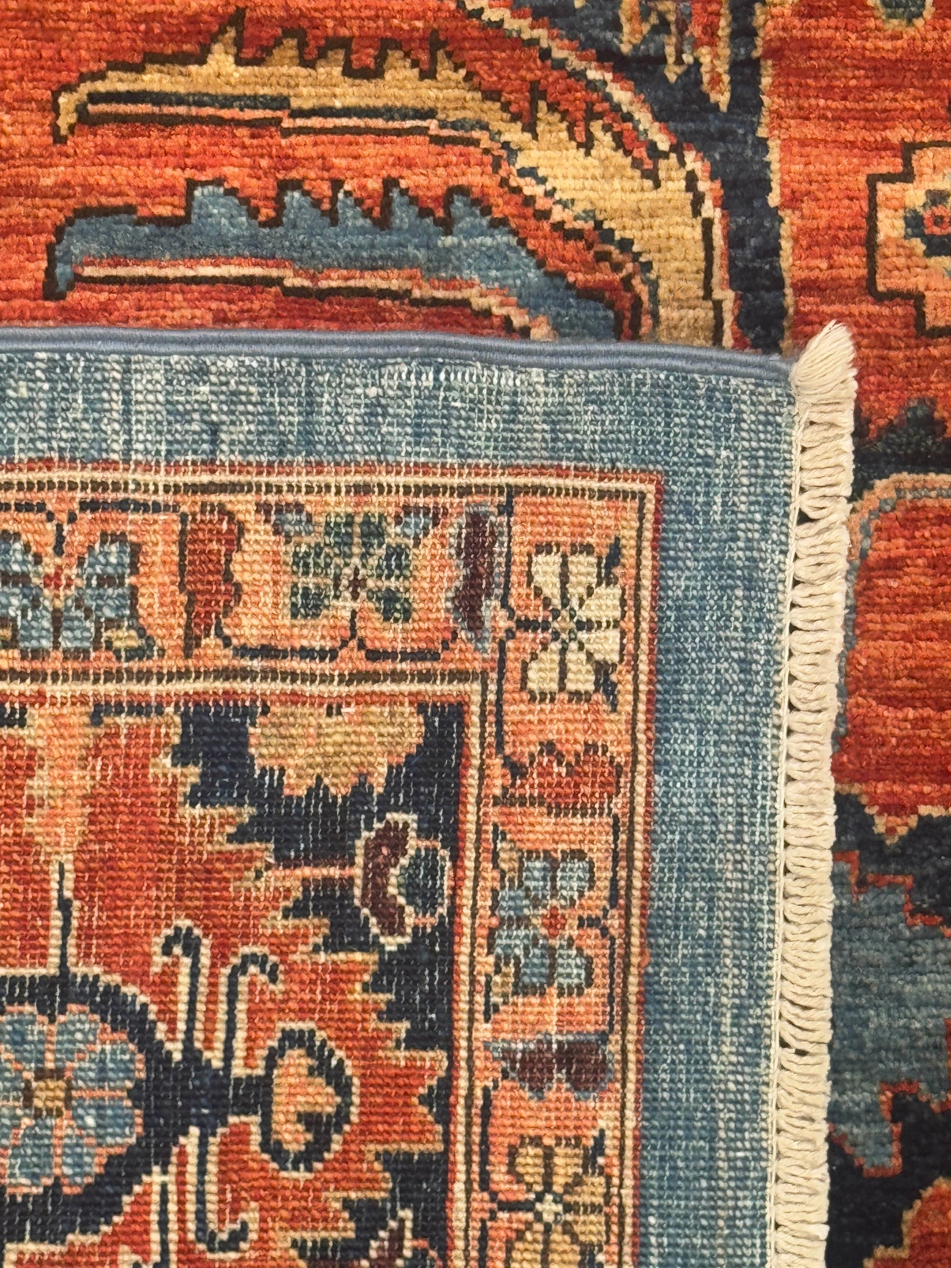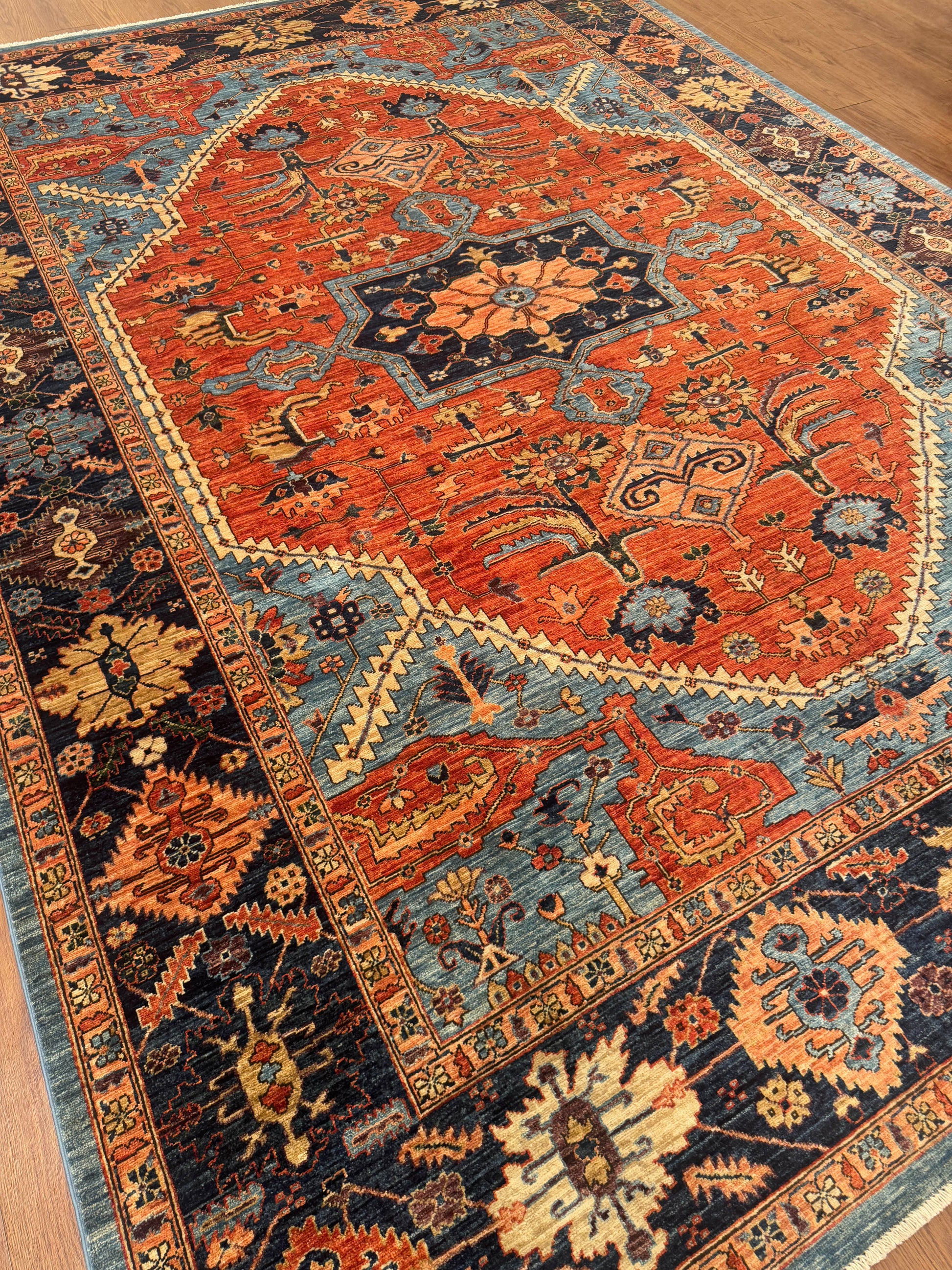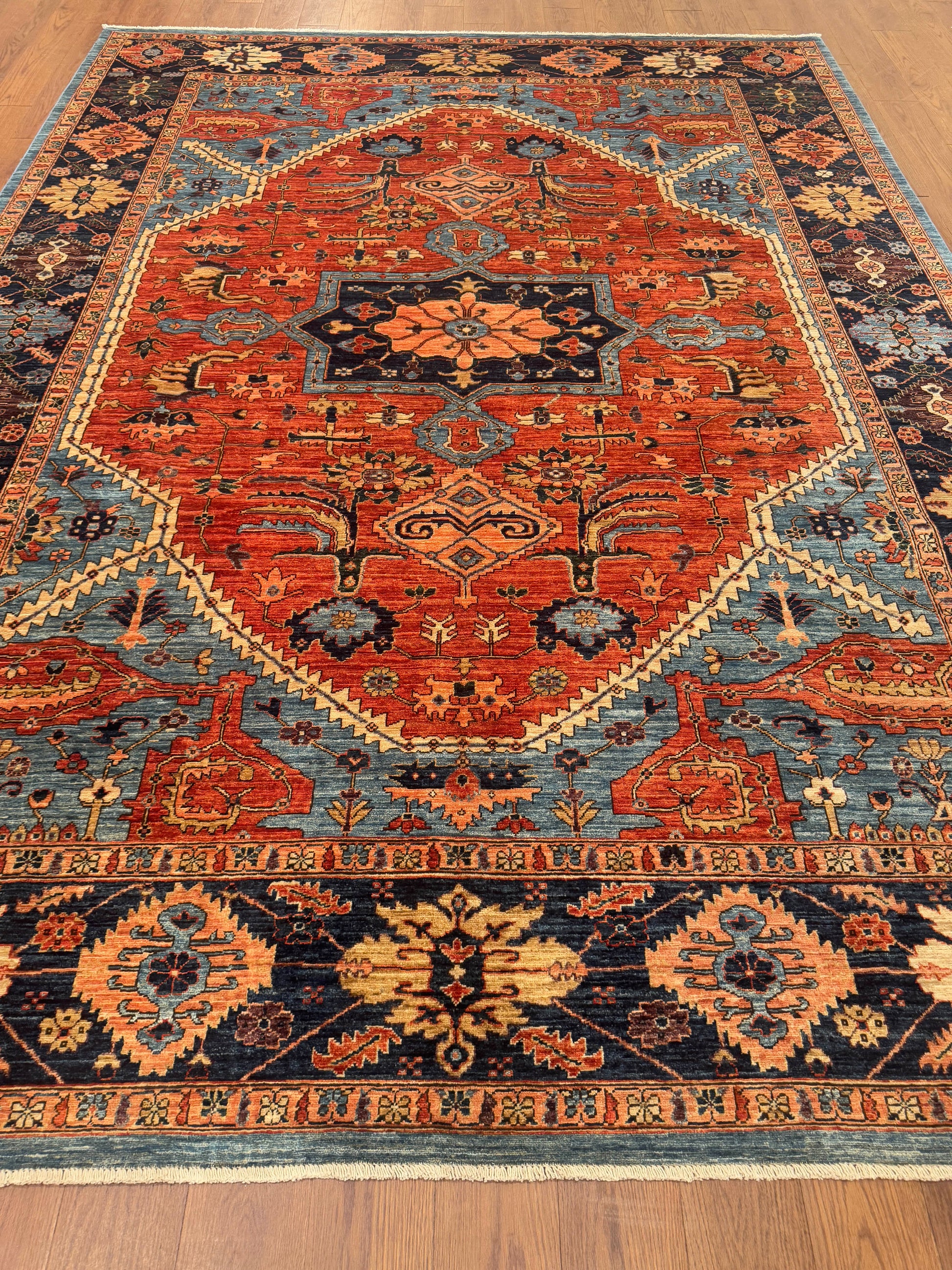 This handmade rug features a commanding central medallion surrounded by stylized floral motifs and bold geometric accents. The vibrant terracotta field is beautifully balanced by soft blue corners and a deep navy border, creating a rich interplay of color and contrast. Its intricate design and earthy tones make it a stunning centerpiece for both traditional and transitional interiors.