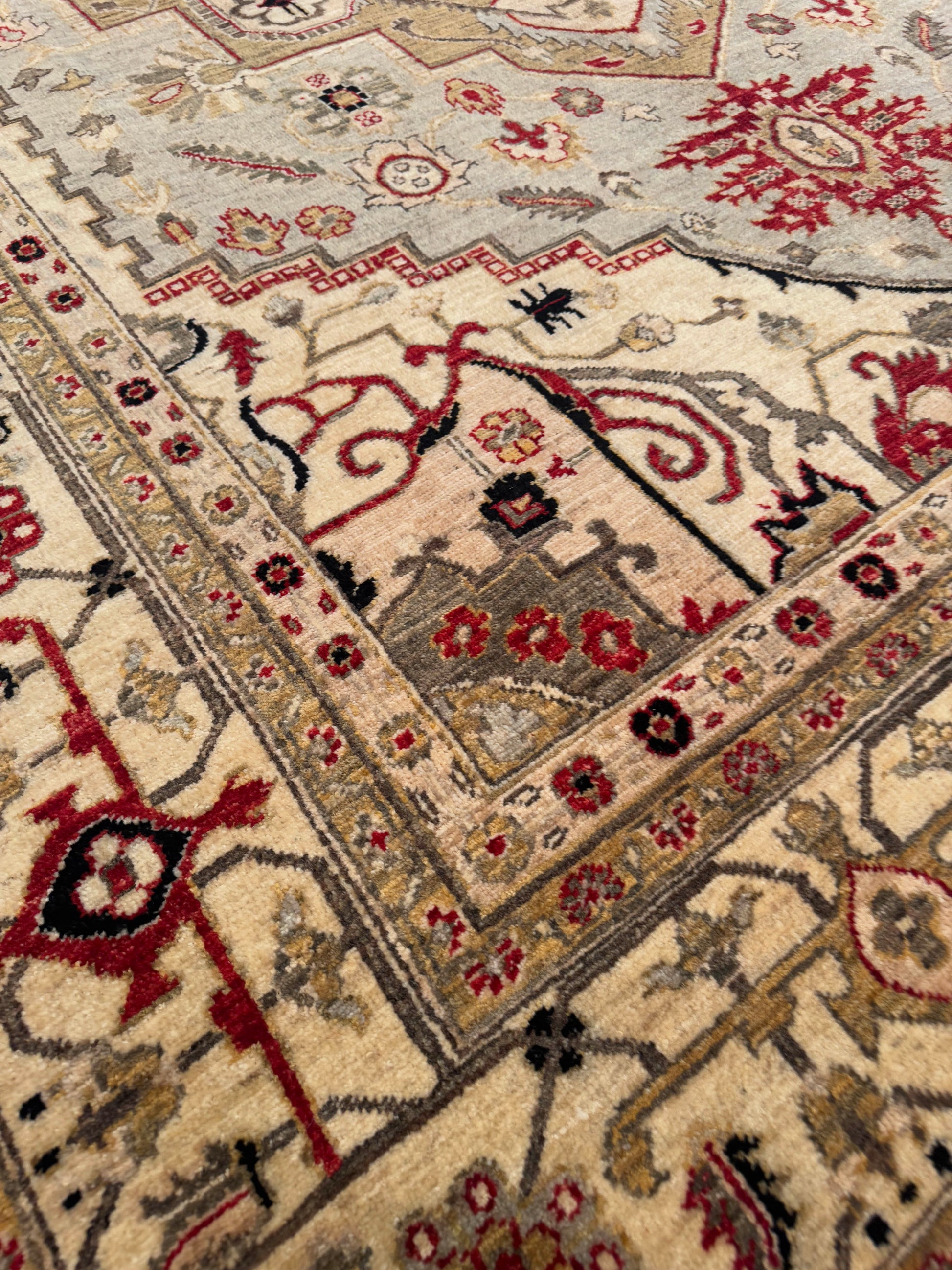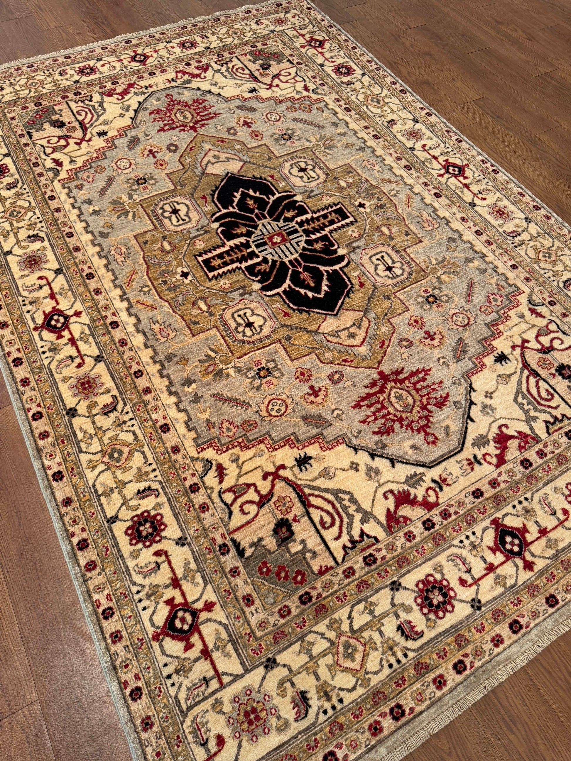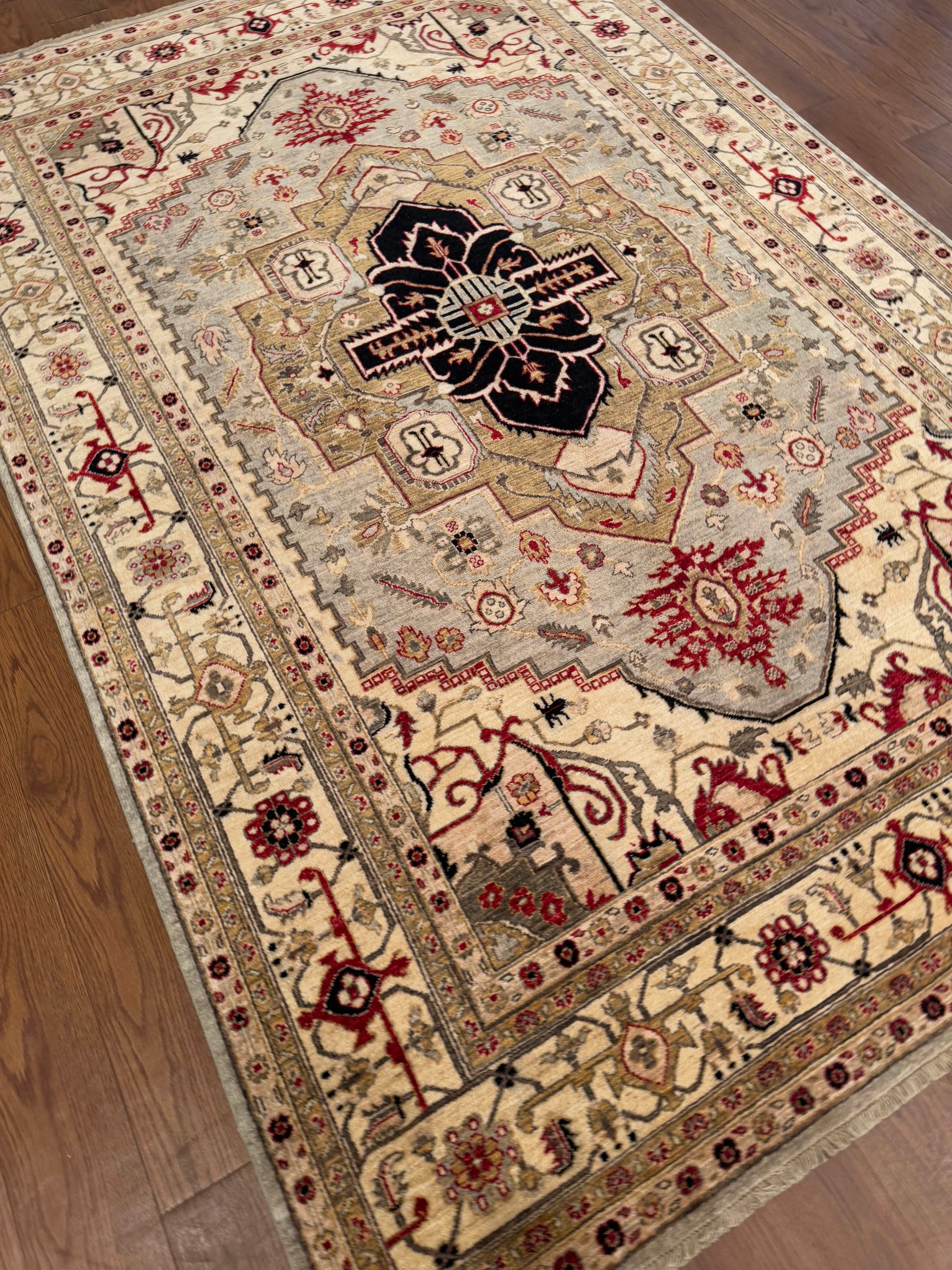 This striking hand-knotted rug features a bold central medallion framed by intricate floral and geometric motifs. Rich tones of deep red, ivory, black, gold, and soft gray create a dramatic yet elegant look. The detailed border enhances its grandeur, making it a timeless piece for both traditional and transitional interiors.
