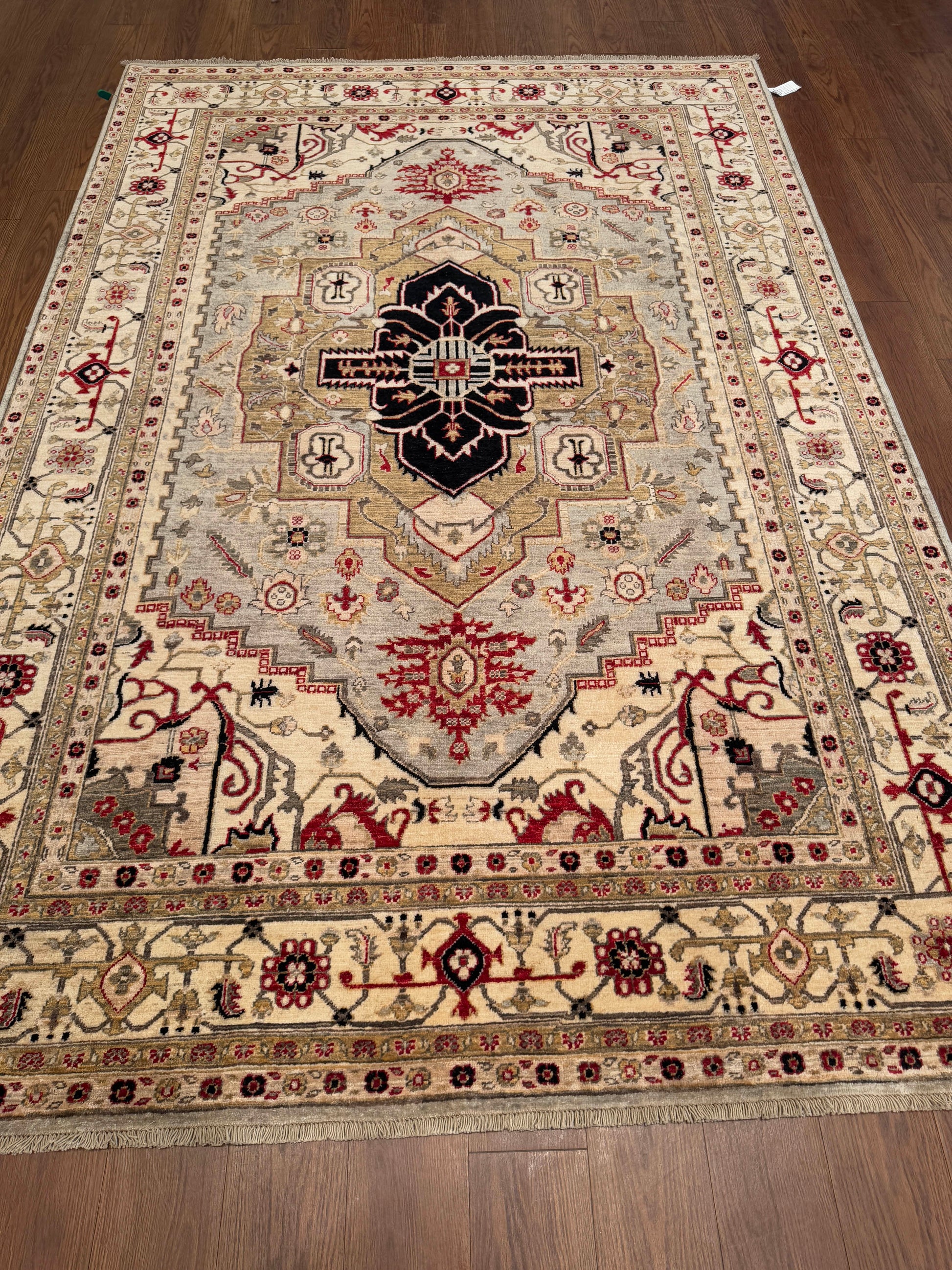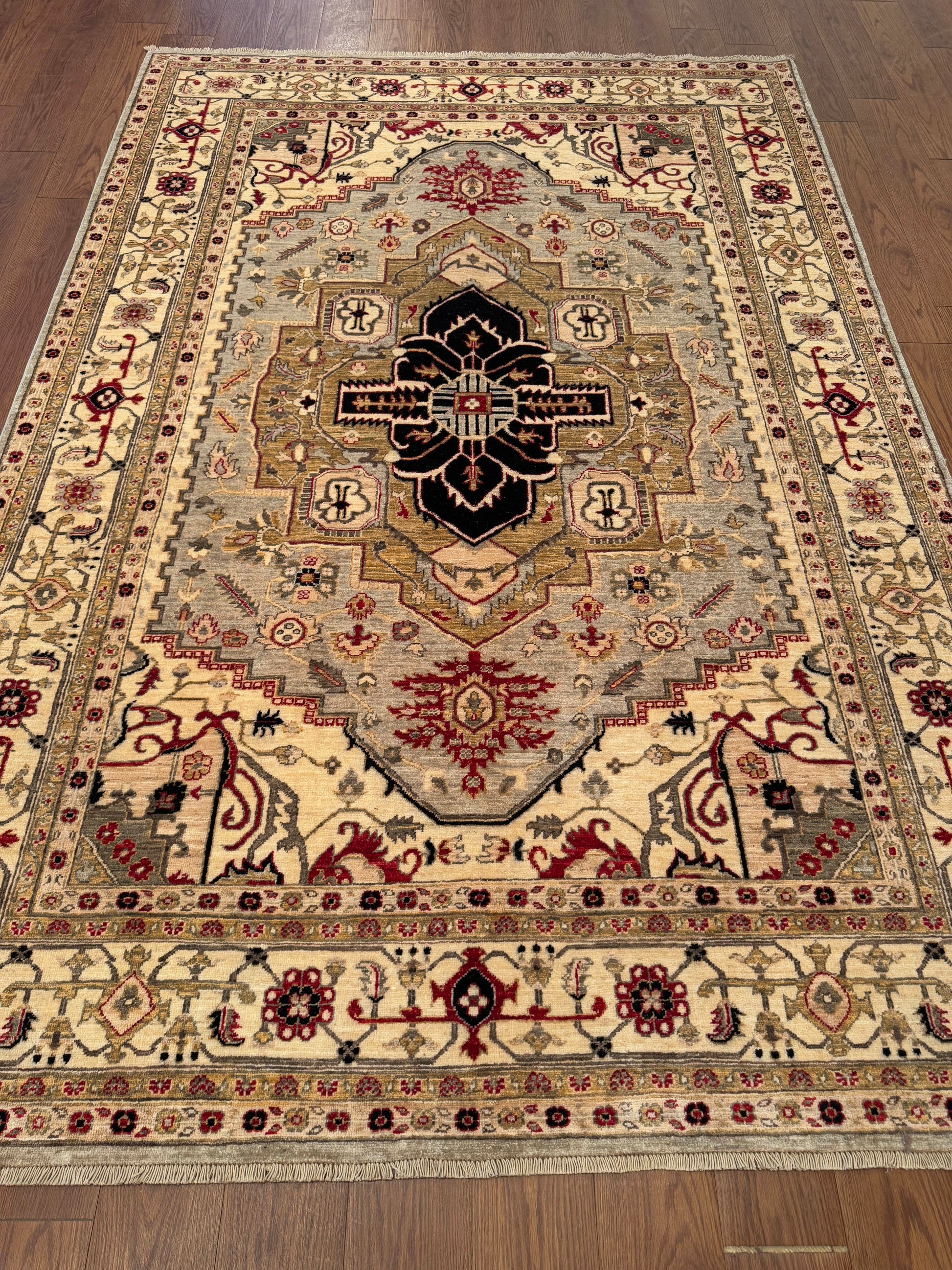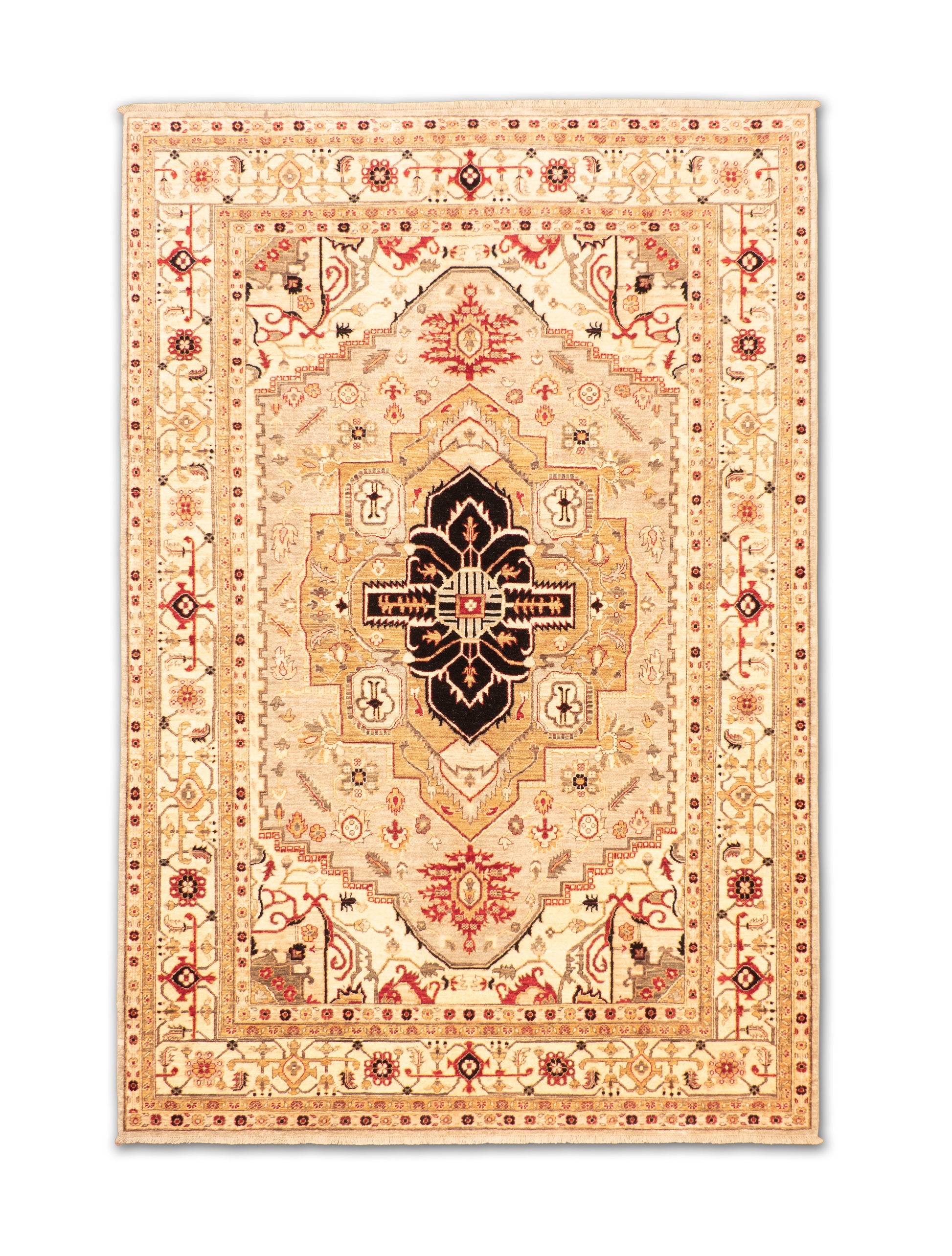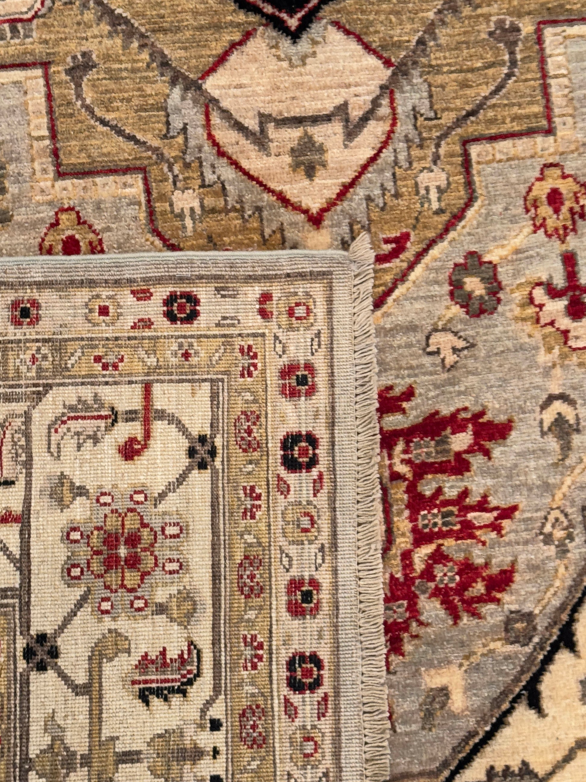 This striking hand-knotted rug features a bold central medallion framed by intricate floral and geometric motifs. Rich tones of deep red, ivory, black, gold, and soft gray create a dramatic yet elegant look. The detailed border enhances its grandeur, making it a timeless piece for both traditional and transitional interiors.