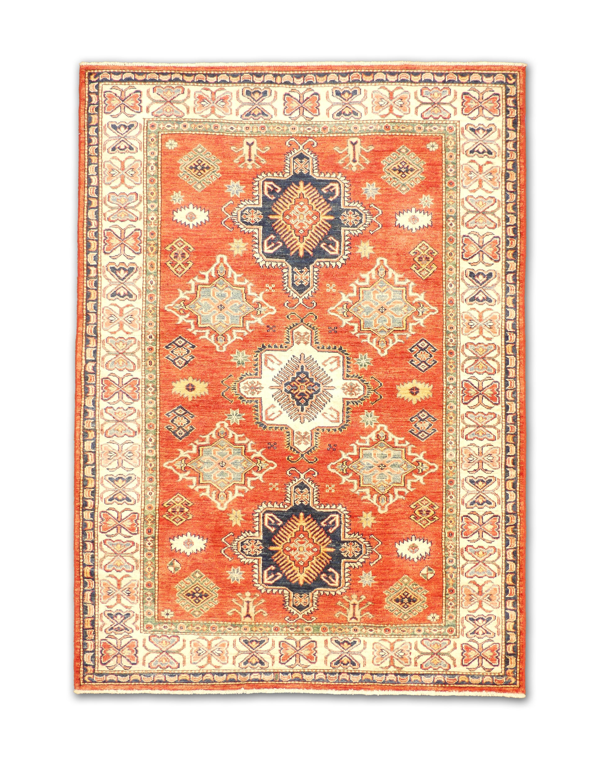 This rug features a bold red field highlighted by three large geometric medallions in navy, ivory, and gold. Smaller tribal motifs in turquoise, green, and yellow add contrast and rhythm, while the ivory border showcases a repeating butterfly-like pattern outlined in deep blue and red. The vibrant palette and geometric arrangement evoke the energy of traditional Caucasian tribal weaving, while the symmetry keeps it visually balanced.