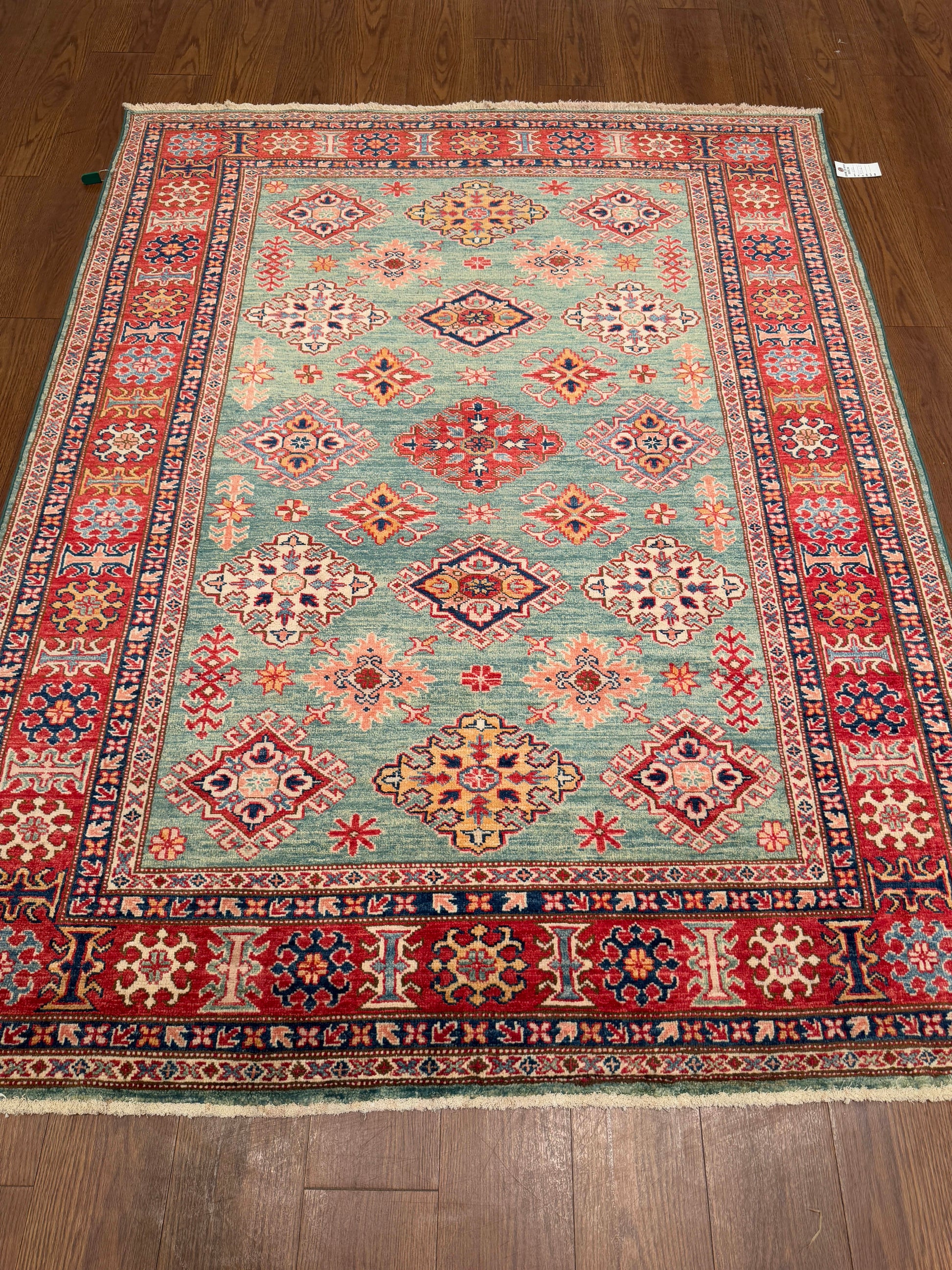 This rug displays a striking turquoise-green field decorated with an array of geometric medallions in warm shades of red, gold, ivory, and navy. The vibrant design is framed by a bold red border with intricate repeating motifs, creating strong visual contrast and depth. The combination of tribal elements and a lively color palette makes it a versatile piece that can energize both traditional and modern interiors.