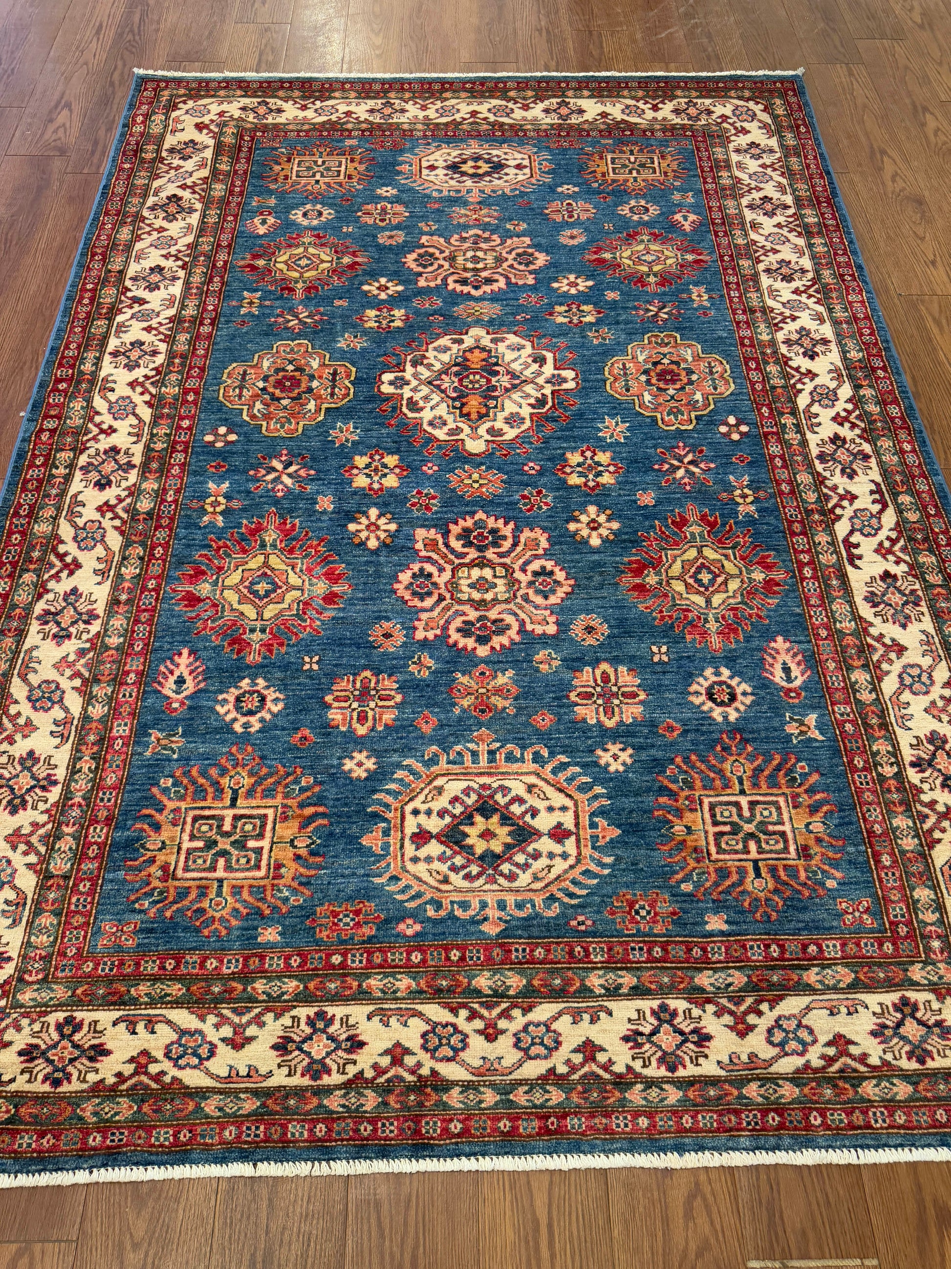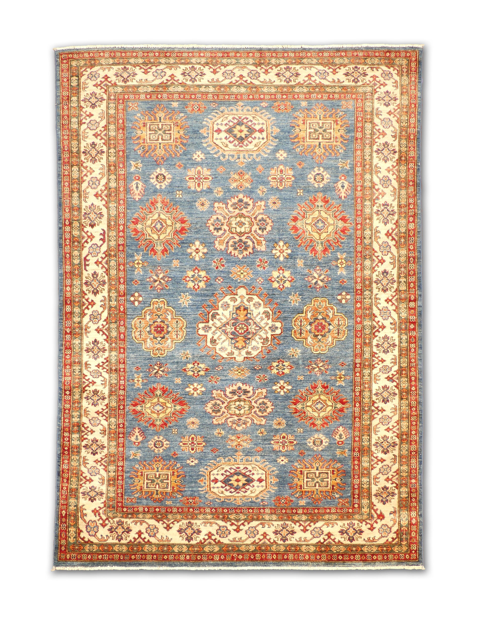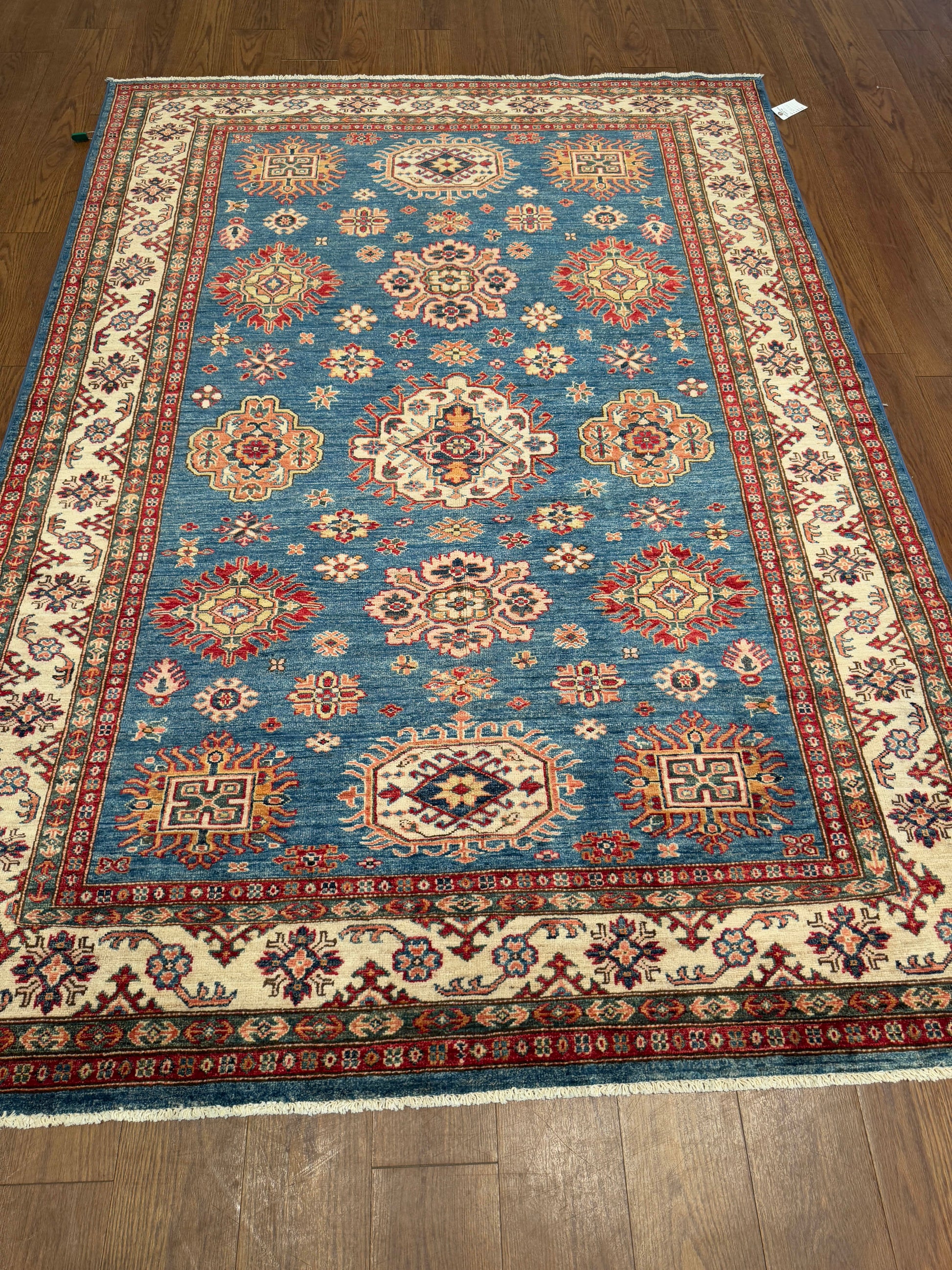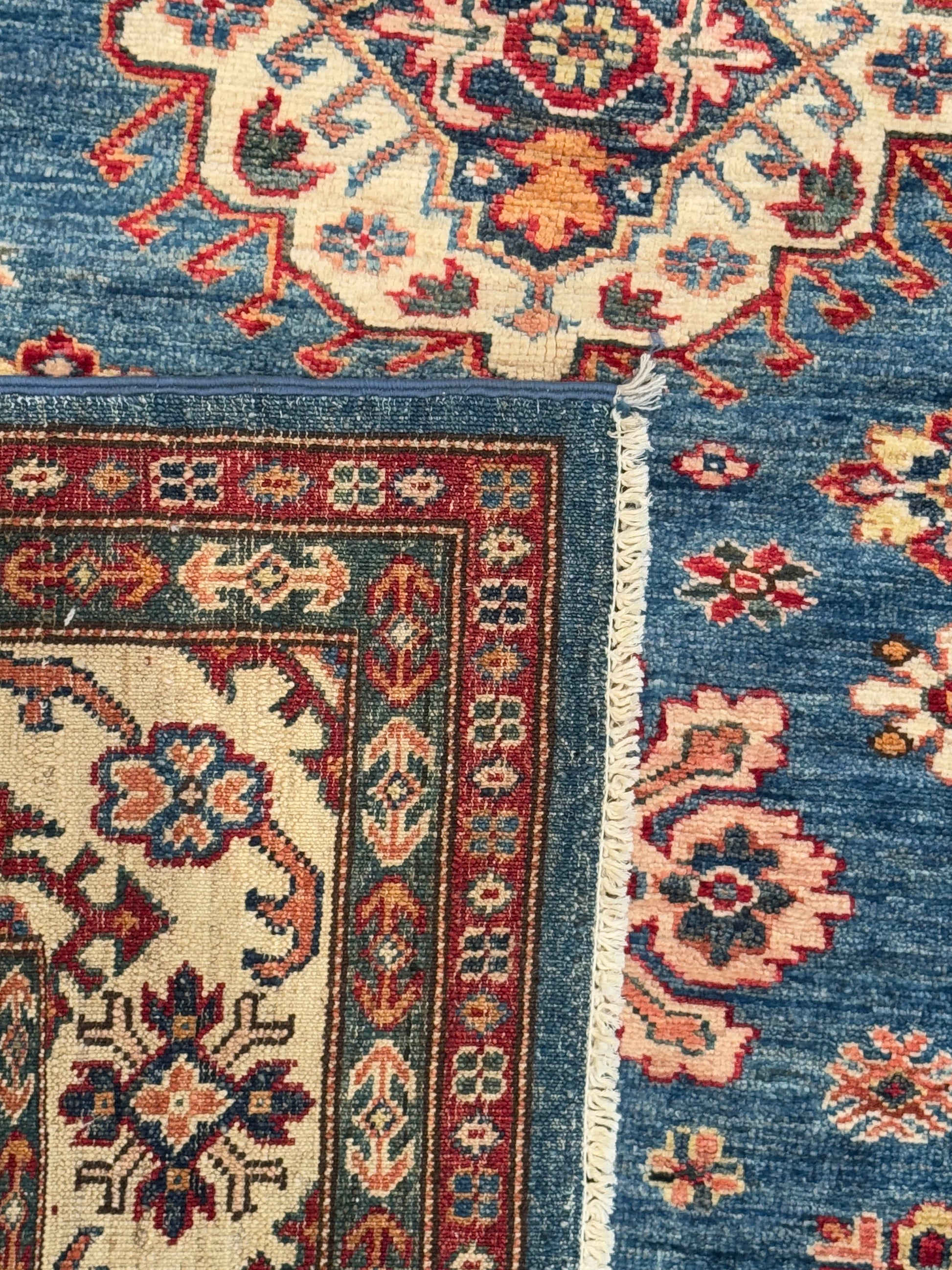 This rug features a bold sky-blue field enriched with intricate medallions and floral-inspired motifs in ivory, rust red, navy, and golden tones. Its detailed patterning is framed by a striking ivory border filled with stylized blossoms and vines, adding balance and refinement to the vibrant center. The combination of vivid colors and timeless tribal geometry makes it a standout decorative piece.