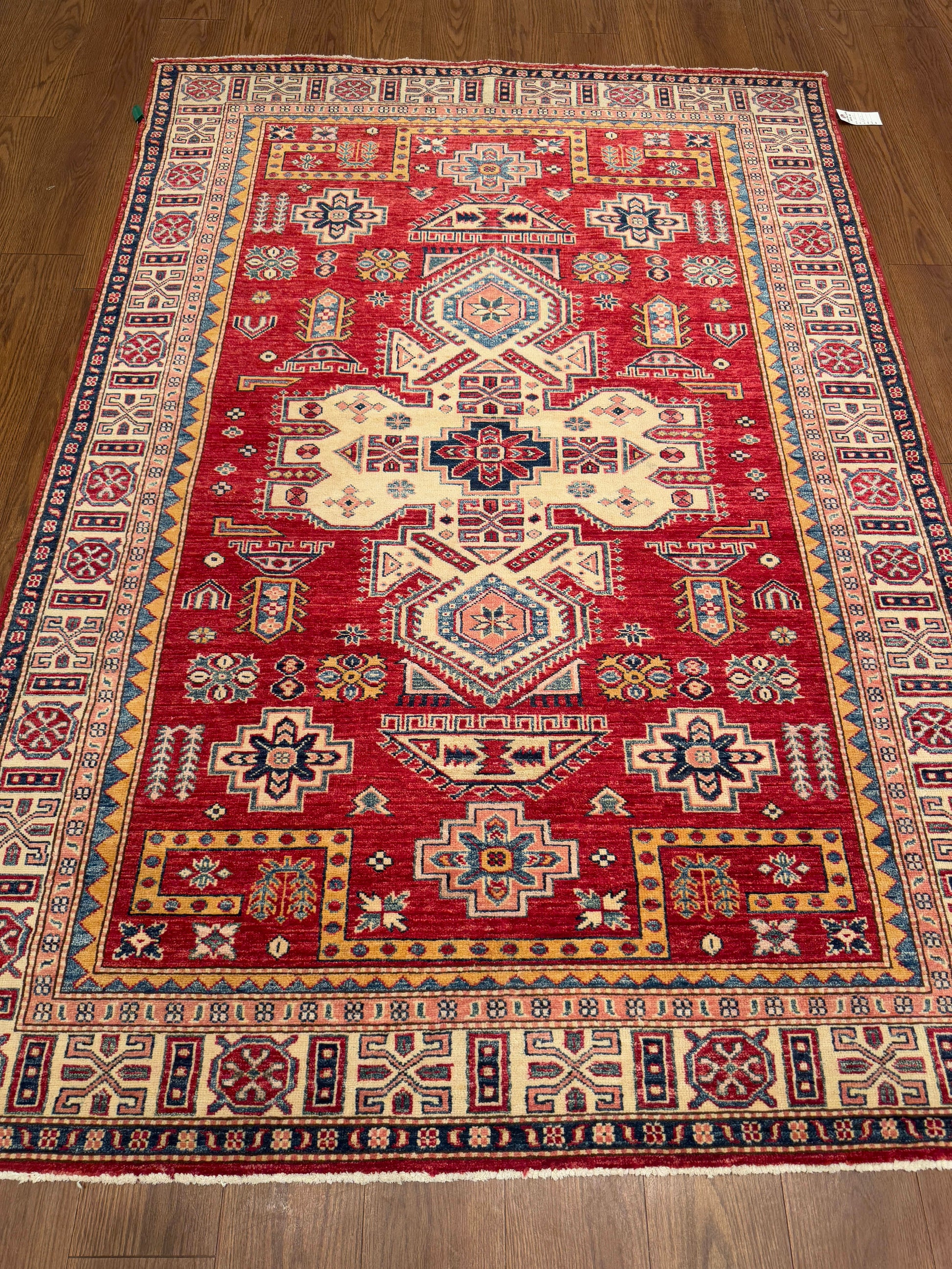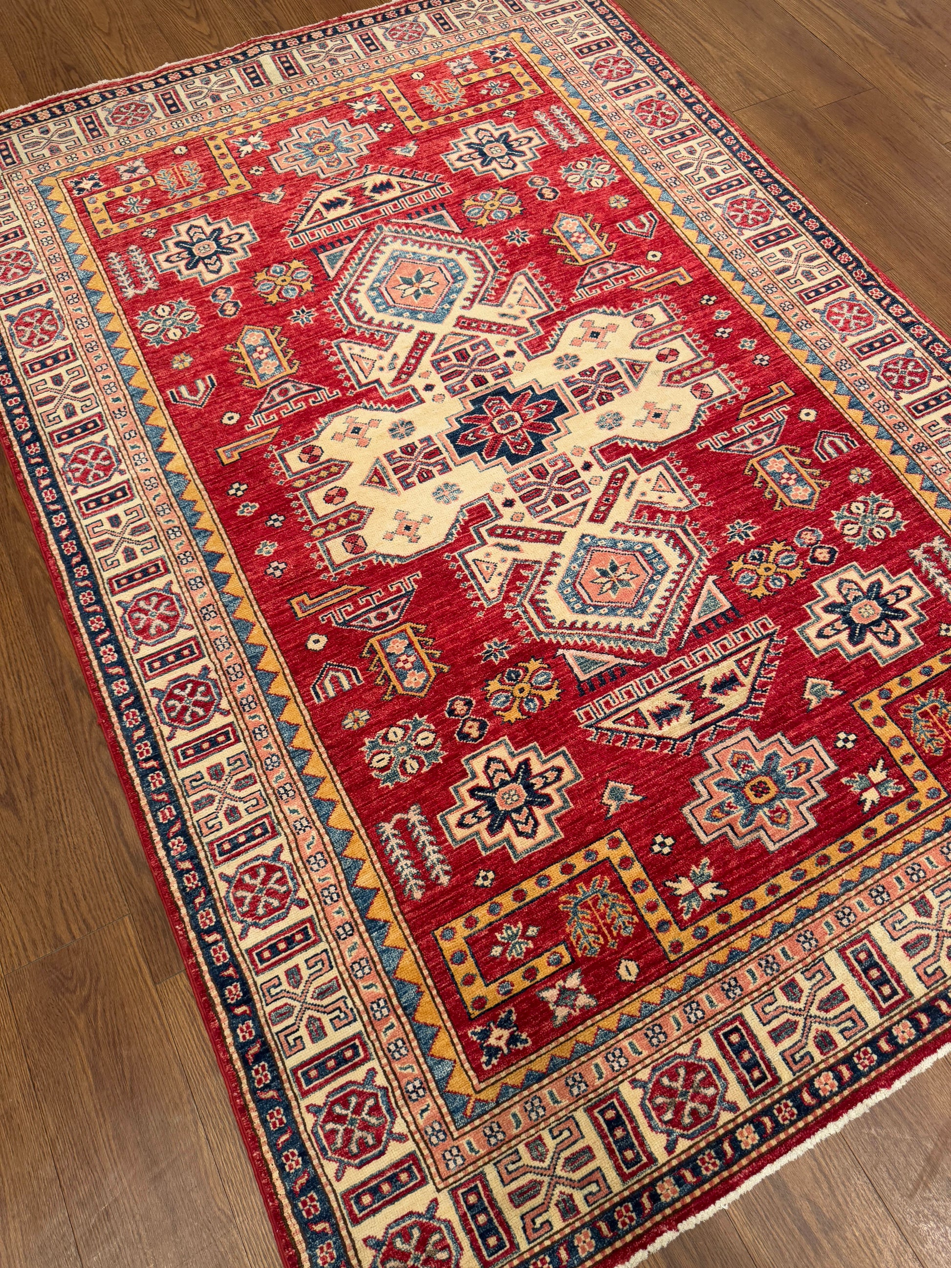 This rug presents a vivid geometric composition, highlighted by a large ivory medallion in the center that contrasts beautifully with the bold red field. The design is enriched with smaller tribal motifs, floral-inspired geometric figures, and symbolic star patterns in shades of navy, gold, and soft blue. Its multiple borders, decorated with intricate repeating motifs, frame the rug with balance and rhythm.