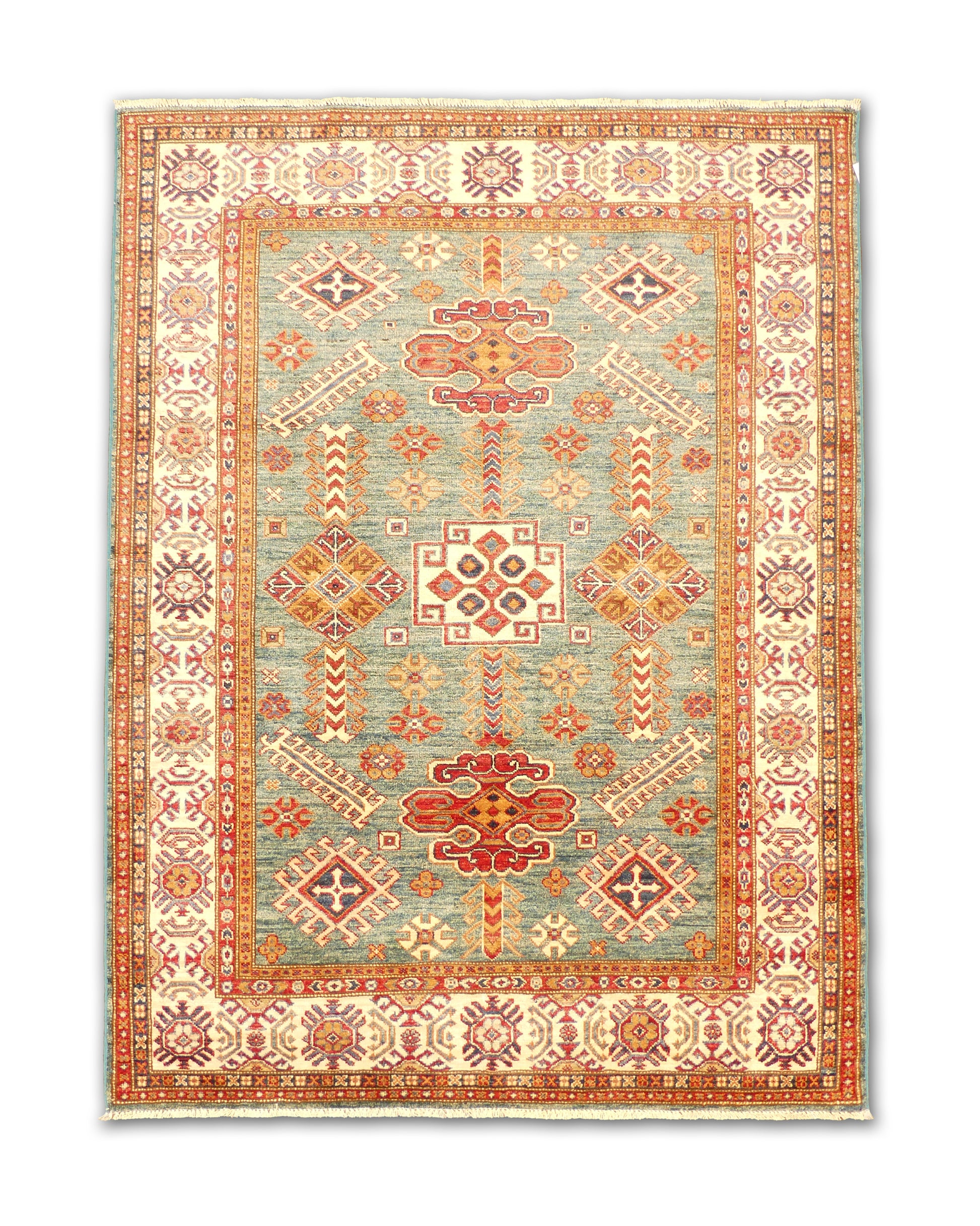 This handwoven rug showcases a striking geometric layout set against a teal-blue field, accented with rich red, ivory, and golden details. The medallions and motifs are arranged with rhythmic precision, creating balance and depth. The intricate borders frame the design beautifully, lending a timeless character that blends both boldness and elegance.