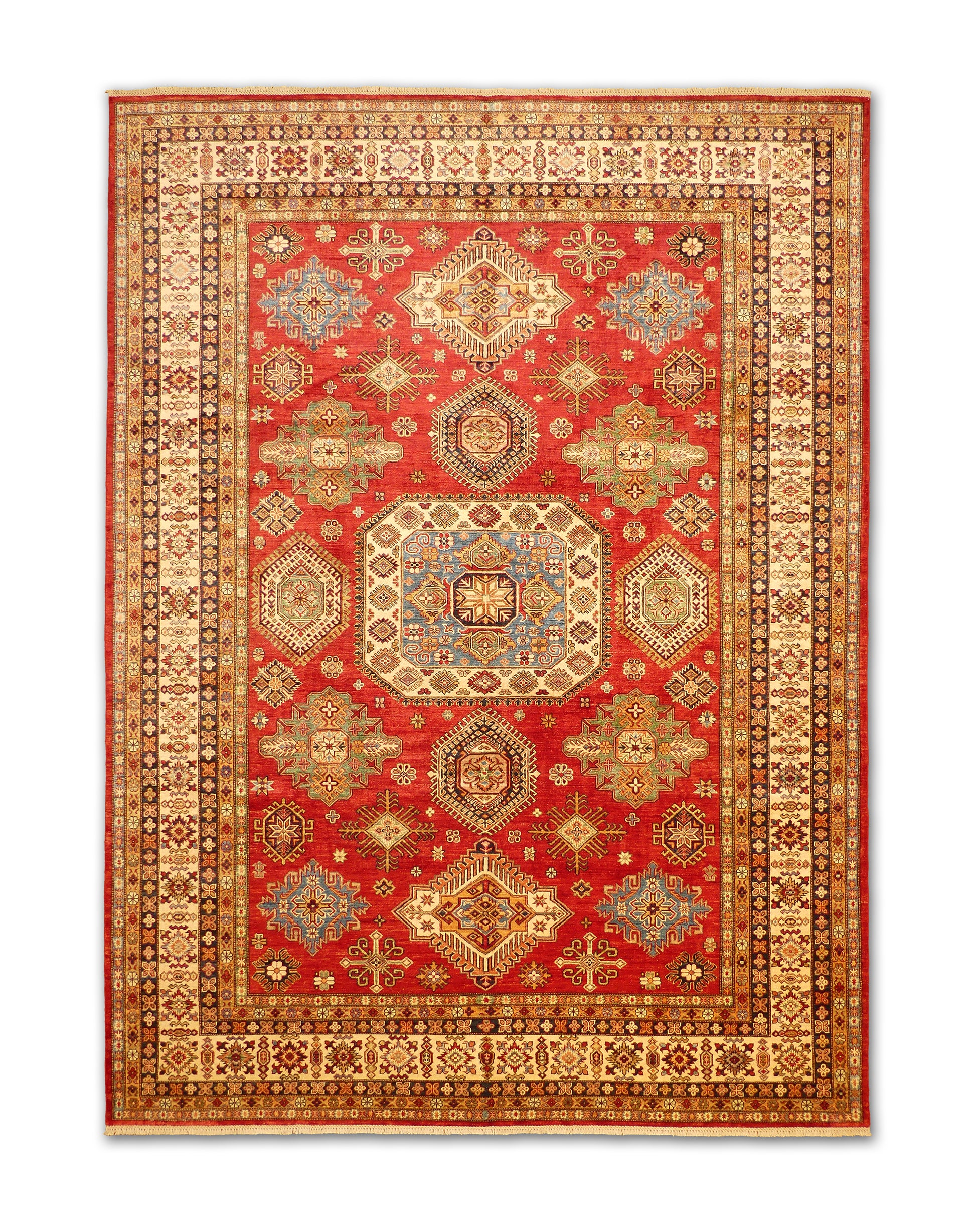 This handmade rug features a captivating geometric medallion design on a bold crimson red field, accented with shades of ivory, sky blue, gold, and forest green. Intricate motifs and fine detailing create a sense of rhythm and symmetry, while the contrasting border adds a touch of elegance. Crafted from soft wool, it blends timeless craftsmanship with vibrant color — perfect for adding depth and warmth to any sophisticated interior.