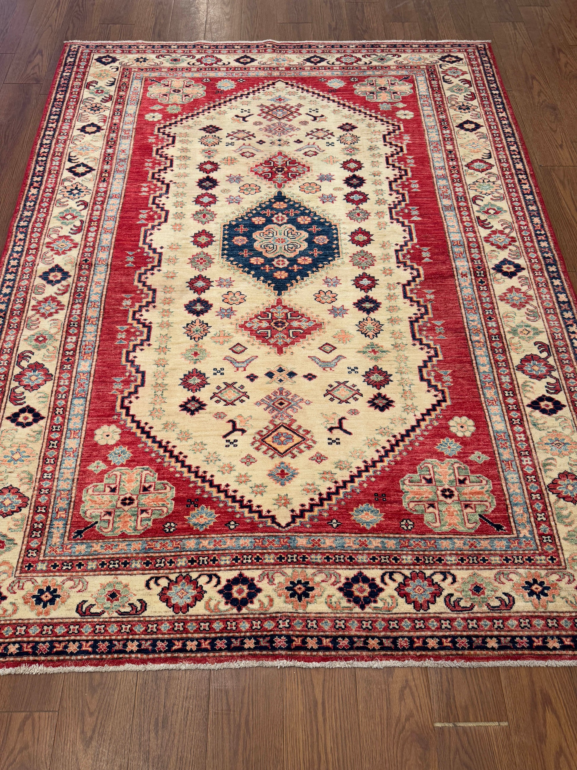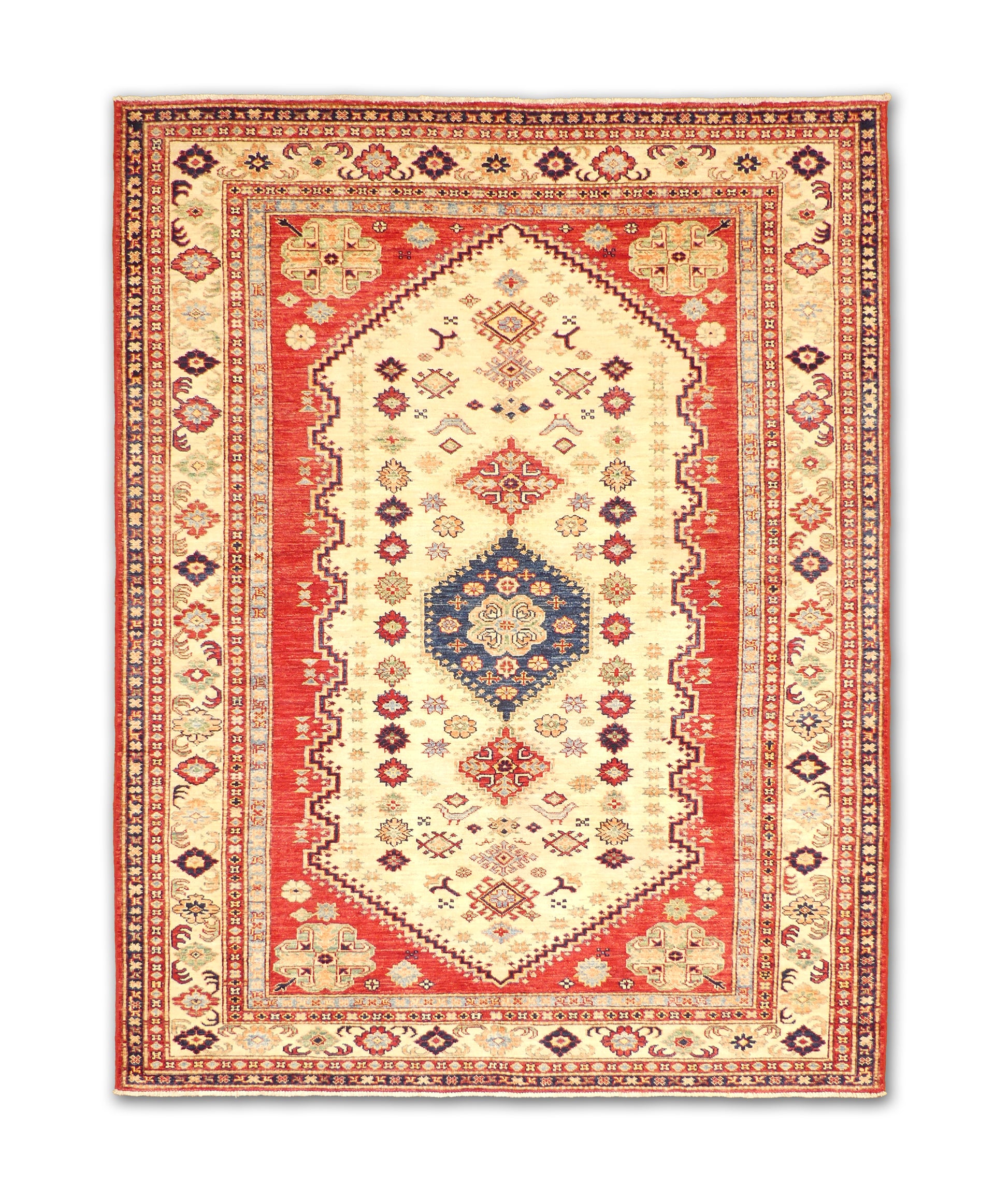 This handwoven rug features an elongated ivory hexagonal field with a striking navy medallion at its center, framed by smaller geometric motifs in red and soft blue. The stepped edges in bold red create strong contrast, while the corners are decorated with stylized cross-like elements that add character and balance. The detailed floral border completes the composition, giving the rug both symmetry and warmth. Made from fine wool, it is both durable and visually compelling, ideal for traditional or eclectic interiors.