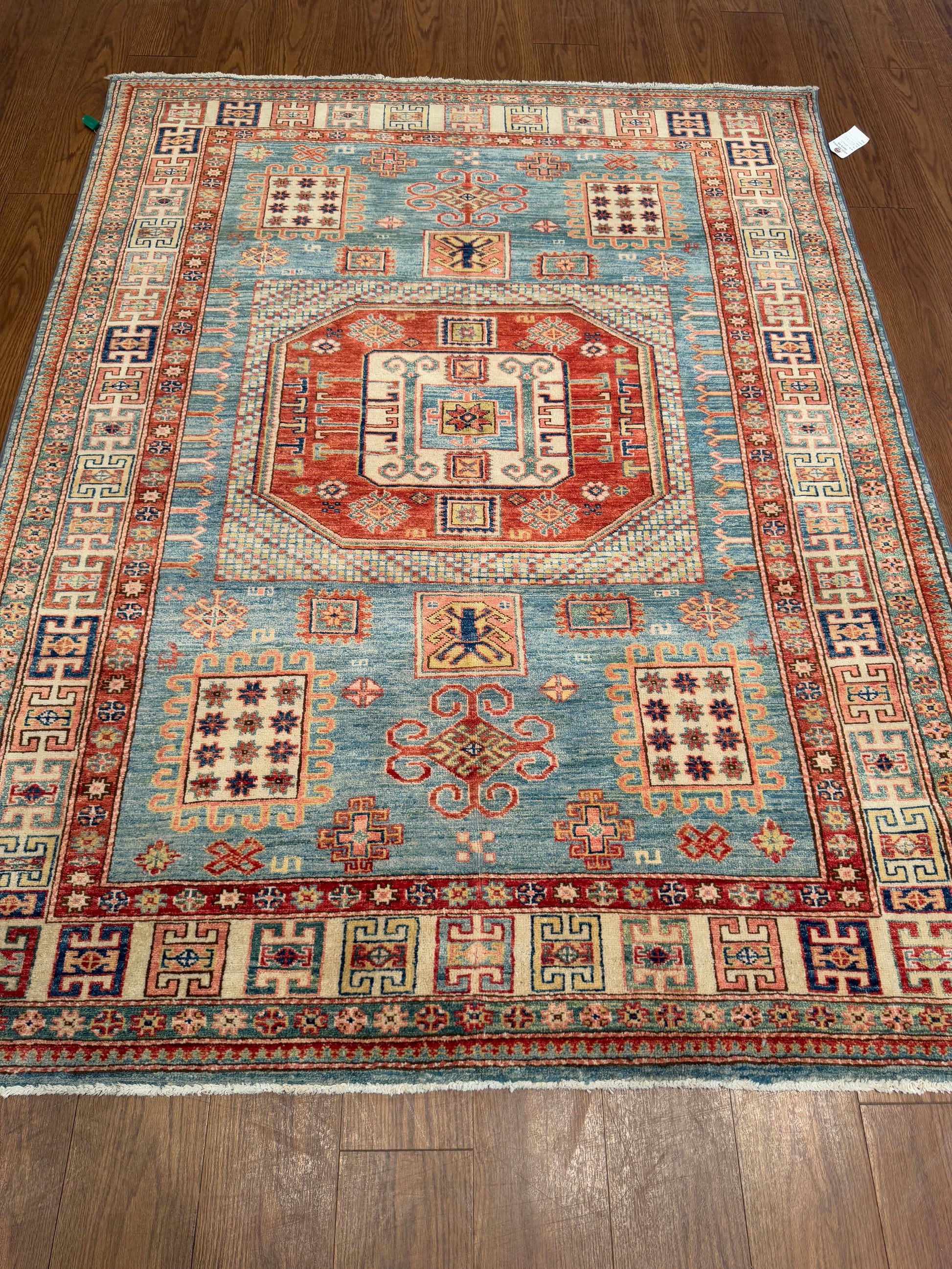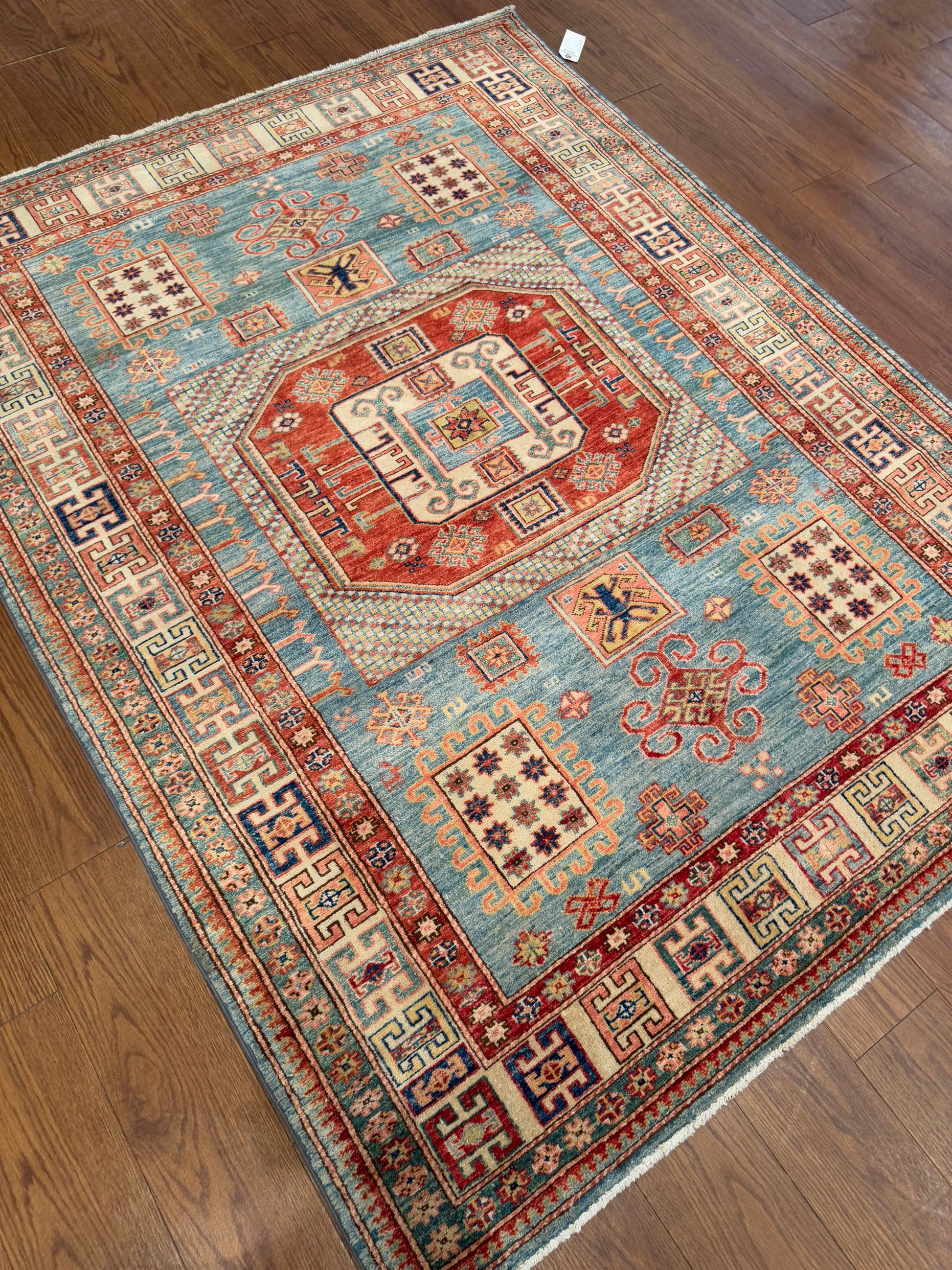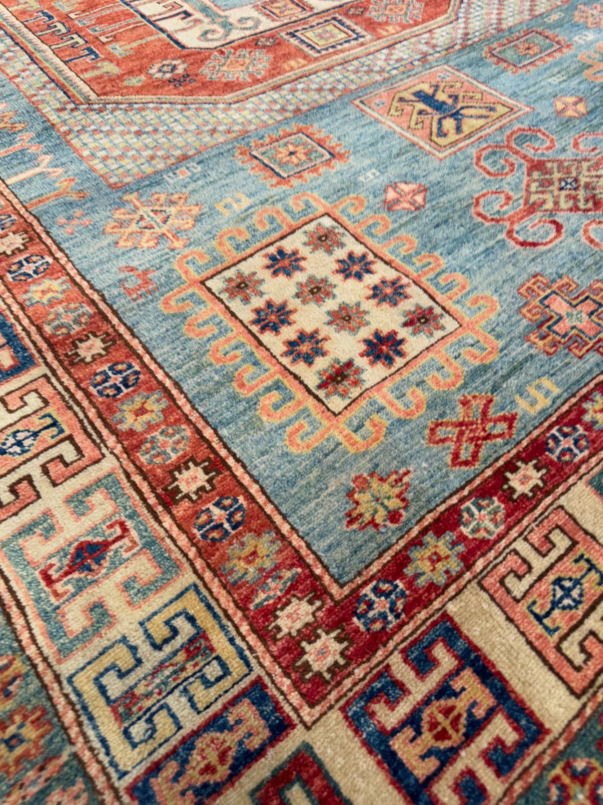 This rug features a striking geometric composition with a large octagonal medallion at the center, framed by smaller latch-hook motifs and angular ornaments. The light blue field sets a calm backdrop, contrasted with warm red and ivory accents. The intricate borders are filled with meandering geometric patterns, giving the piece both rhythm and structure. This design embodies bold symmetry, timeless geometry, and the tribal artistry of the Caucasus region.
