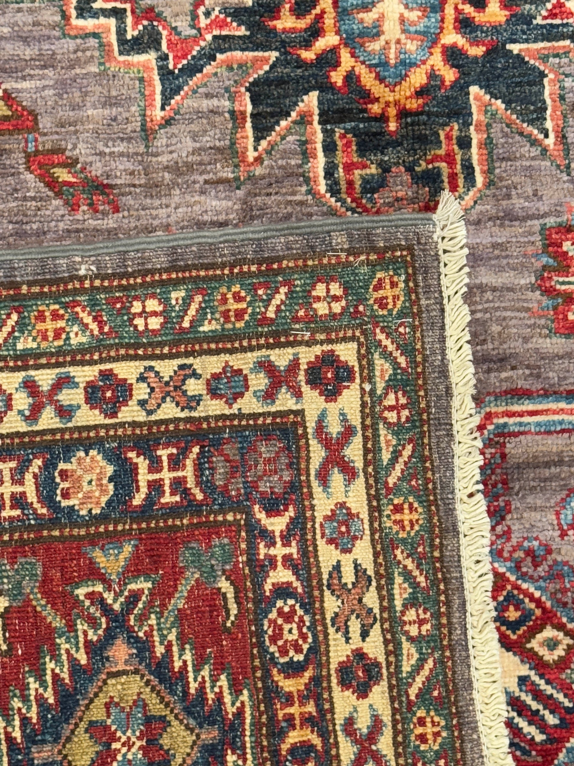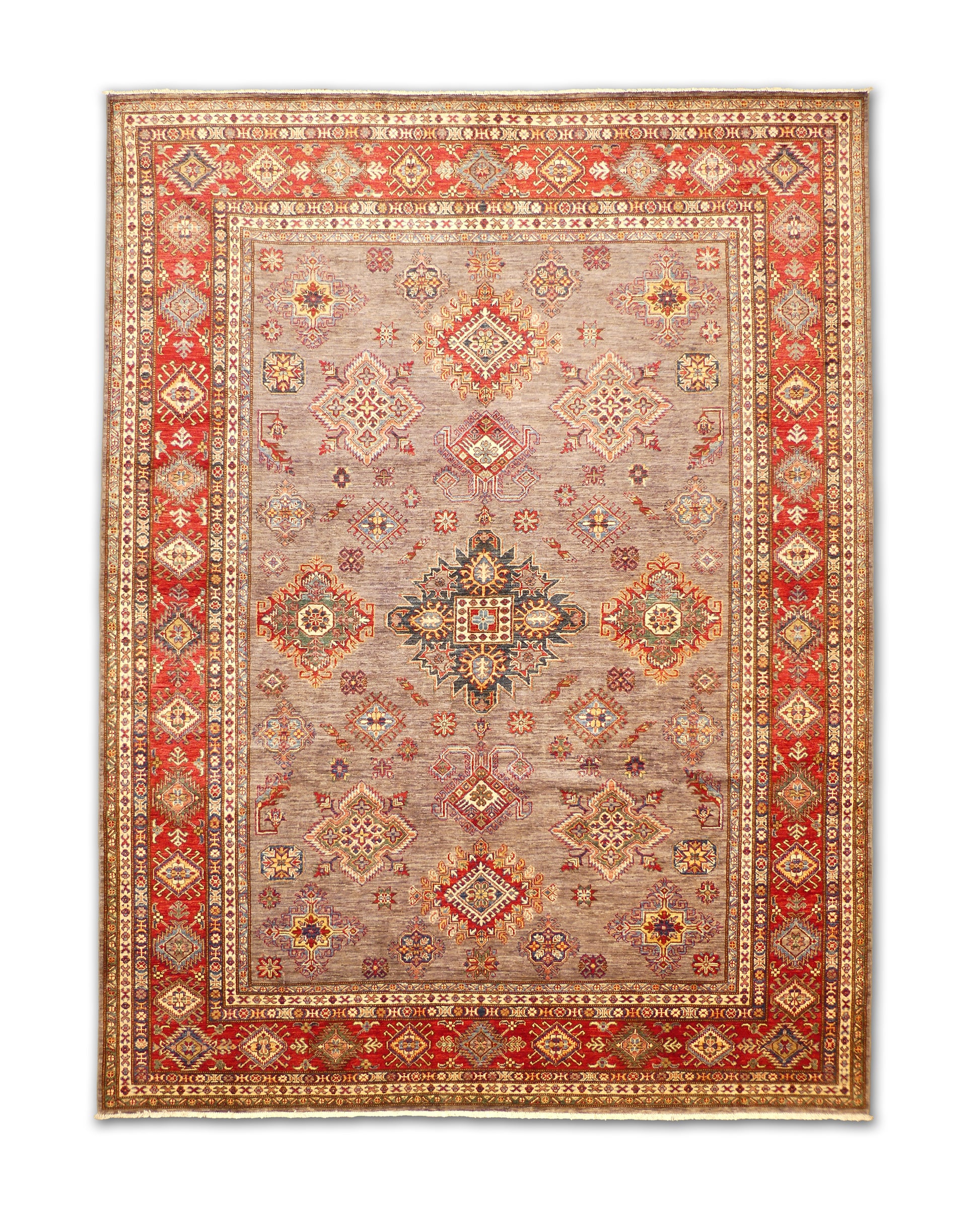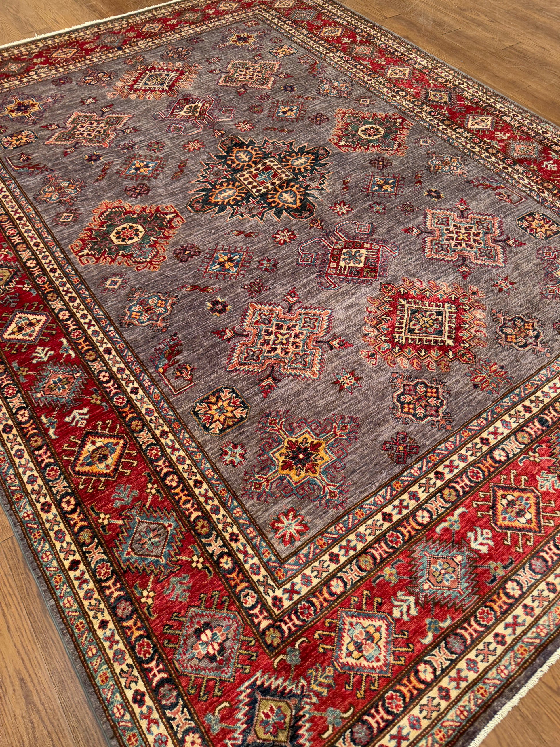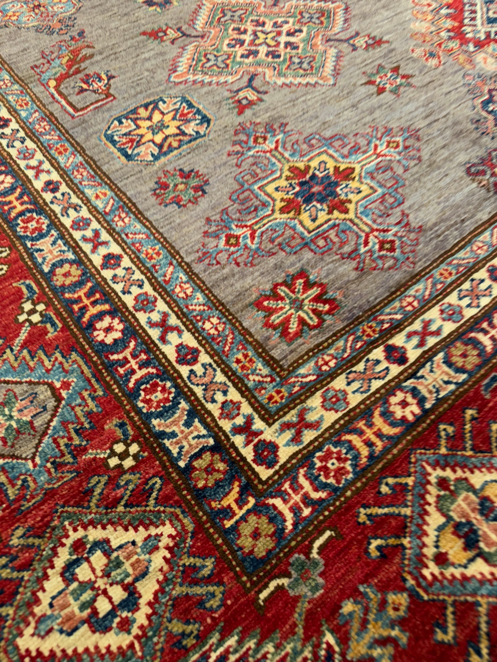 This handmade rug features a captivating blend of geometric medallions and tribal motifs set against a soft gray field. Its intricate details in shades of red, navy, ivory, and teal create a rich visual rhythm framed by a bold red border that enhances the rug’s depth and character. The balance between muted background tones and vibrant patterning gives it a refined yet inviting aesthetic—perfect for bringing warmth and texture to any room.