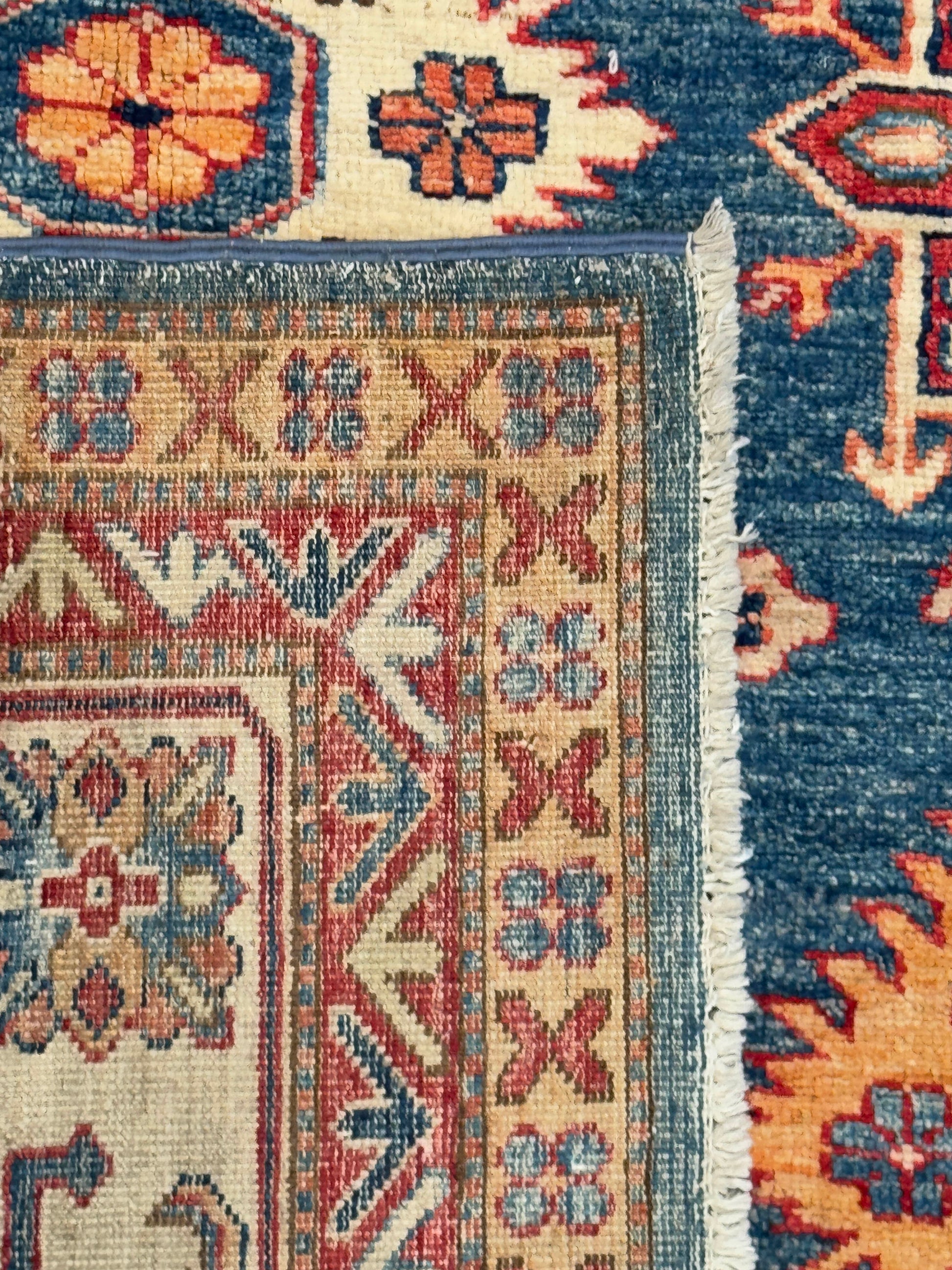 This rug features a bold lattice of diamond medallions across a striking blue field, each filled with stylized floral rosettes and geometric motifs in warm tones of red, ivory, and gold. The ivory main border showcases angular vine work and abstract figures, framed by narrower guard borders with repeating geometric accents. Its high-contrast palette and strong symmetry make it a standout piece that brings both energy and tradition to any interior.