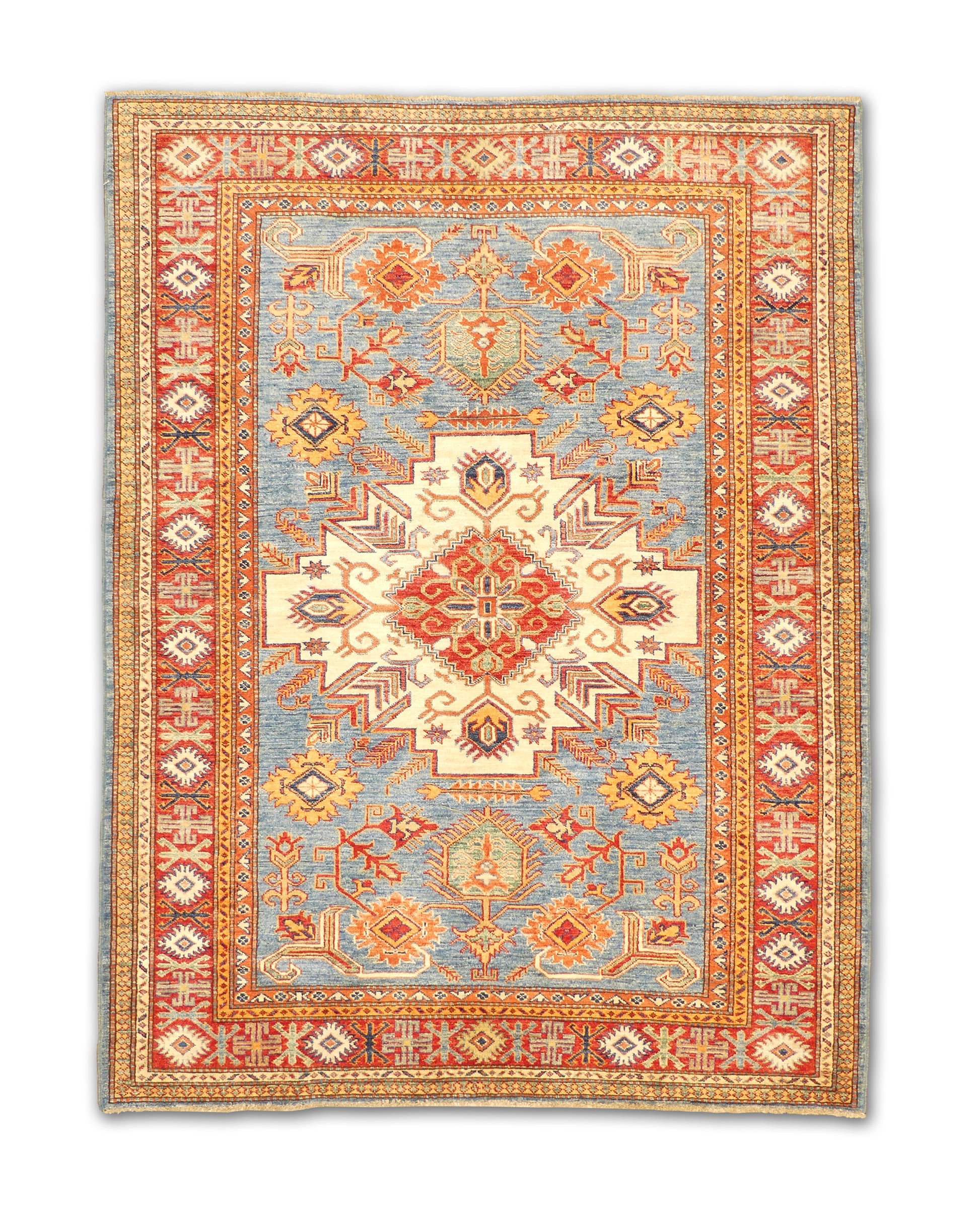 This rug displays a commanding central ivory medallion with radiating geometric floral motifs, framed against a sky-blue field adorned with stylized rosettes and angular branching forms. The vivid red border carries repeating hooked motifs and diamond elements, balanced by ivory guard borders featuring intricate geometric accents. Its combination of bold medallion work, saturated colors, and crisp geometry lends it both strength and elegance.