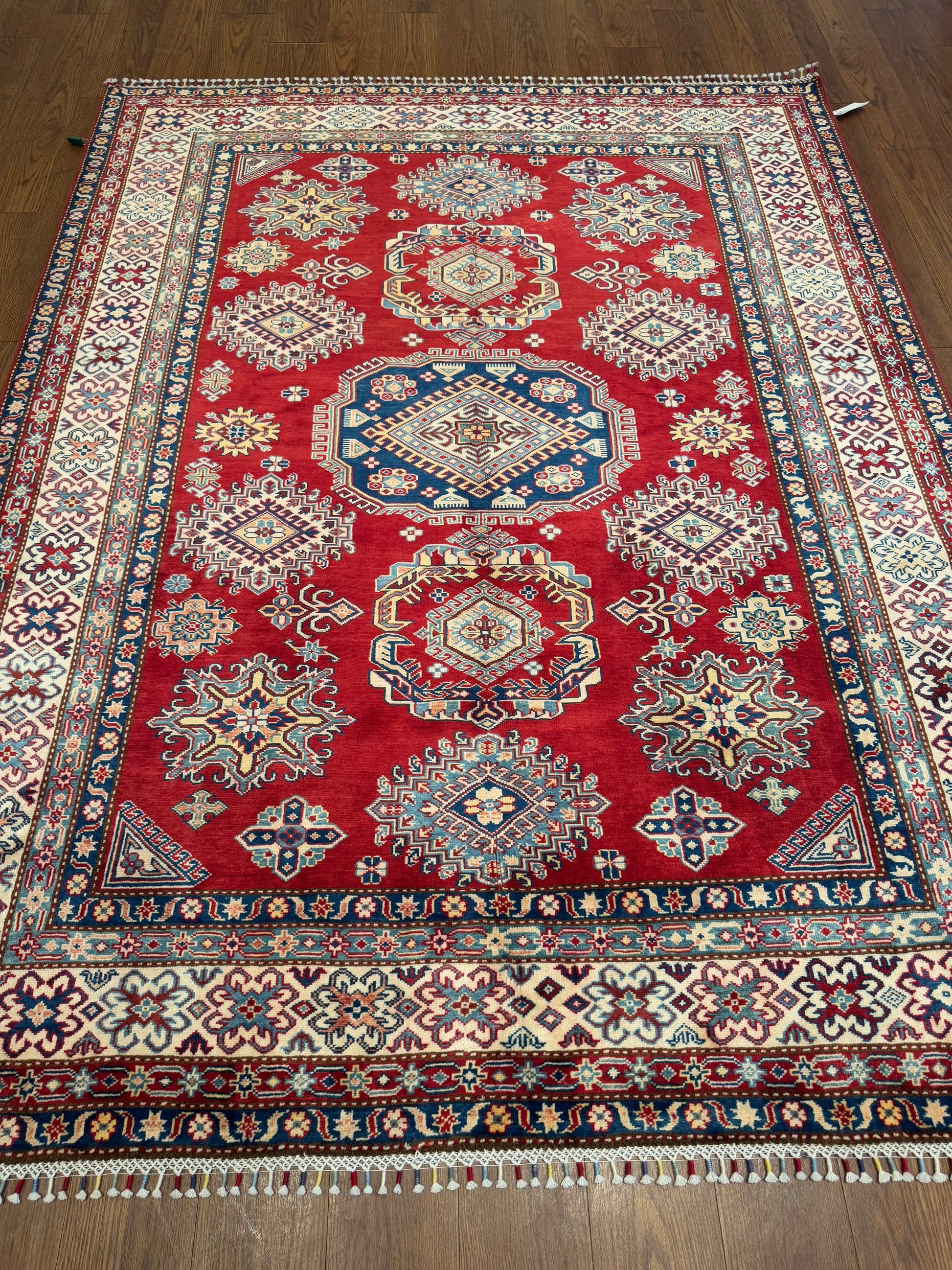 This rug features a rich red field decorated with a series of bold central medallions in navy, ivory, and gold, each surrounded by finely detailed geometric motifs. The medallions vary in form, from octagonal and diamond-shaped to star-like, adding dynamic rhythm across the field. The ivory border is filled with stylized rosettes, hooked motifs, and cross designs, creating a strong frame around the central composition. The balance of deep jewel tones with crisp ivory accents gives the rug a luminous, high-contrast appearance. Its geometric order and symbolic motifs reflect both artistry and cultural heritage.