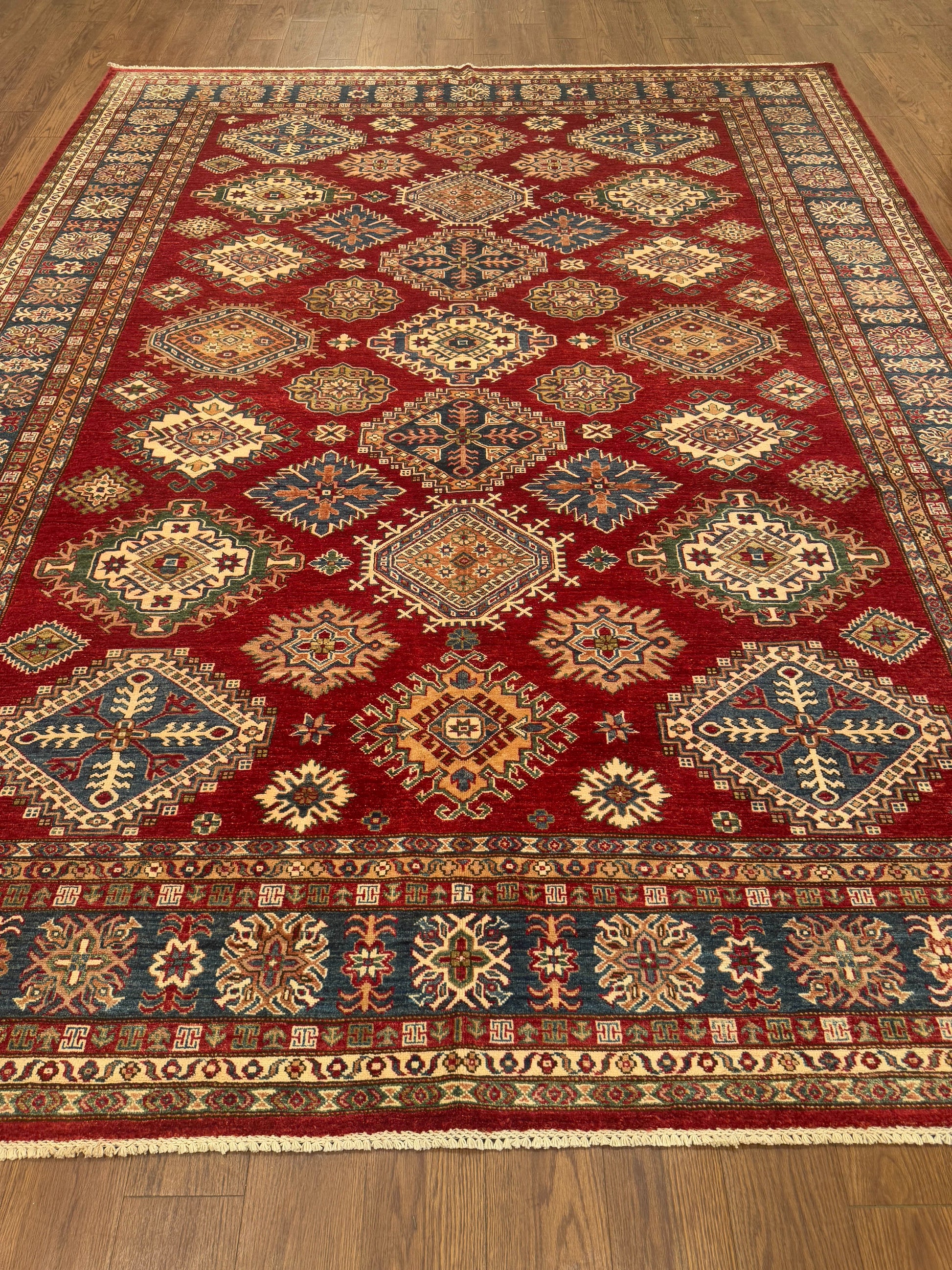 This handmade rug displays a stunning arrangement of diamond medallions across a deep red background, accented by intricate geometric and floral motifs. Shades of ivory, navy, gold, and sage green bring vibrancy and depth, while the border’s layered detailing enhances its timeless appeal. The bold yet balanced composition makes this piece an elegant focal point for any interior.