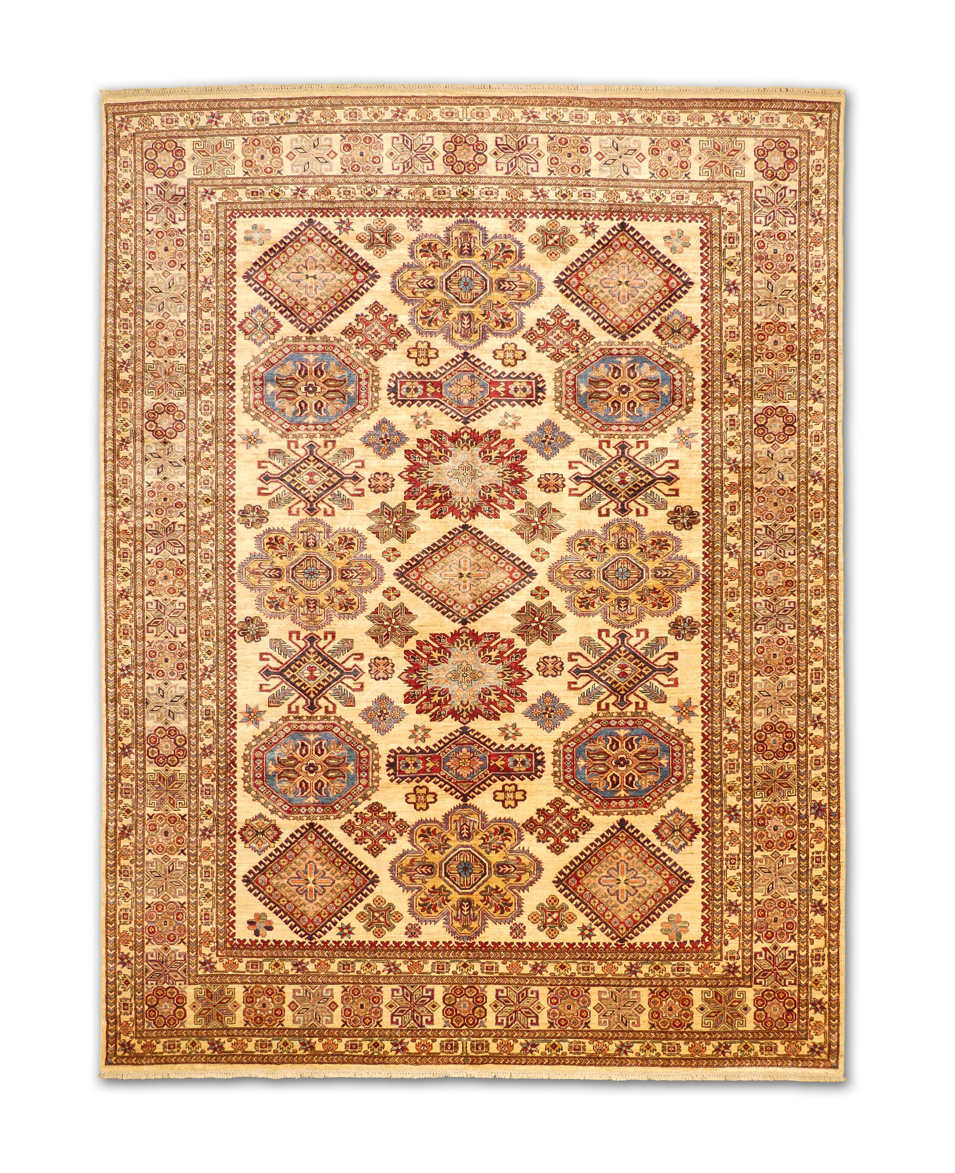 This handmade rug presents an exquisite display of geometric medallions on a warm ivory backdrop, each motif intricately detailed with layers of red, blue, gold, and soft green. The delicate symmetry and finely balanced color palette create a sense of both vibrancy and harmony. Its refined border enhances the structure and artistry, making this piece ideal for elegant interiors seeking warmth and sophistication.