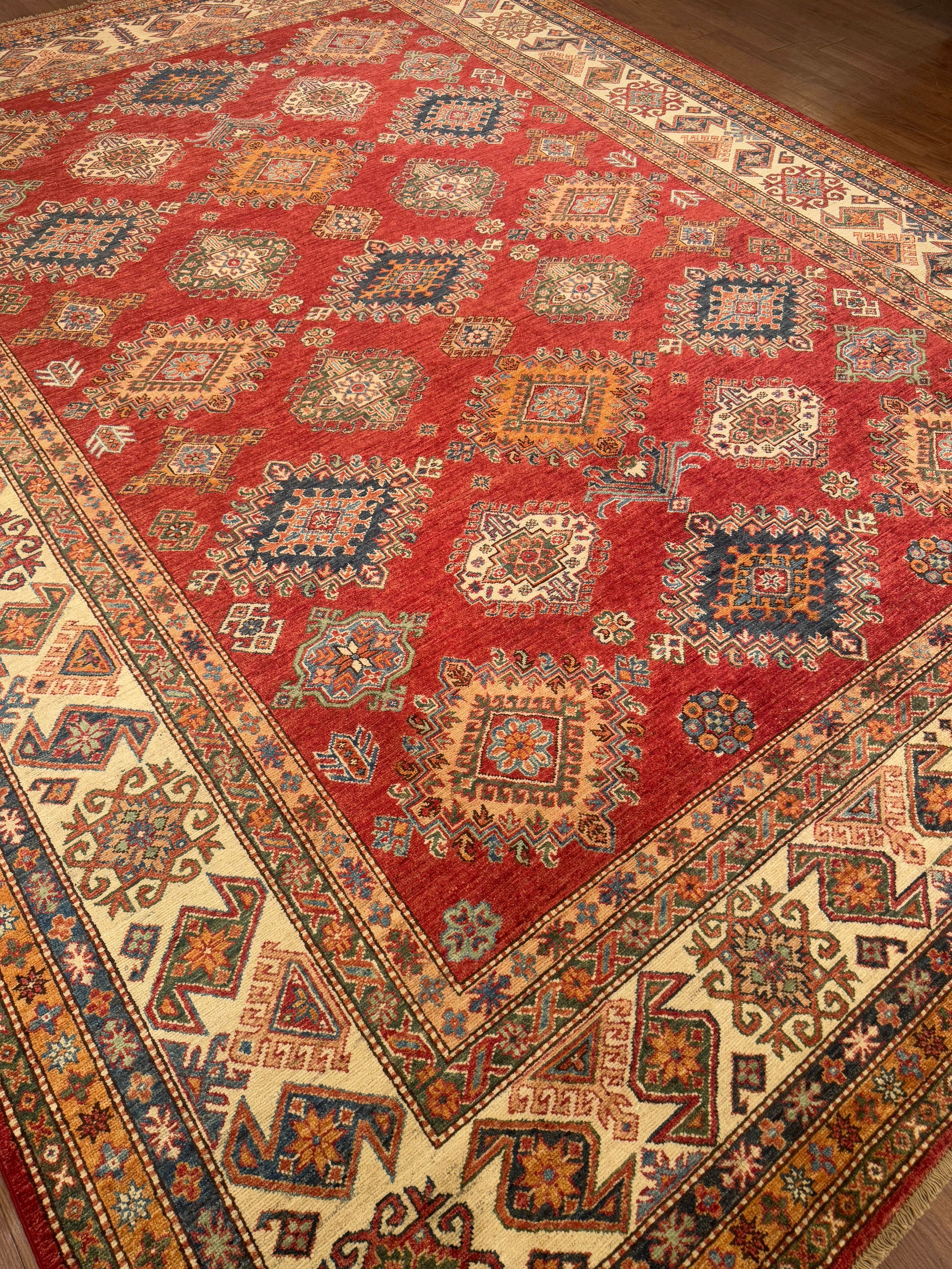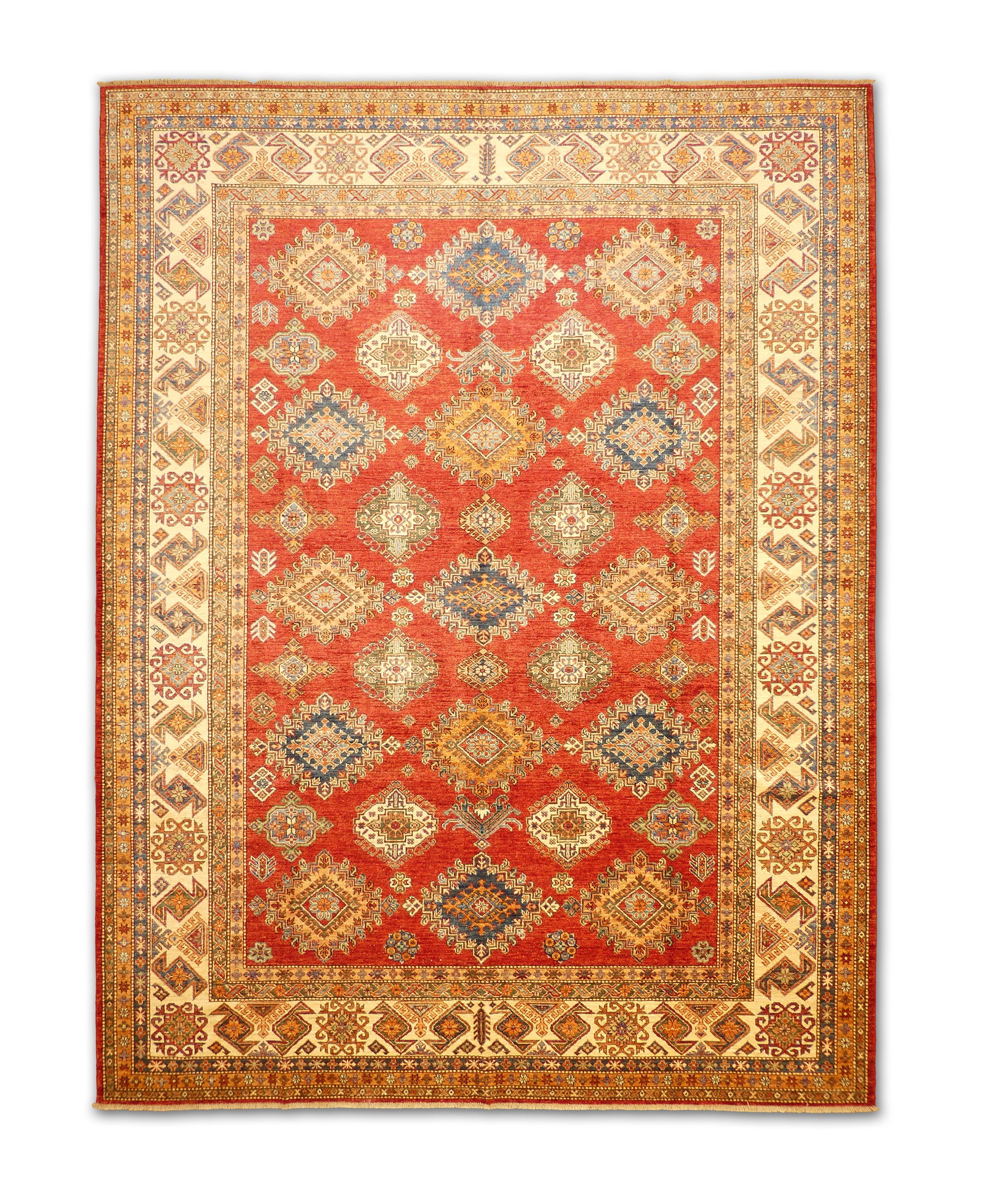 This handmade rug features a vibrant composition of diamond medallions woven across a rich red field, framed by detailed borders in ivory and gold. Accents of blue, green, and orange lend dynamic contrast while preserving a sense of symmetry and balance. Each motif reflects traditional artistry and timeless craftsmanship, creating a rug that brings warmth and character to any room.