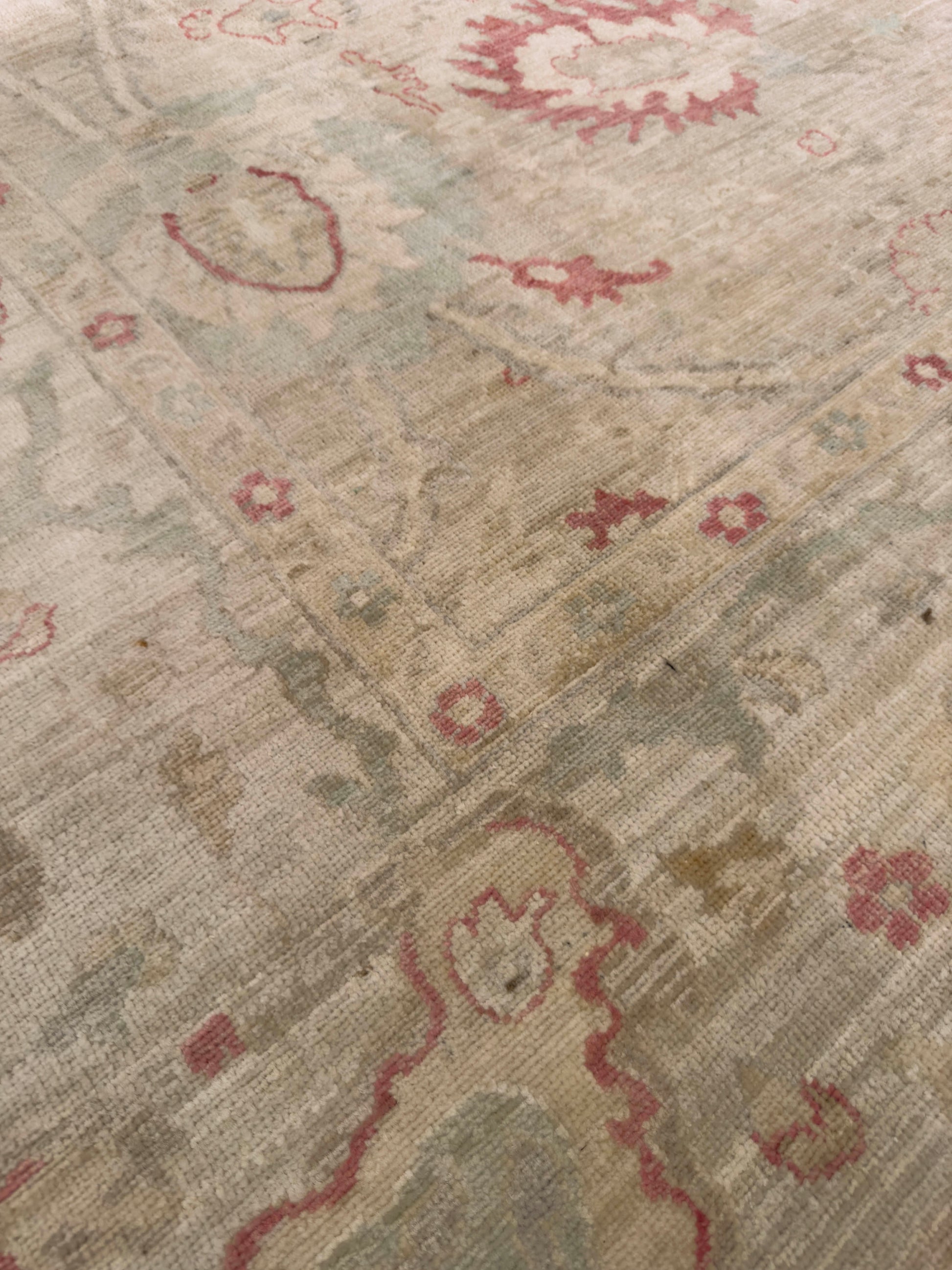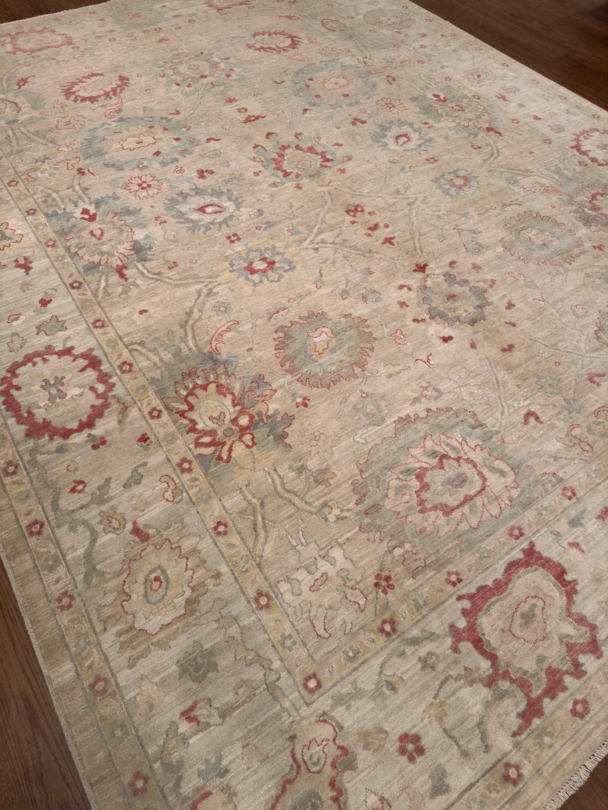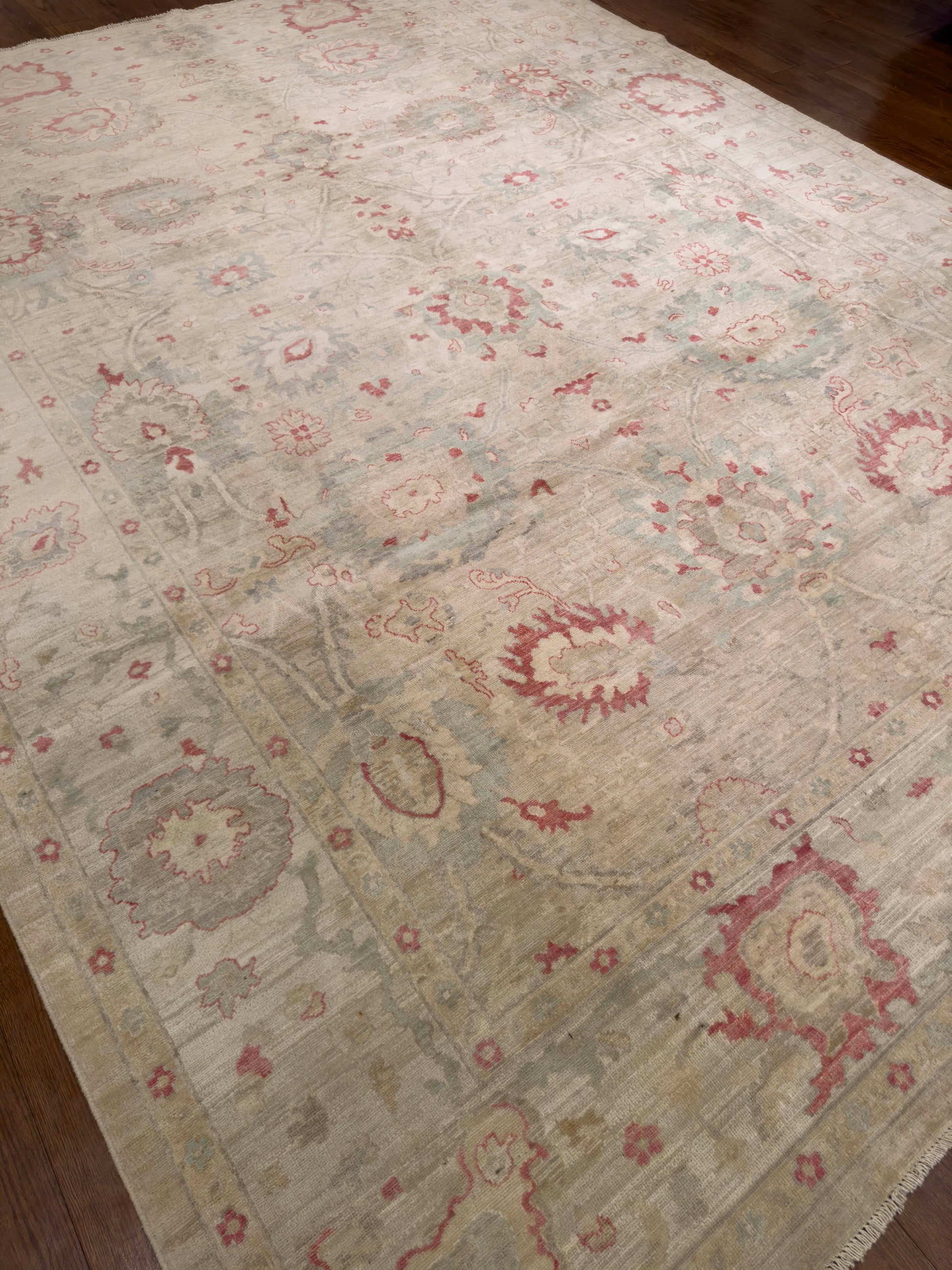 - Design: Symmetrical floral and palmette pattern with soft border detailing