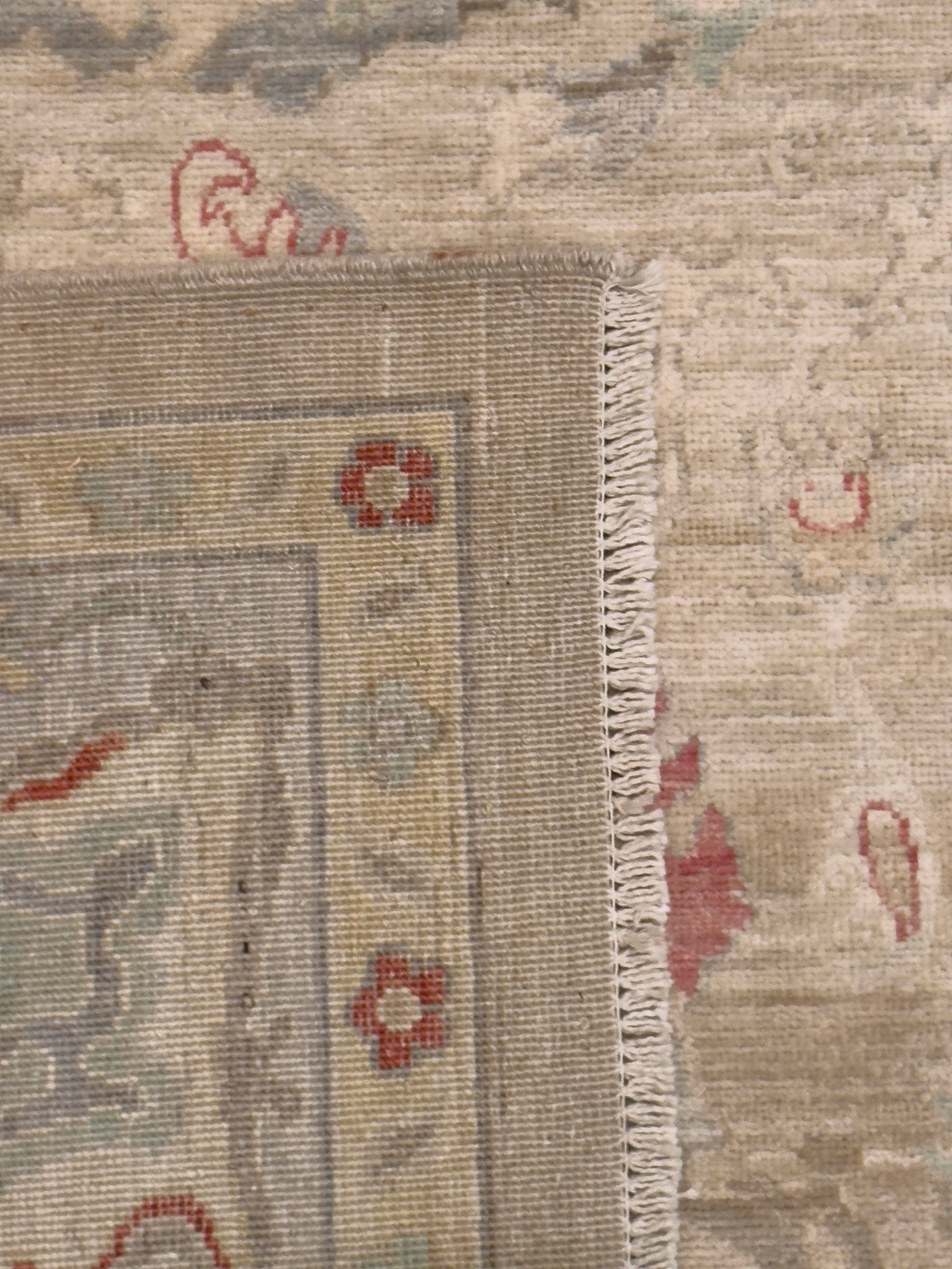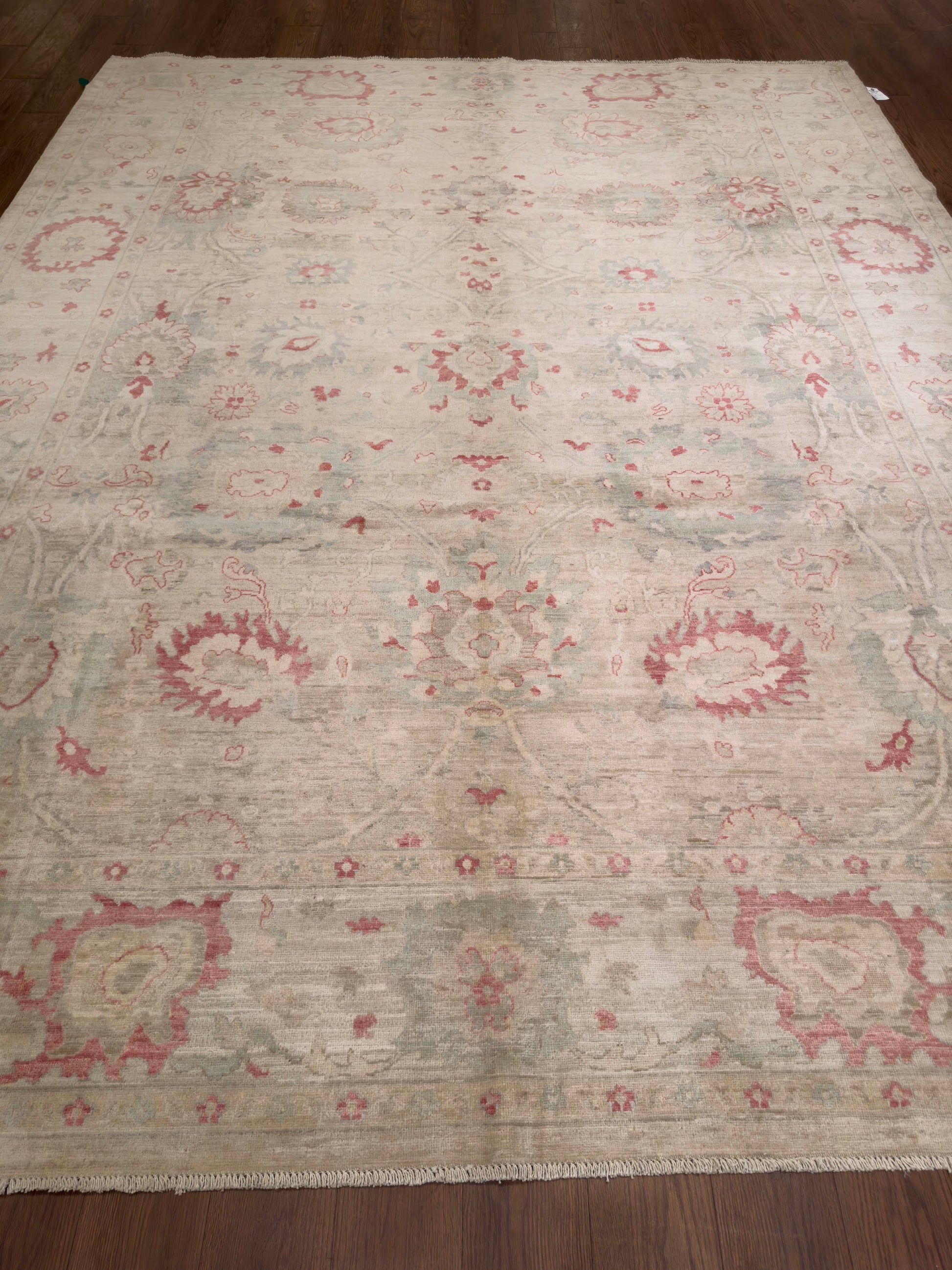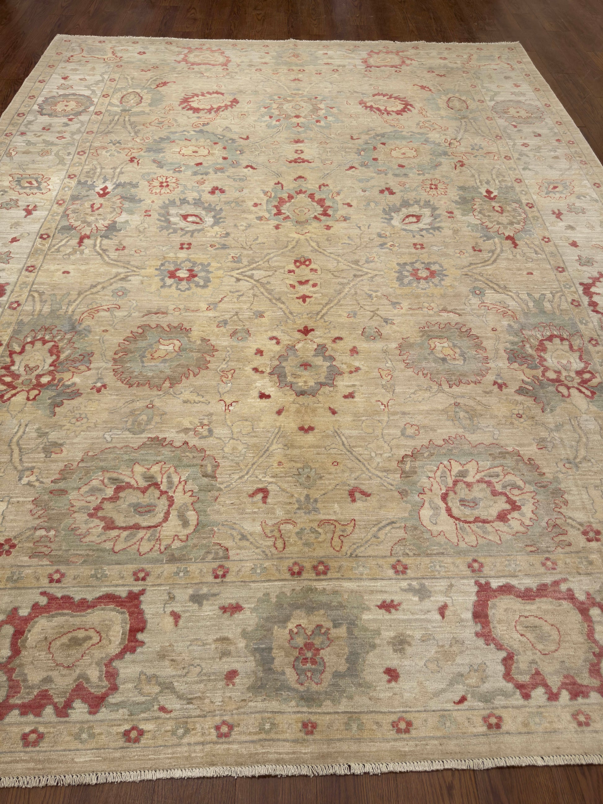 - Design: Symmetrical floral and palmette pattern with soft border detailing