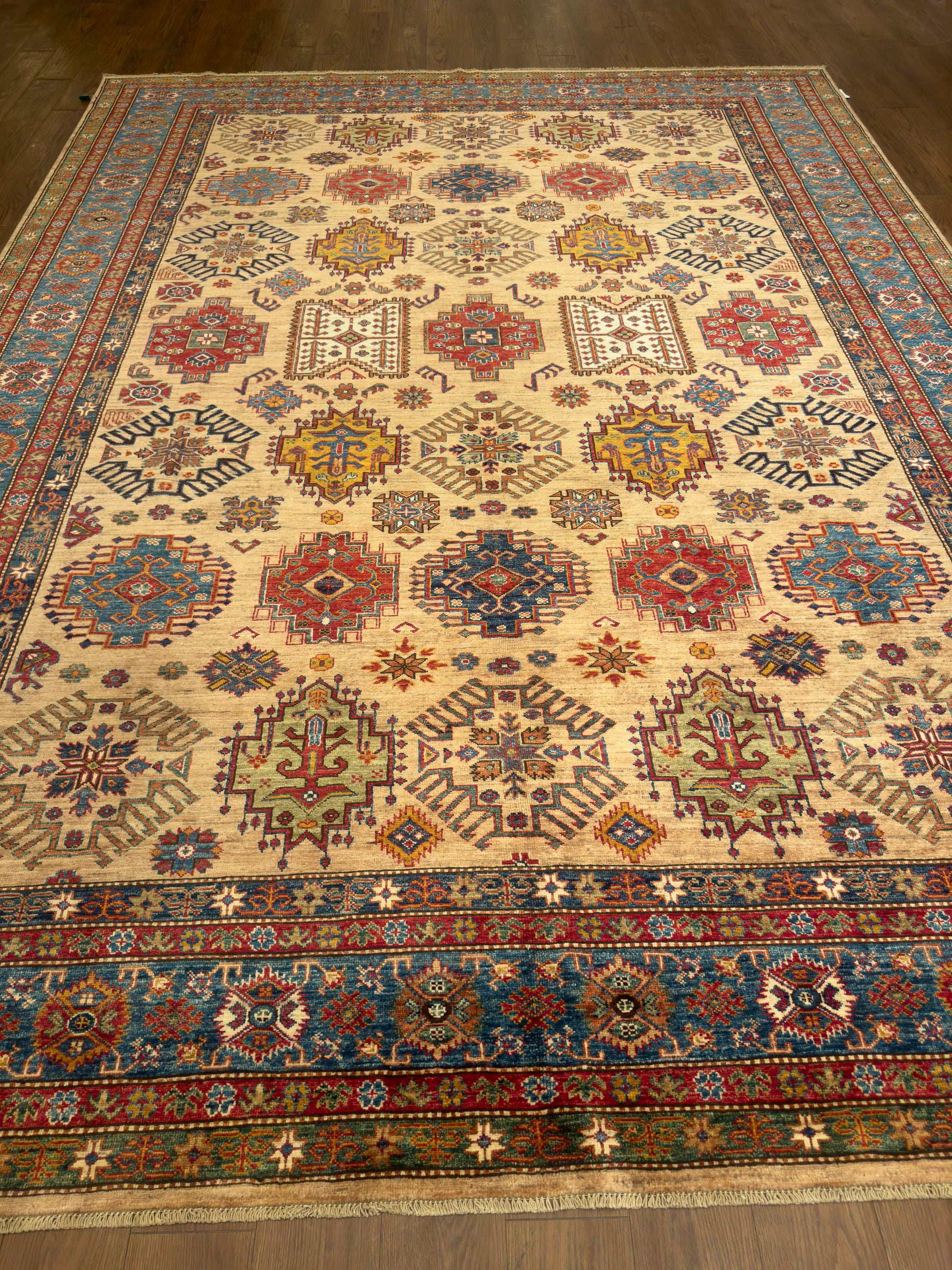 This handmade rug presents a stunning geometric field adorned with medallions and tribal motifs in warm, earthy hues. The ivory background provides a soft contrast to vivid tones of red, blue, gold, and green, creating a lively yet balanced aesthetic. Fine detailing and crisp symmetry give it an elegant tribal character that bridges classic craftsmanship with modern versatility, ideal for bright, open interiors.