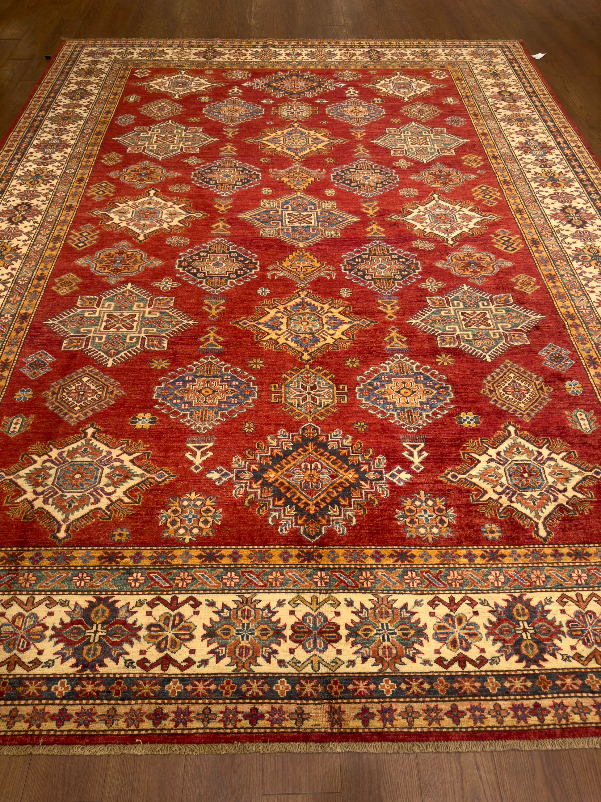 This handmade rug displays a vibrant array of geometric medallions intricately woven across a rich red background. The combination of gold, ivory, blue, and olive tones creates a balanced and eye-catching composition that radiates warmth and charm. Detailed borders frame the design beautifully, adding structure and depth, making this piece an ideal statement for elegant living areas.