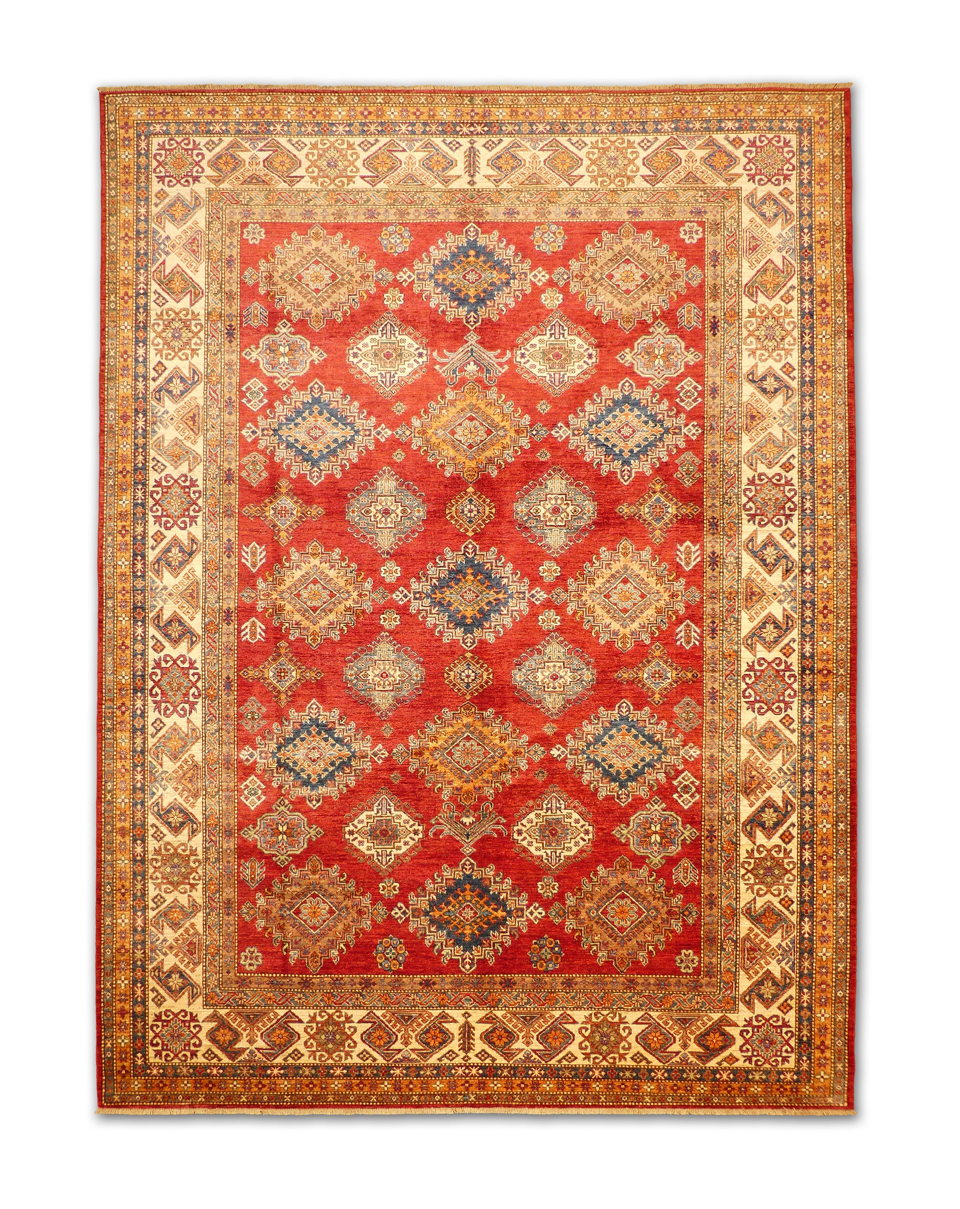 This handmade rug showcases a striking field of diamond medallions set against a deep red background, framed by ivory and multicolor borders with intricate tribal motifs. The palette of navy, rust, gold, and soft blue enhances its bold yet balanced character. The detailed symmetry and warm tones make it ideal for adding richness and depth to classic or transitional interiors.