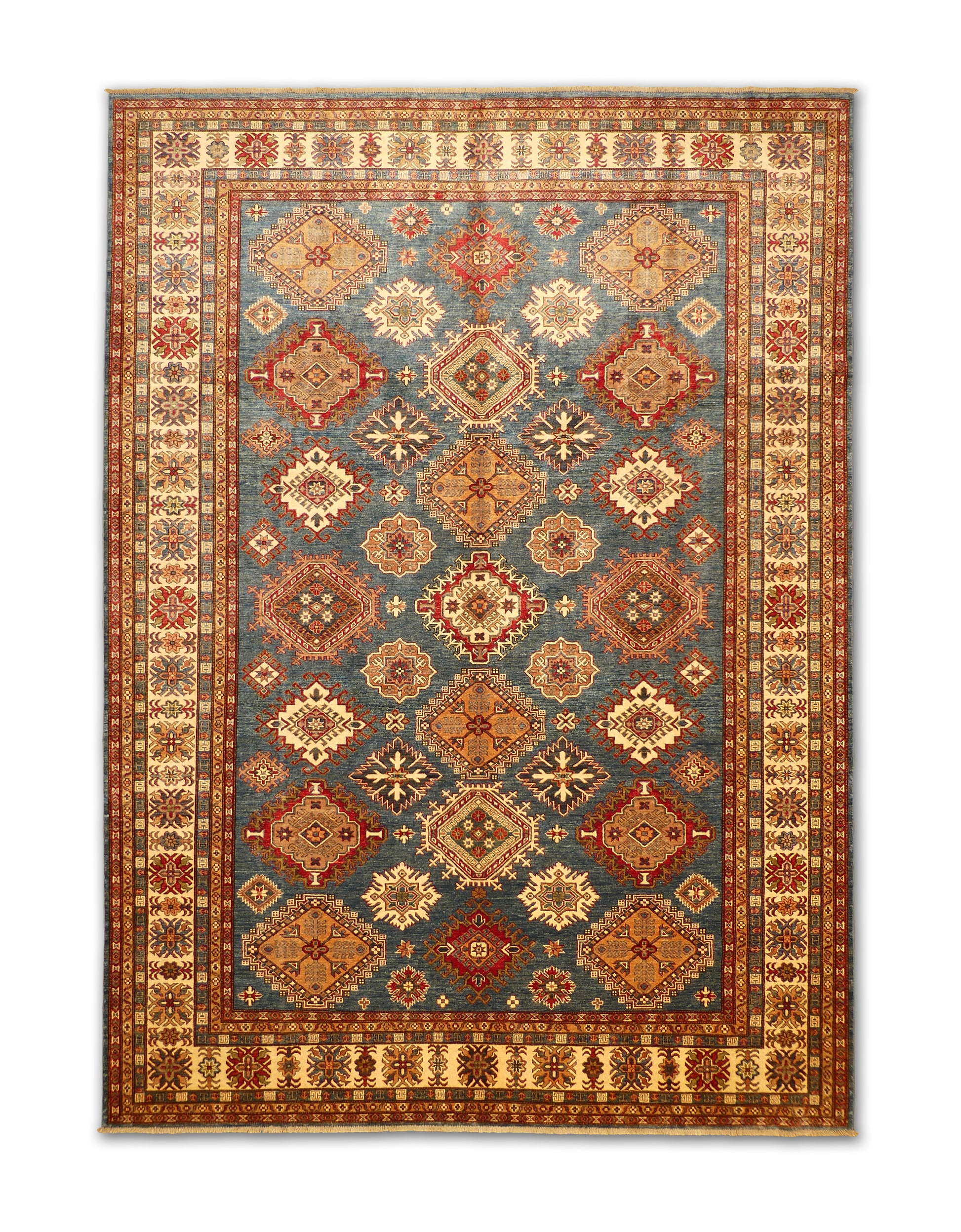 This handmade rug features a mesmerizing array of geometric medallions arranged symmetrically over a deep teal field. Warm accents of ivory, rust, and gold bring each motif to life, while the detailed border adds a refined touch that anchors the overall design. Crafted with rich texture and vibrant dyes, it’s a timeless centerpiece blending tradition with understated luxury.