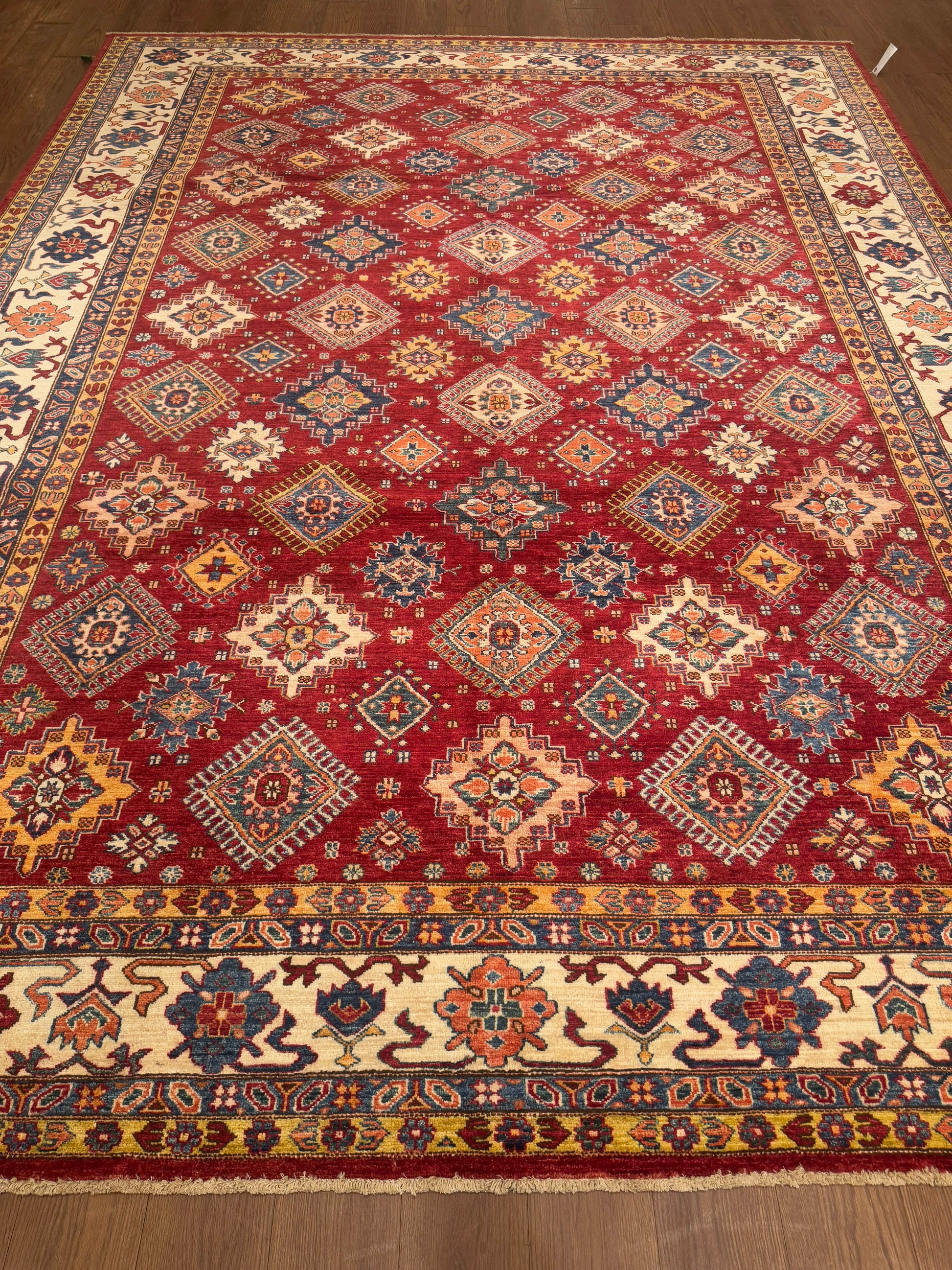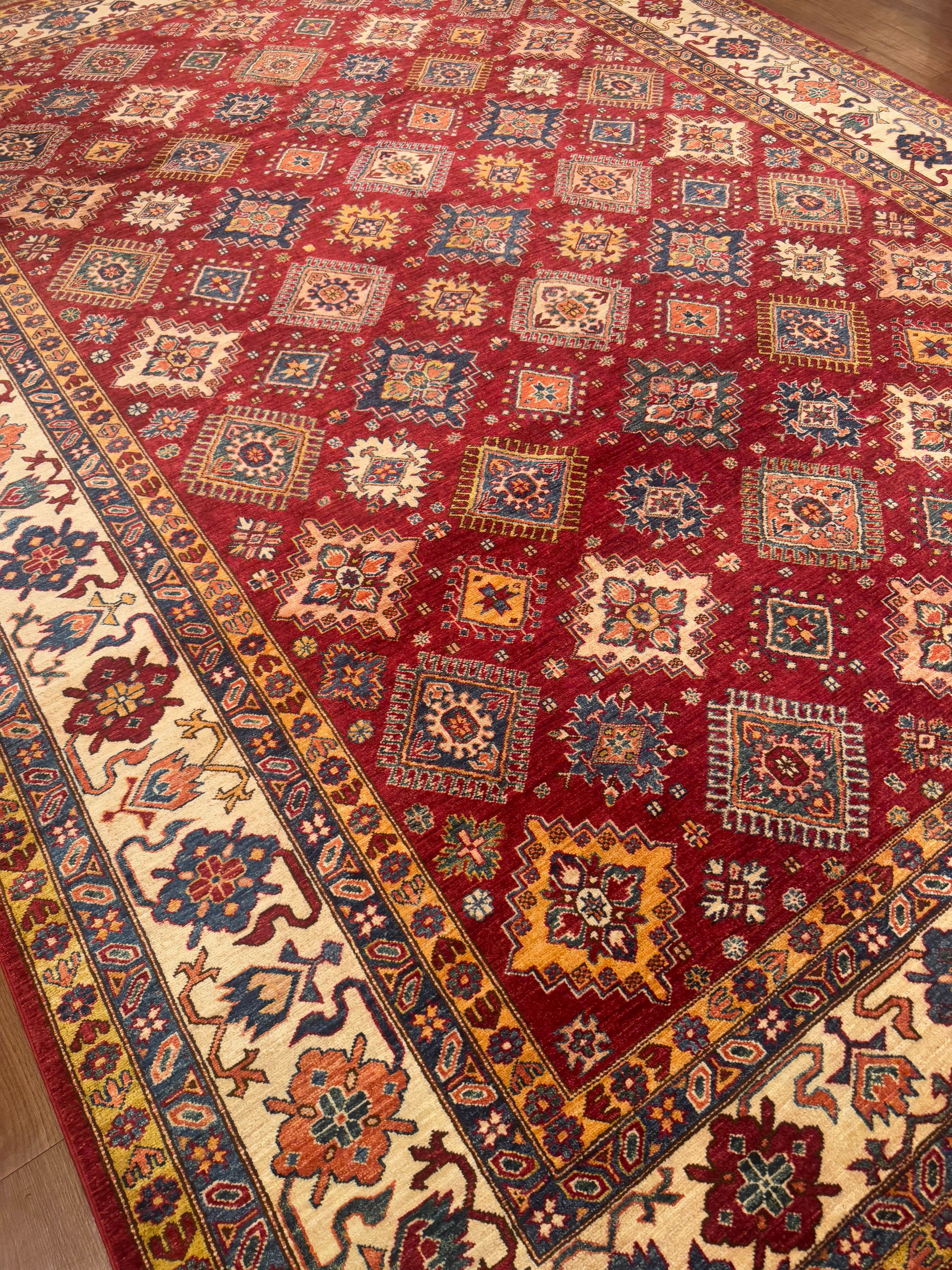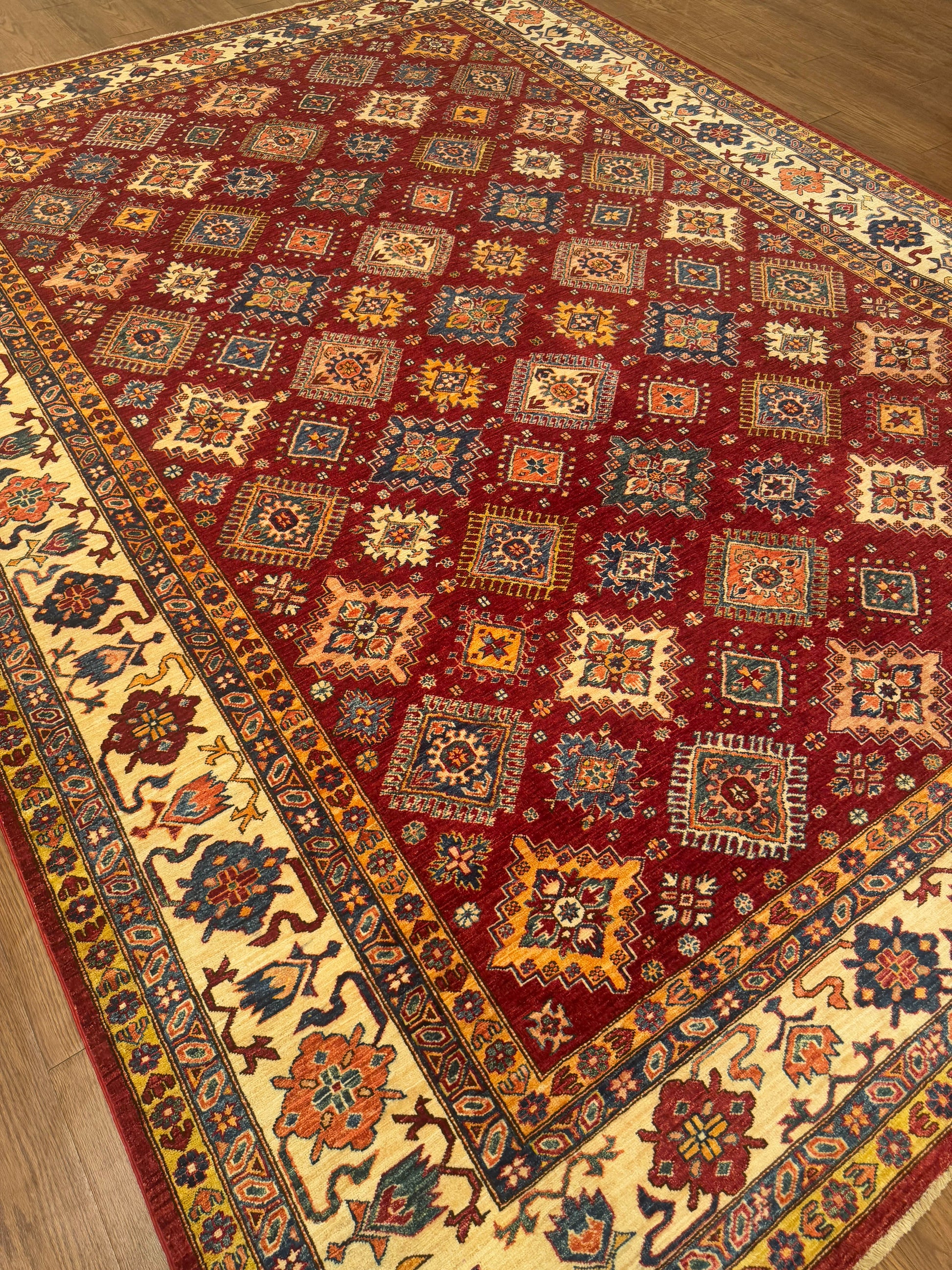 This handmade rug showcases a rich lattice of diamond medallions intricately arranged across a deep red field. The palette of gold, blue, ivory, and rust creates a striking harmony, while the ivory floral border enhances its traditional elegance. The refined geometric balance and warm tones make it a perfect statement piece for both classic and modern interiors.